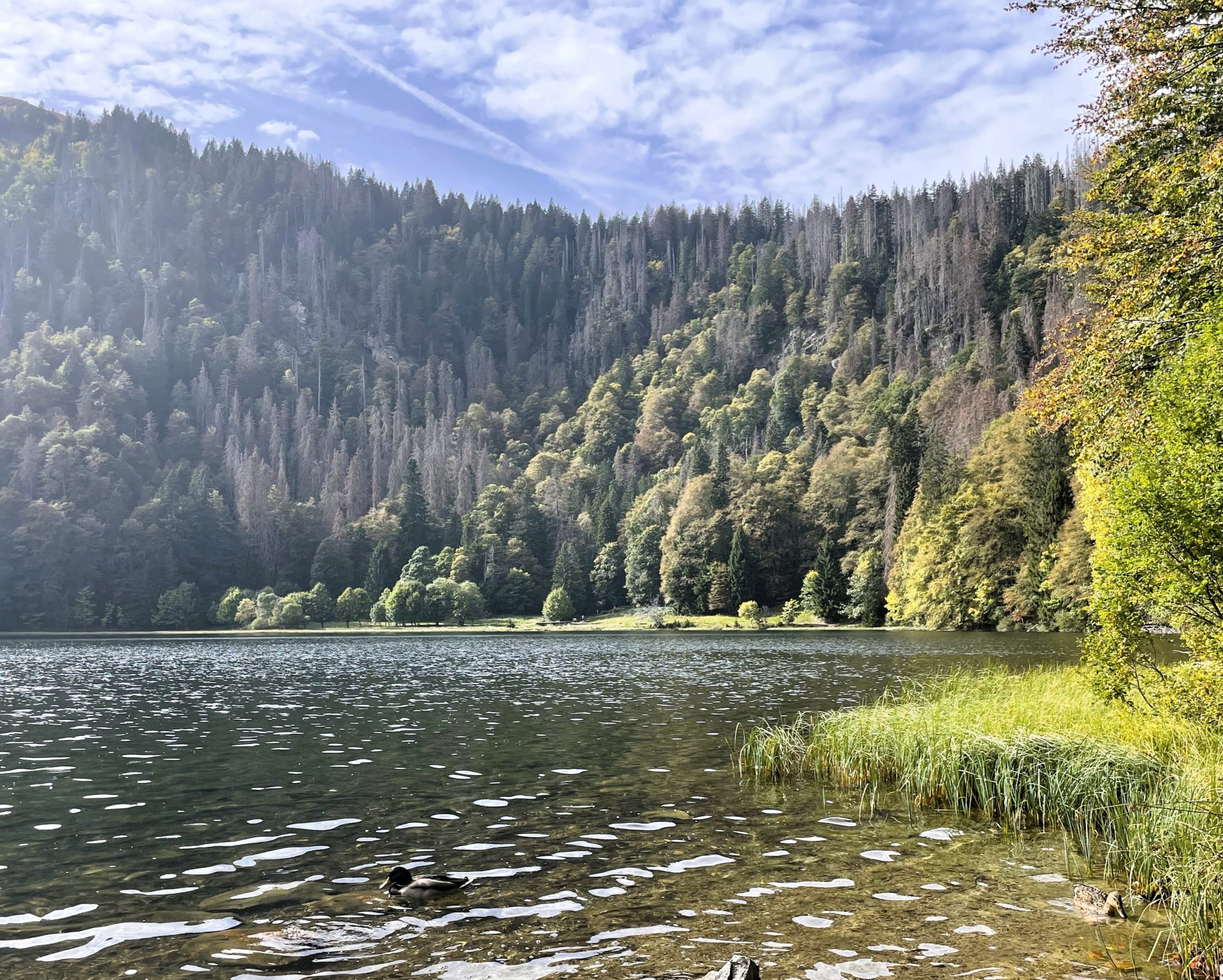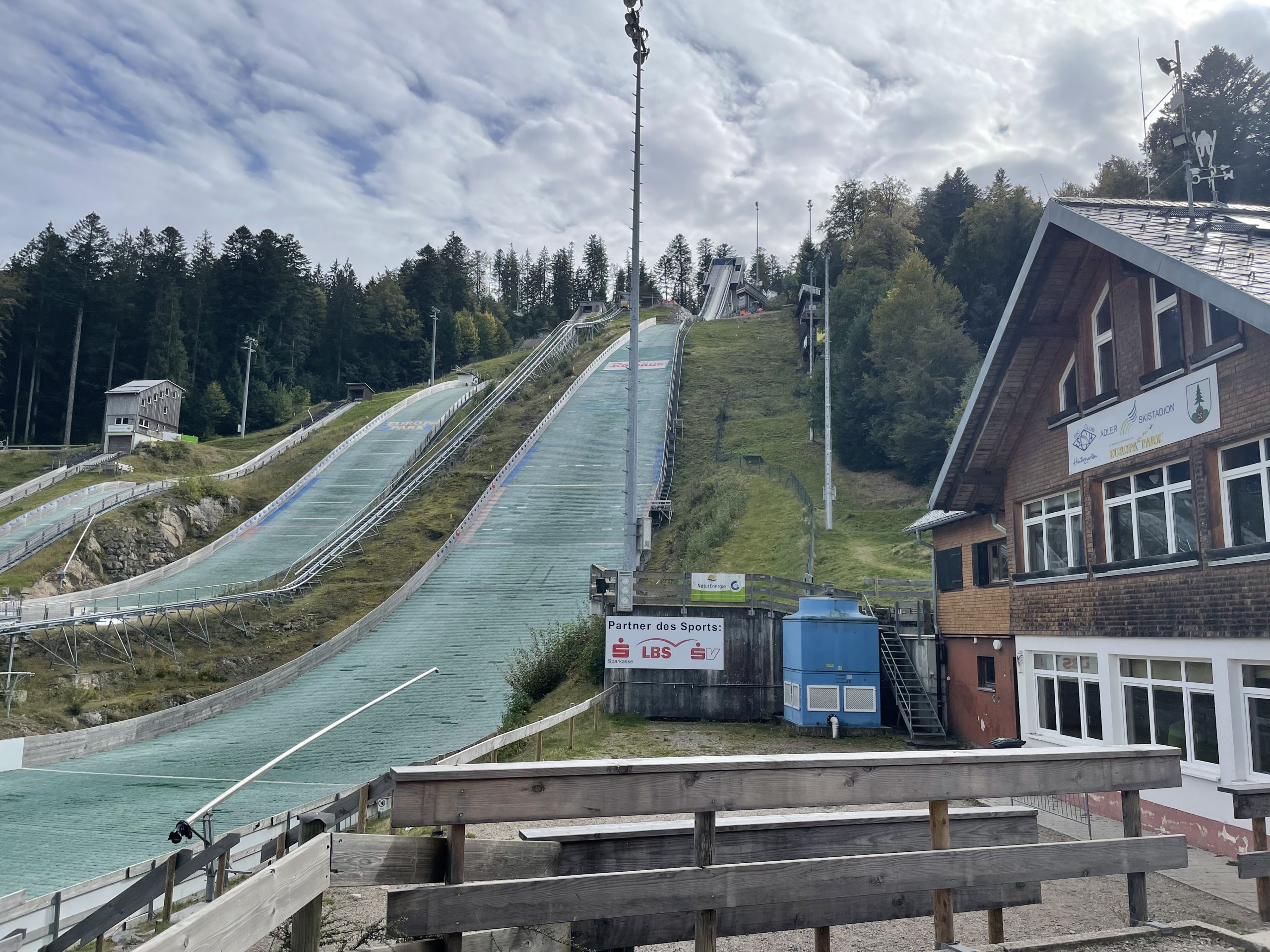 We strolled round the lake one day. The northern edge of the lake is mostly private meaning you need to walk along the road or make a bigger detour out into the countryside, a bit of a shame. The next day we cycled through the forest and passed through some very wealthy seeming villages with vast immaculate bungalows. Our target was Feldsee, a glacial tarn where we saw Arctic Char swimming in the water (we couldn’t swim here because of protected aquatic plants). On the way back we cycled past ski areas and the ski jumps of Adler Ski Stadium.