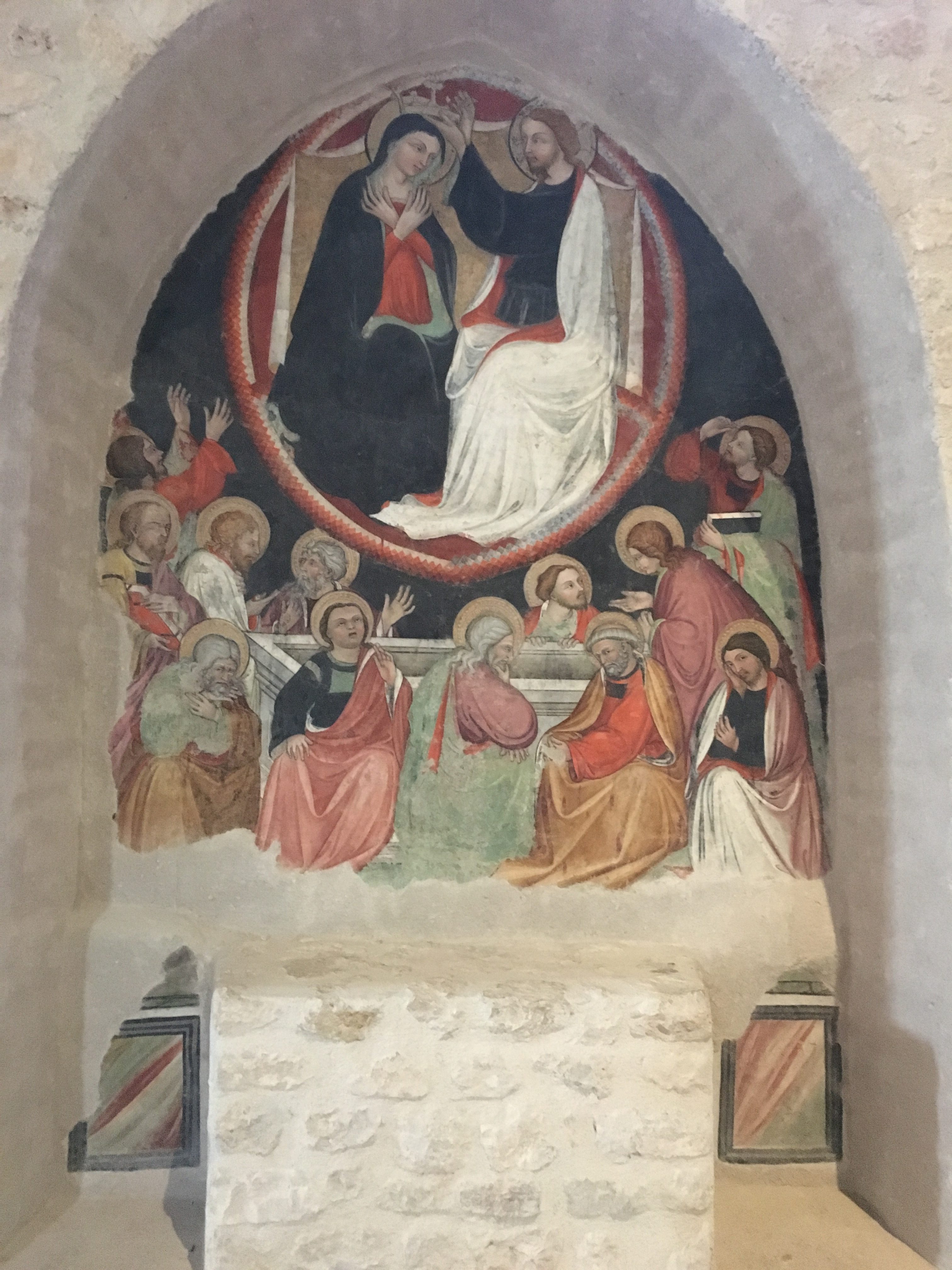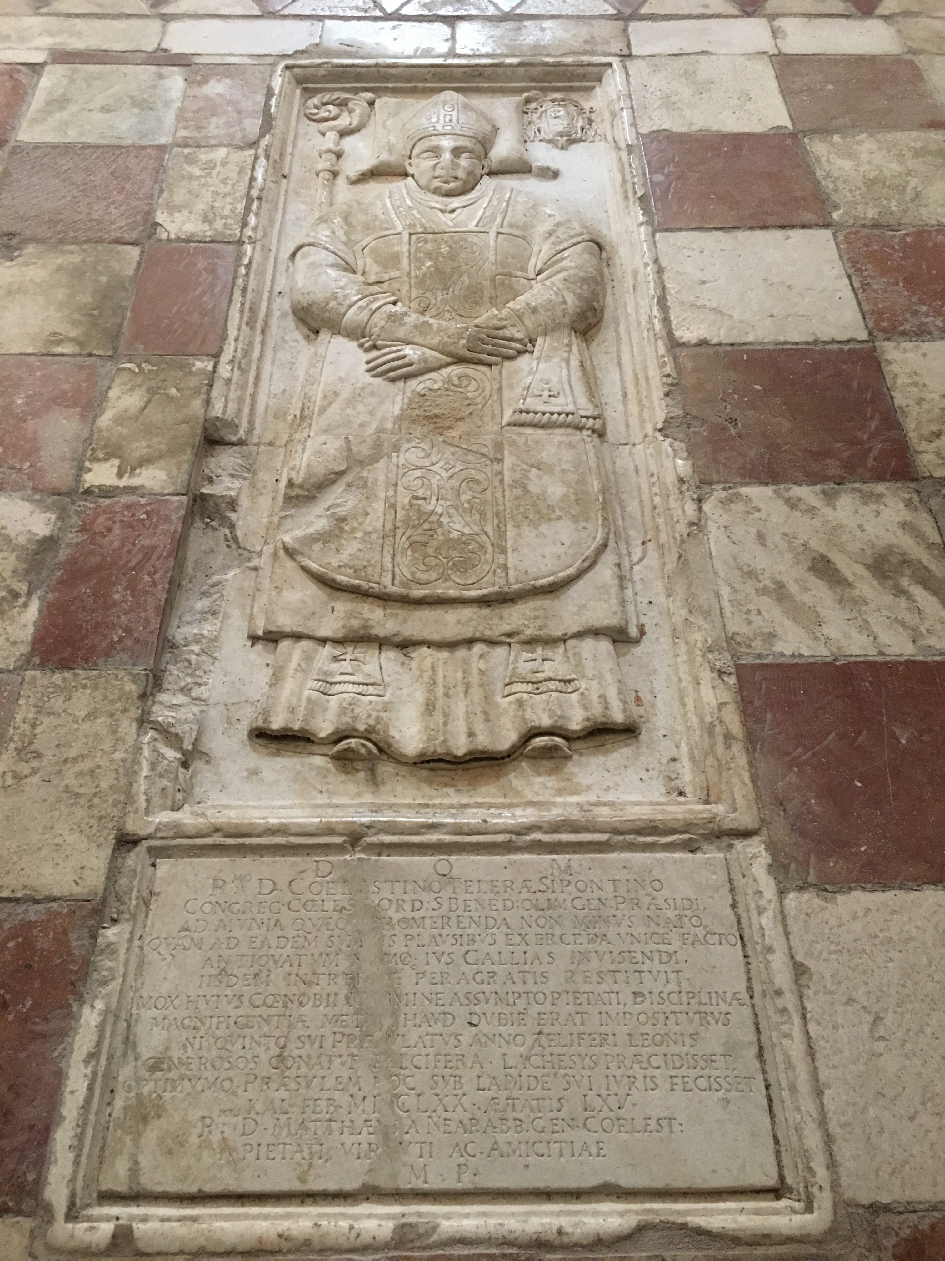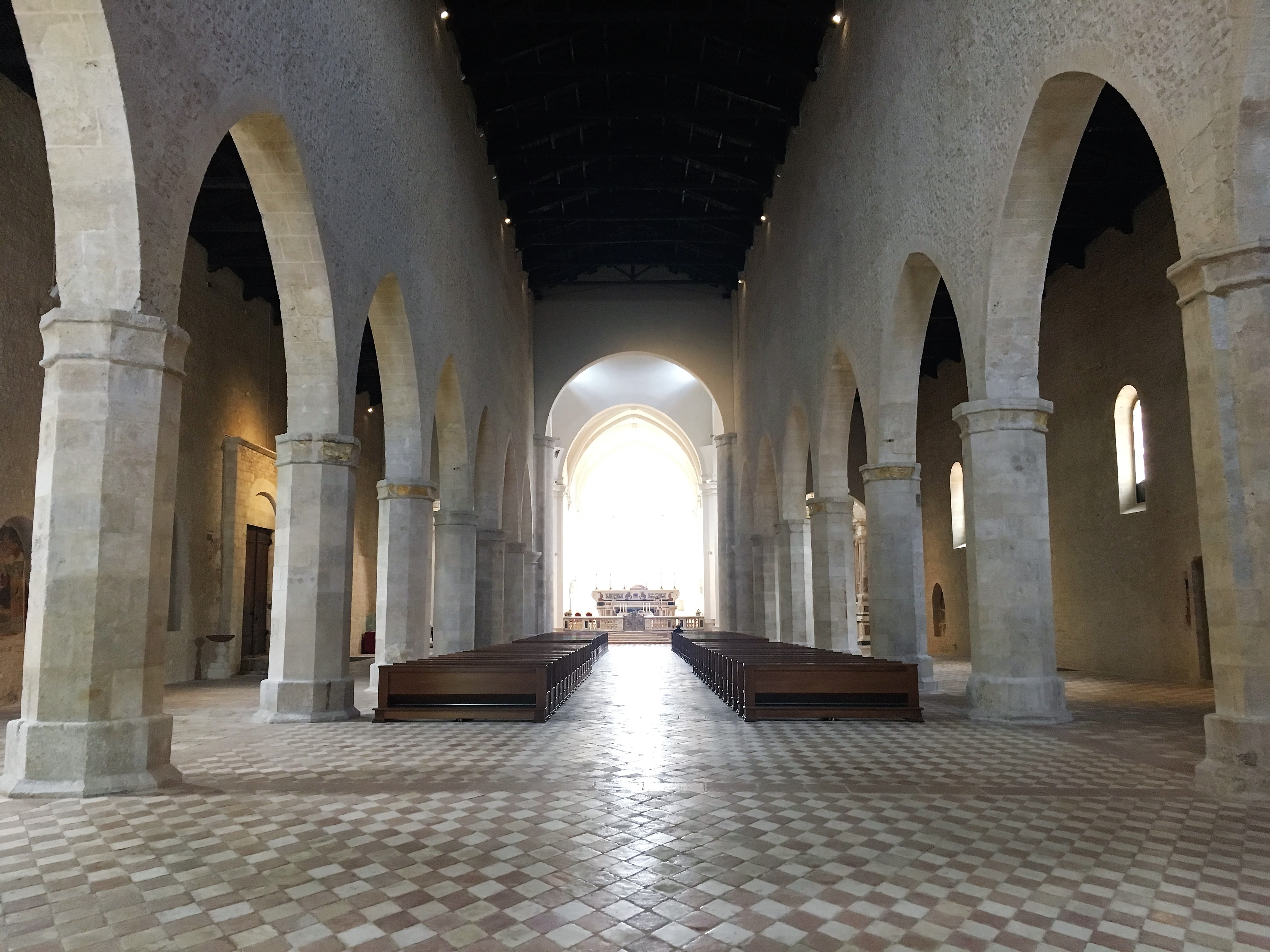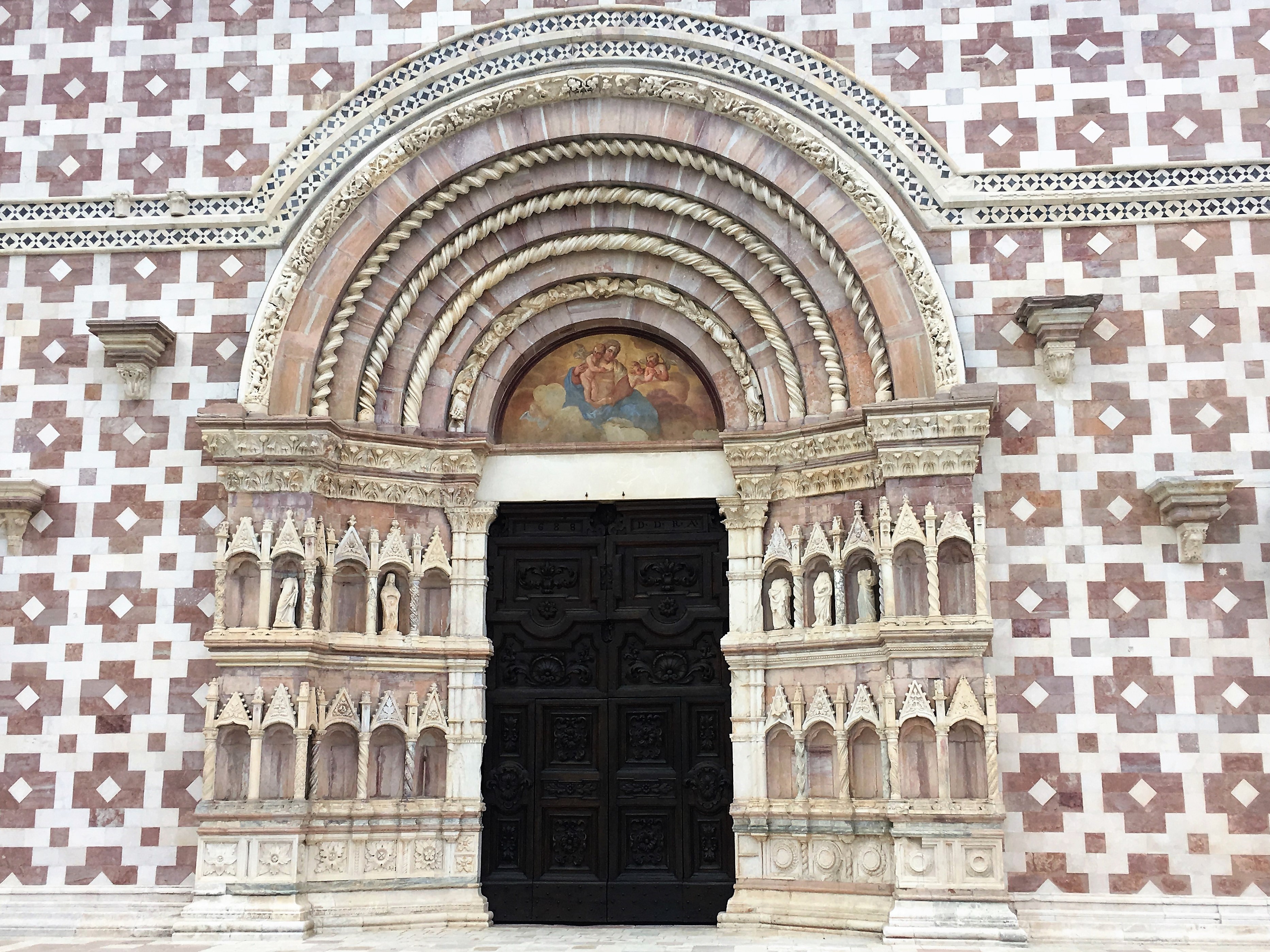 So far we had seen no evidence of the earthquake, but we knew that the Porta di Napoli had been one of the first attractions restored. The following morning we set off up to the Basilica di Santa Maria di Collemaggio where restoration has been recently finished. It’s not the first time this church has been restored after an earthquake. The most attractive part of this church is it’s façade which has a distinctive chequered effect. Inside it is calm and austere with the floor echoing the red and cream of the exterior, large columns, frescos and the tombstones of various bishops. There were boards explaining the process of restoration after the earthquake when the side chapels became parted from the nave and parts of the floor had dropped by over a meter. You wouldn’t believe the extent of the damage when you look at it now.