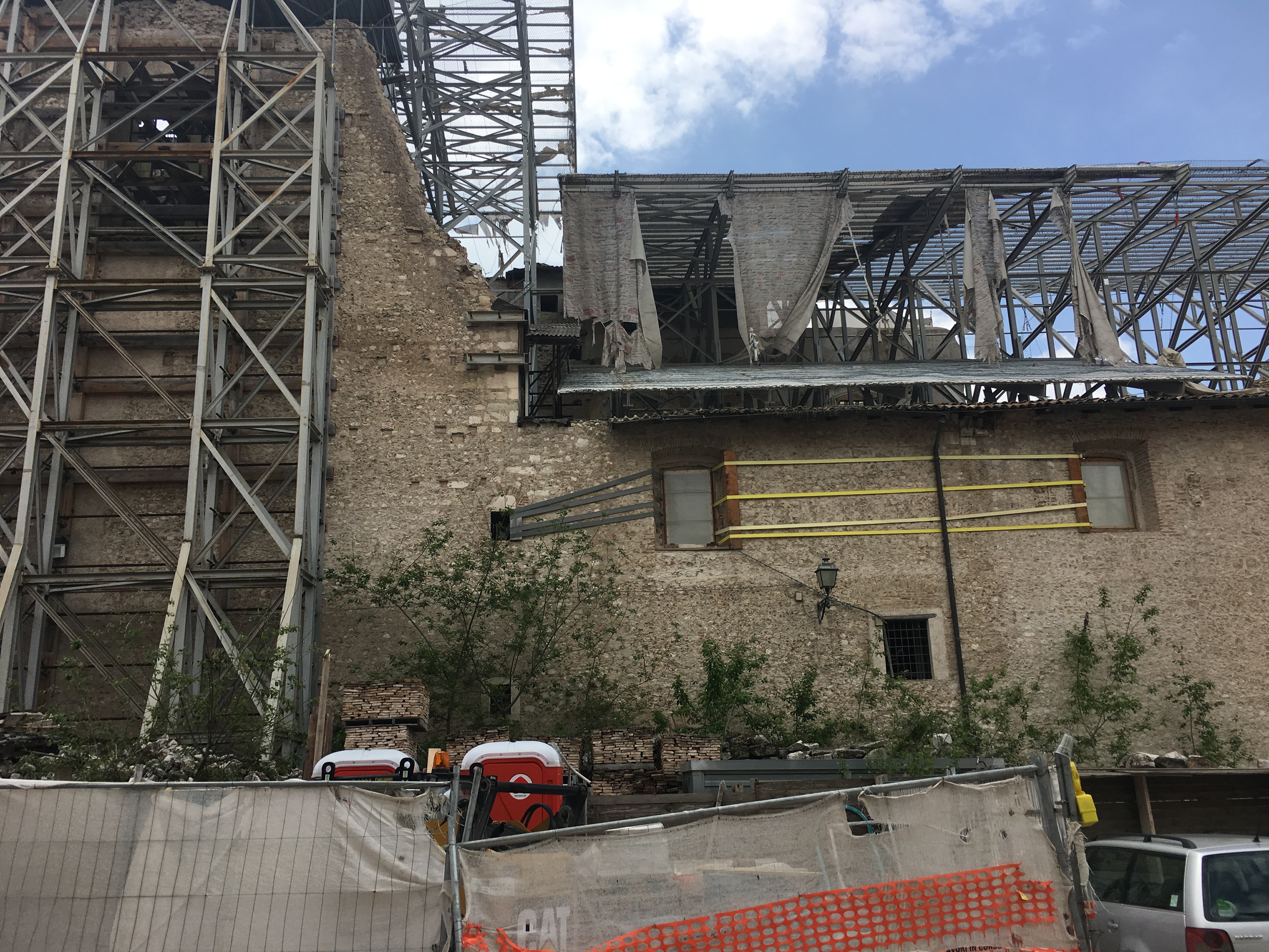 As we walked up into the centre of town we started to see more of the impact, the main tourist sights have been restored, but the rest of the centro storico is a building site. Cranes are the dominant feature and you feel like you should be wearing a hard hat and hi-vis jacket just to walk around. Whole streets are wrapped in scaffold and strapping to hold the buildings together. Looking inside windows and doorways it is evident that major work is still required. The amount of building work that is going on is incredible; they are essentially rebuilding a whole town. I know that there are a lot of opinions about the time it has taken to restore L’Aquila; lawsuits brought against the seismologists, money misappropriated, allegations of poor building quality. Whatever has happened, ignoring the place and taking it off the tourist itineraries isn’t going to help anyone. It is worth visiting for the attractions that are restored, and we found the insight into the physical process of putting a city back together after a major earthquake fascinating.