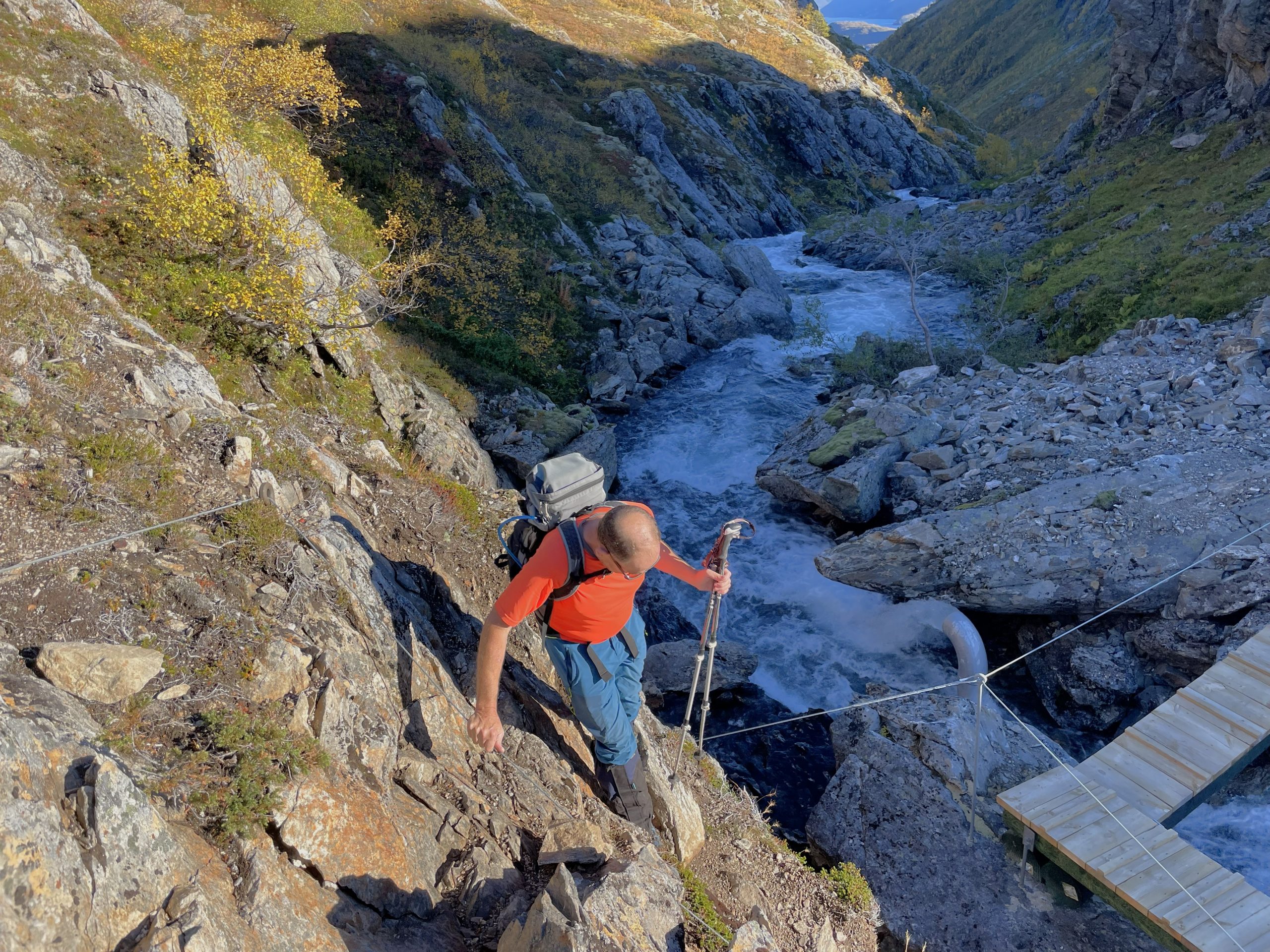 We had a lovely quiet night’s sleep and the morning dawned clear and cold. An early start was in order, we wanted to watch the rugby later. So we set off as soon as possible, taking flasks, snacks and lunches with us as we walked into the rising sun. The route started with a gentle ascent through the woodlands with aspen and willows showing some golden autumn colours and views of the mountains ahead. We wondered if we might see moose in these woods but sadly there was nothing to see apart from distant eagles and small flitting birds.