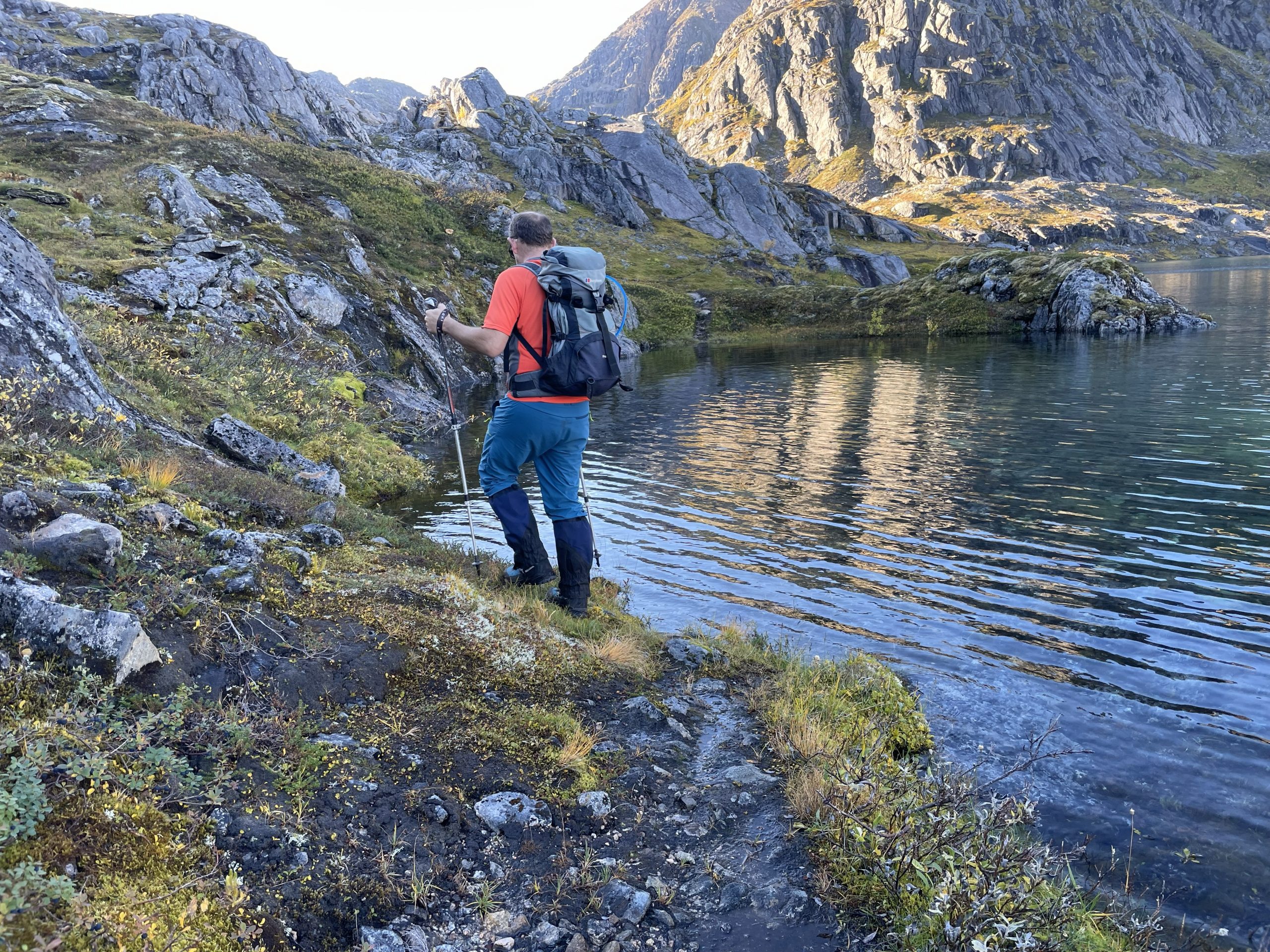 We knew that we would need to ford the stream that enters the south end of the reservoir in order to get up the next rocky slopes. With our experience so far we were doubtful that we would be equipped for it, or indeed willing. We were right. When we got to the inlet stream we followed it for a while, looking for the crossing point, we eventually spotted the red dots of the path markers on the other side of the stream, but it looked about thigh deep at that point. We had gaiters and would have been happy to cross something up to knee deep, but a thigh deep crossing was going too far. We decided to turn around. To make up for our abridged day I spent a while picking berries on the way back, re-stocking our supply of bilberries and lingonberries.