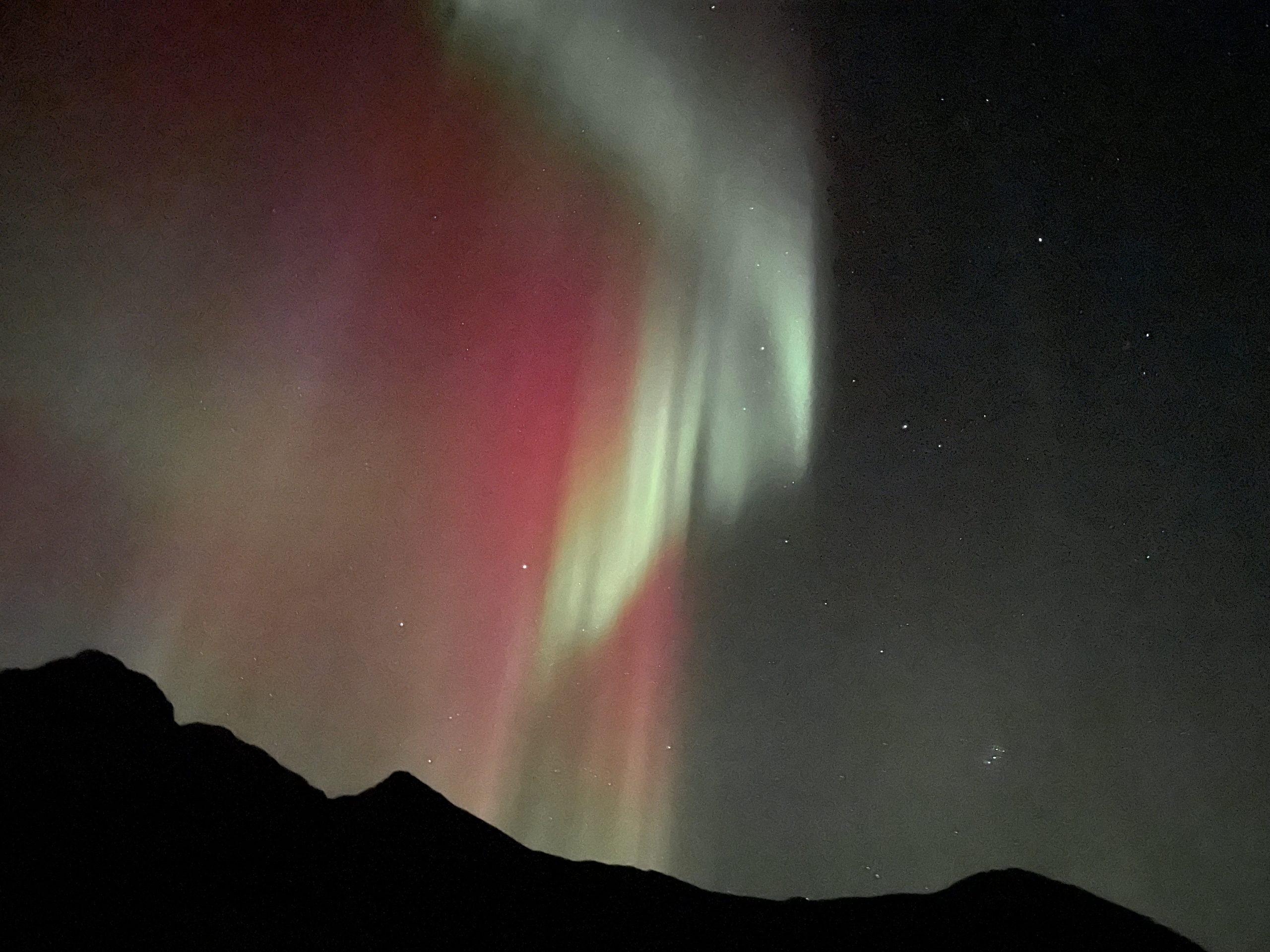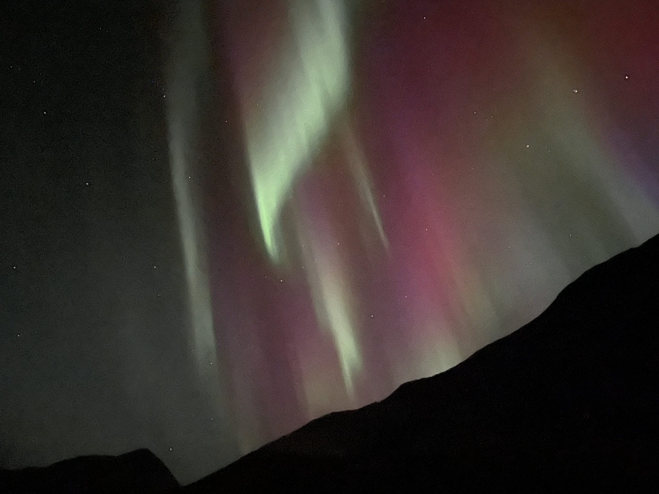 That night the aurora borealis lit up the sky again. It was incredibly clear in this unpopulated area, with the dark sky and the silhouettes of the mountains providing a contrast to the pink and greens of the lights.