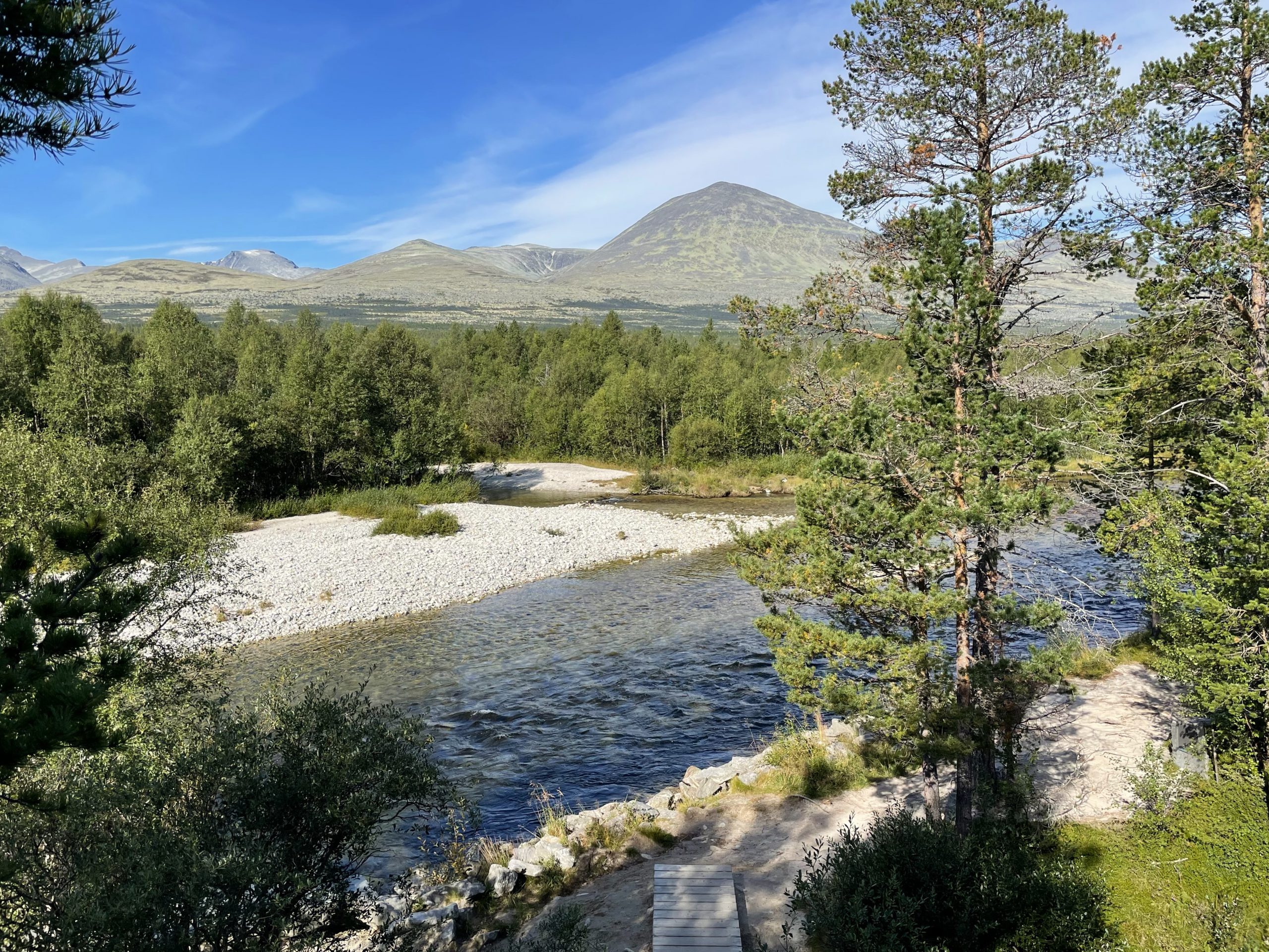 We chose a fairly easy walk, we’d just had three days of fairly hard physical activity and didn’t feel up to a major mountain hike. This round trip took us across the road and slightly uphill where we could get good views over the valley to the mountains. Then we traversed through woodland until we dropped back down to the road by some lakes. Here we crossed the road near a fishing spot and crossed the river. The return path took us back along the river through varied terrain with rocky areas, lakes, bogs and streams.