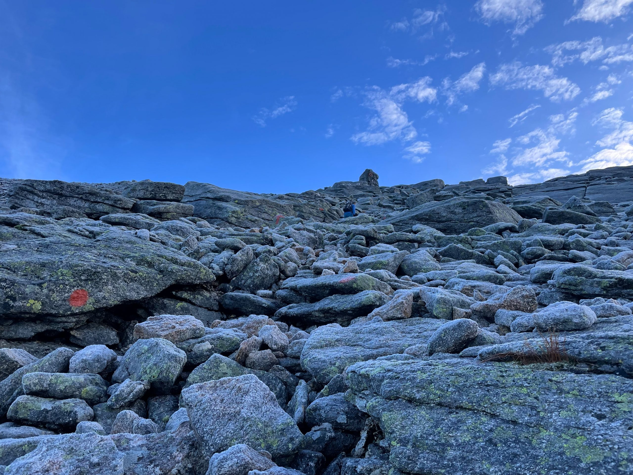 The nature of the terrain changed substantially here, instead of smooth slabs of rock we had boulders to clamber up. This was a lot easier. The rocks were at angles that allowed reasonable footholds and the frost and ice didn’t have such an impact. We met the woman who had passed us earlier, she had turned around because her dog was finding the boulders too difficult.