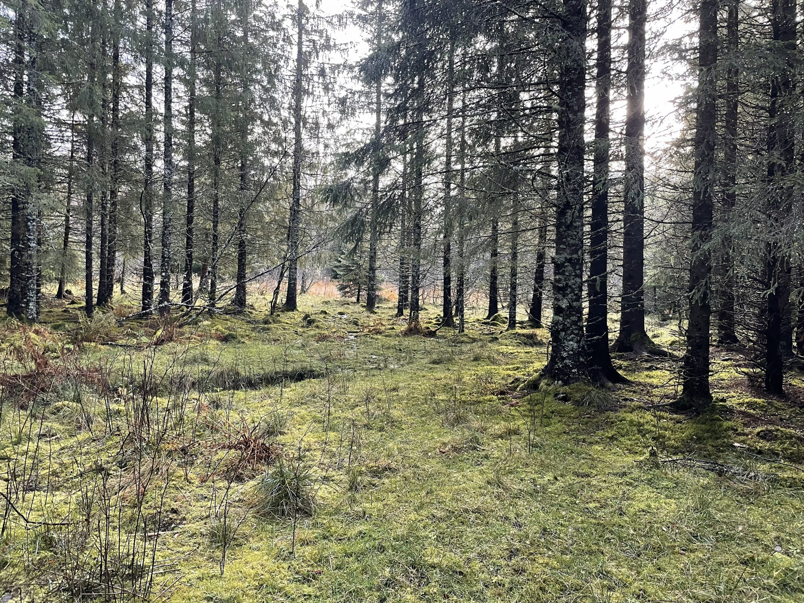 After a short walk through farmland and woodland we were ready to start the first part of the climb. This was over an area of glacially smoothed rock, covered in a thin icy verglas and just a bit too steep to be comfortable. Red Ts marked the way up the rocks but where possible we avoided walking across the slippery sections and instead followed the lines of vegetation between the rocks. We felt a little silly when a woman and her dog bounded up past us, skipping across the rocks as though it was a dry summers day.