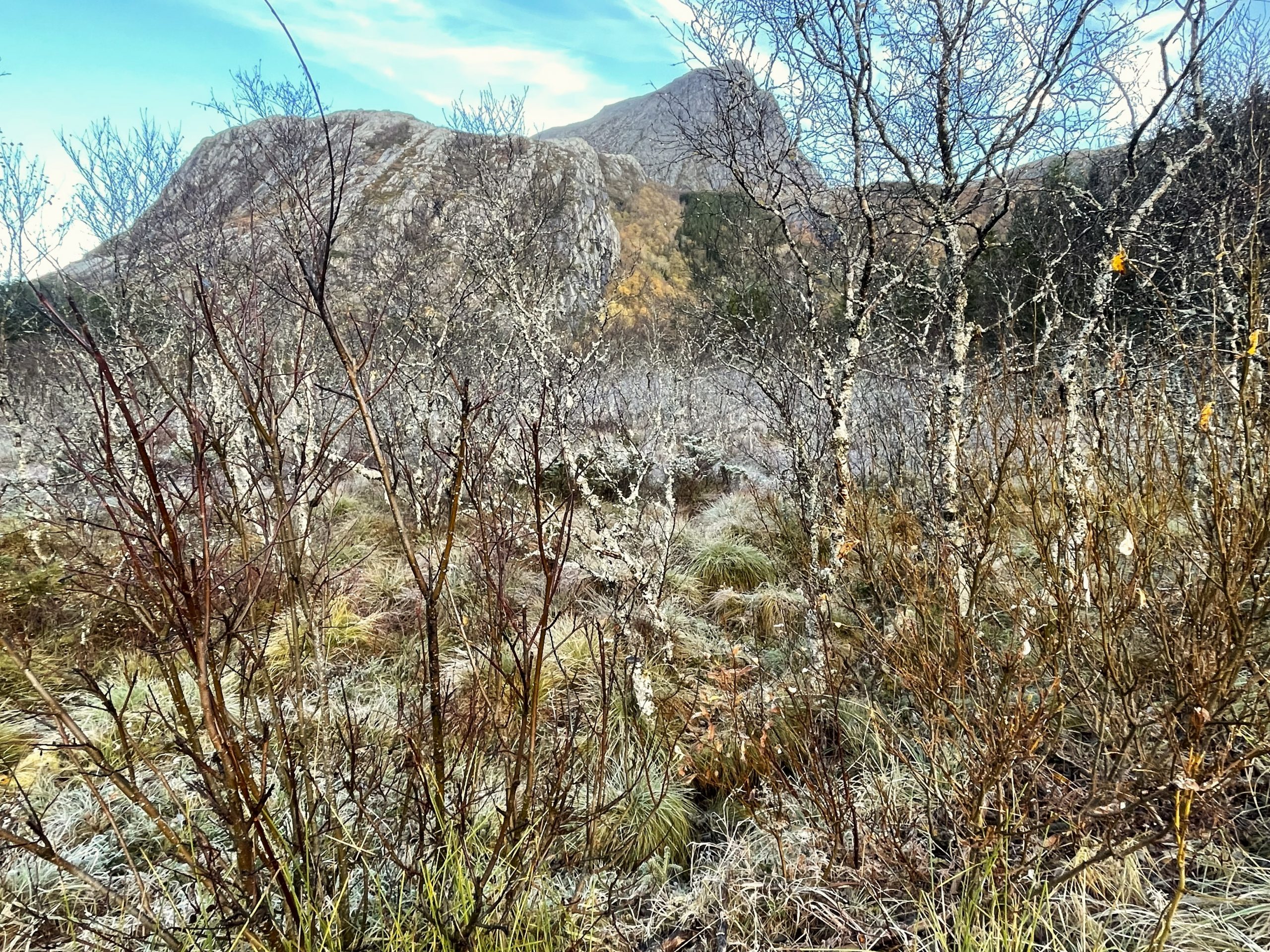 As we got to the summit we saw snow patches and the frost got thicker. The route got steeper and the footing more slippery again. We bailed after three hours at 840m when we met another person descending who said that the summit was very icy. He’d ascended from the other side.