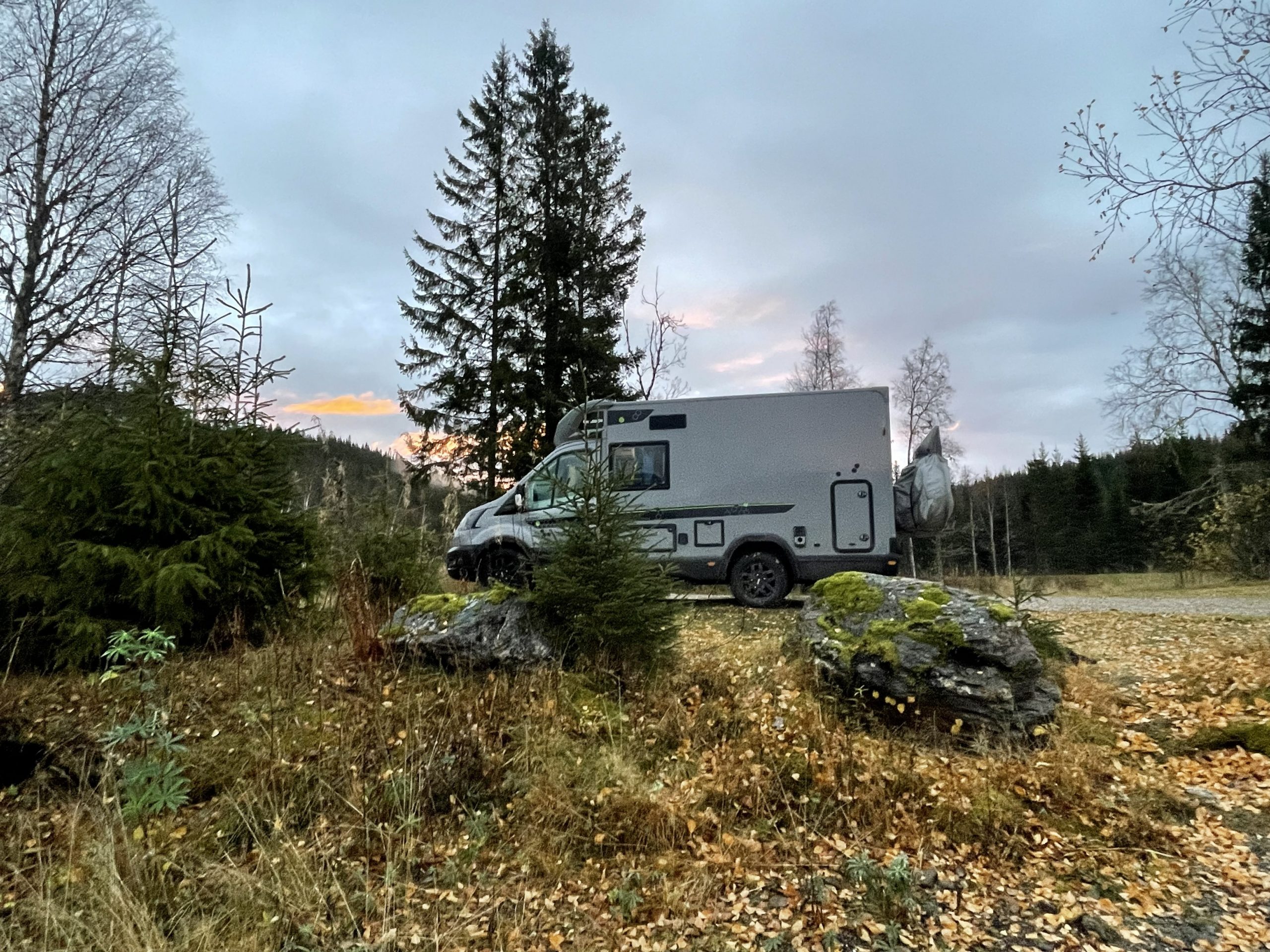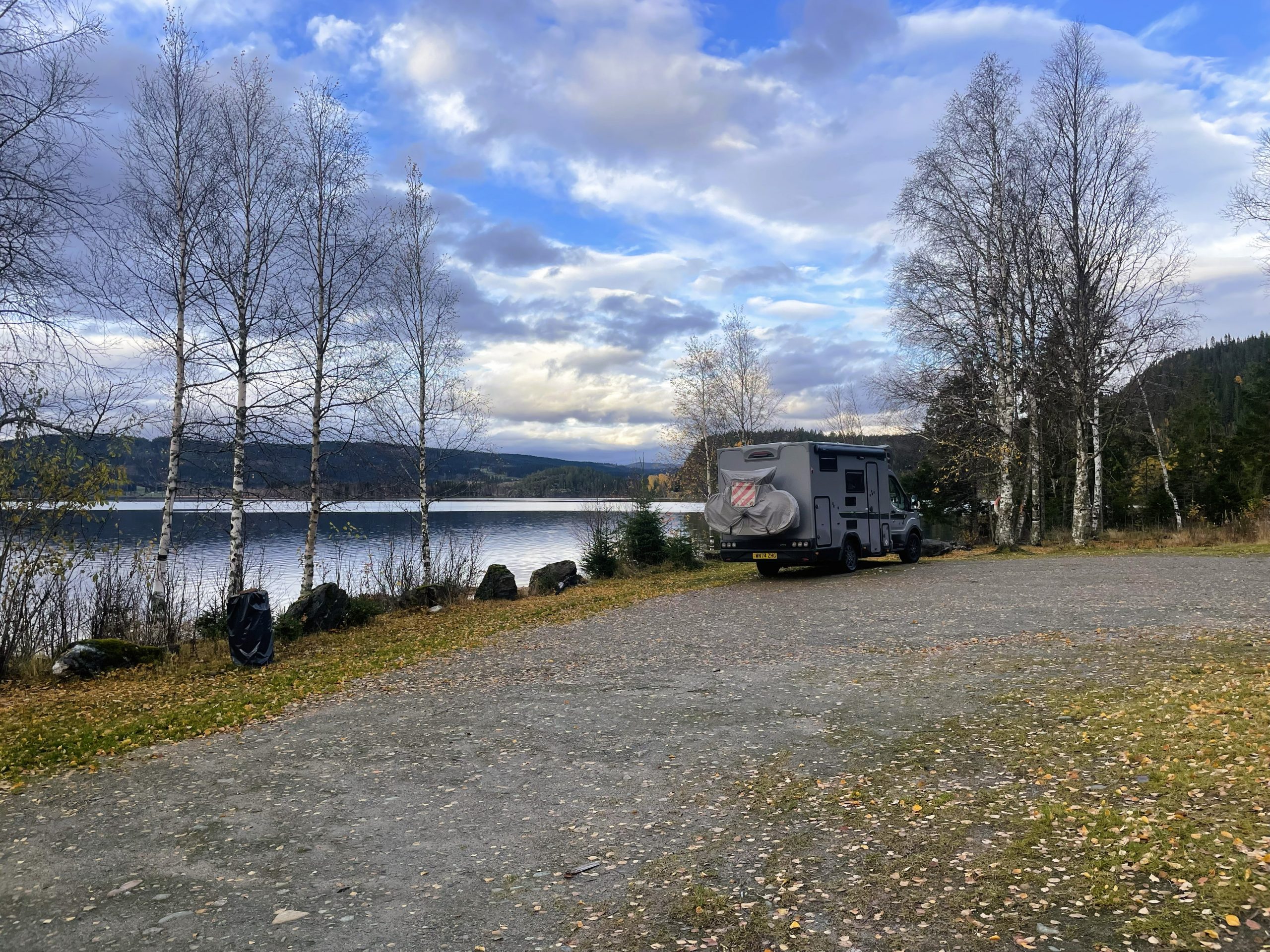We continued, stopping now and again to suss out potential parking spots. In the end it was a lakeside spot on the shores of Grungstadvatnet, 110km after the ferry, that caught our fancy. A dirt track down to the waters edge offered up a handful of parking spaces, fireplaces, bins and a long drop toilet I looked at and then pretended didn’t exist. The clouds started to break apart and we got a bit of late afternoon blue sky and a lovely sunset. A caravan joined us later that evening and we had a lovely peaceful evening.