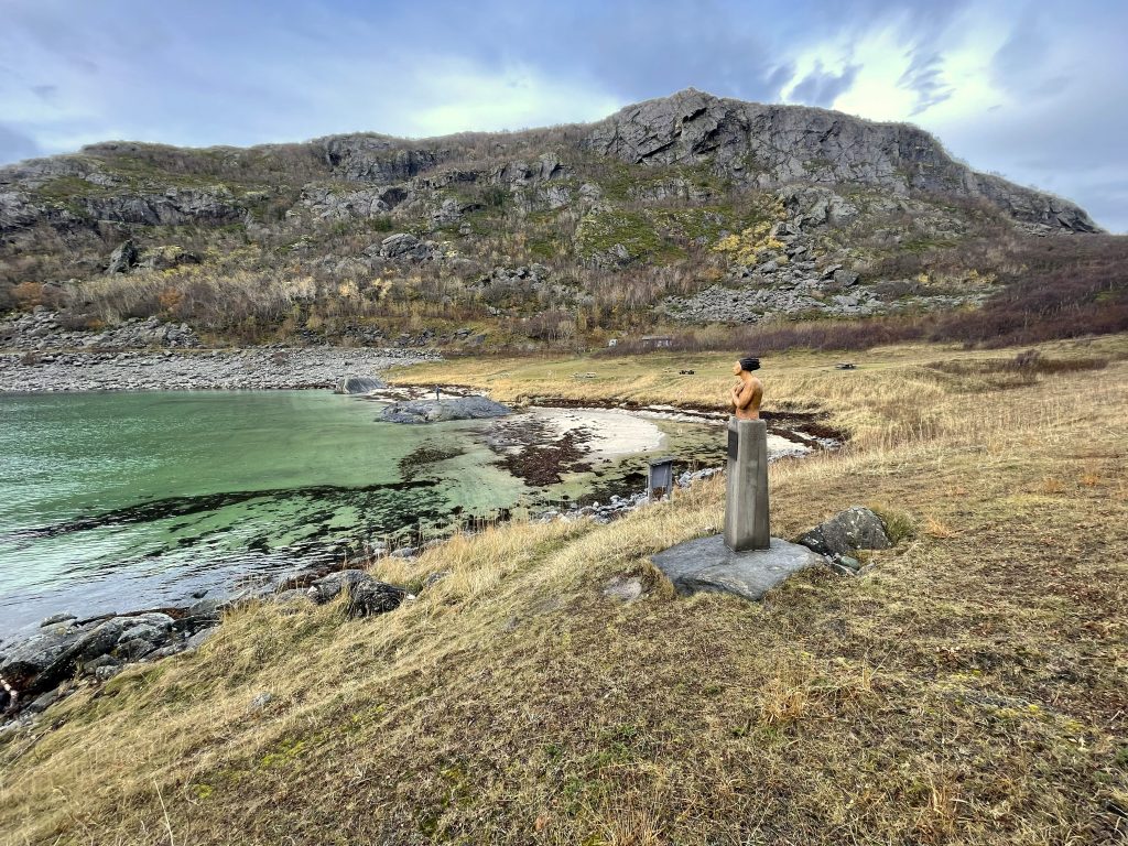 Lovely beach at Kvennvika. We have seen several similar sculptures of women looking out to sea but cant remember the name of the artist.
