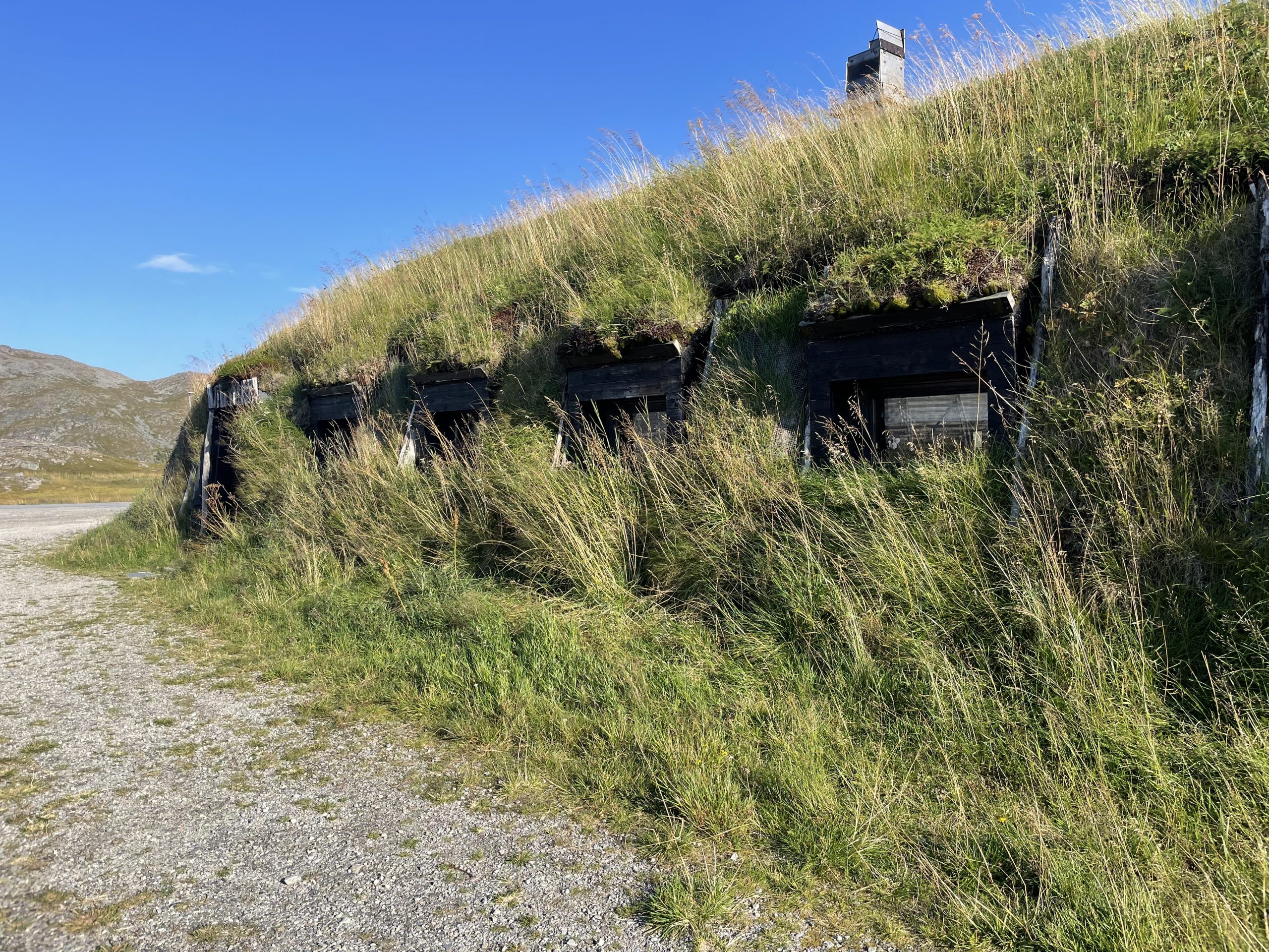 From the parking spot we followed a walk on the Gammelveien. This is a historic route that leads to other villages across the centre of the island, created many years before the road around the steep outer edge. In 1896 the community built up the road using local stone to make the track that we followed. The walk took us through the island’s only wood – a small copse behind the supermarket we’d visited earlier – and past German WWII fortifications.