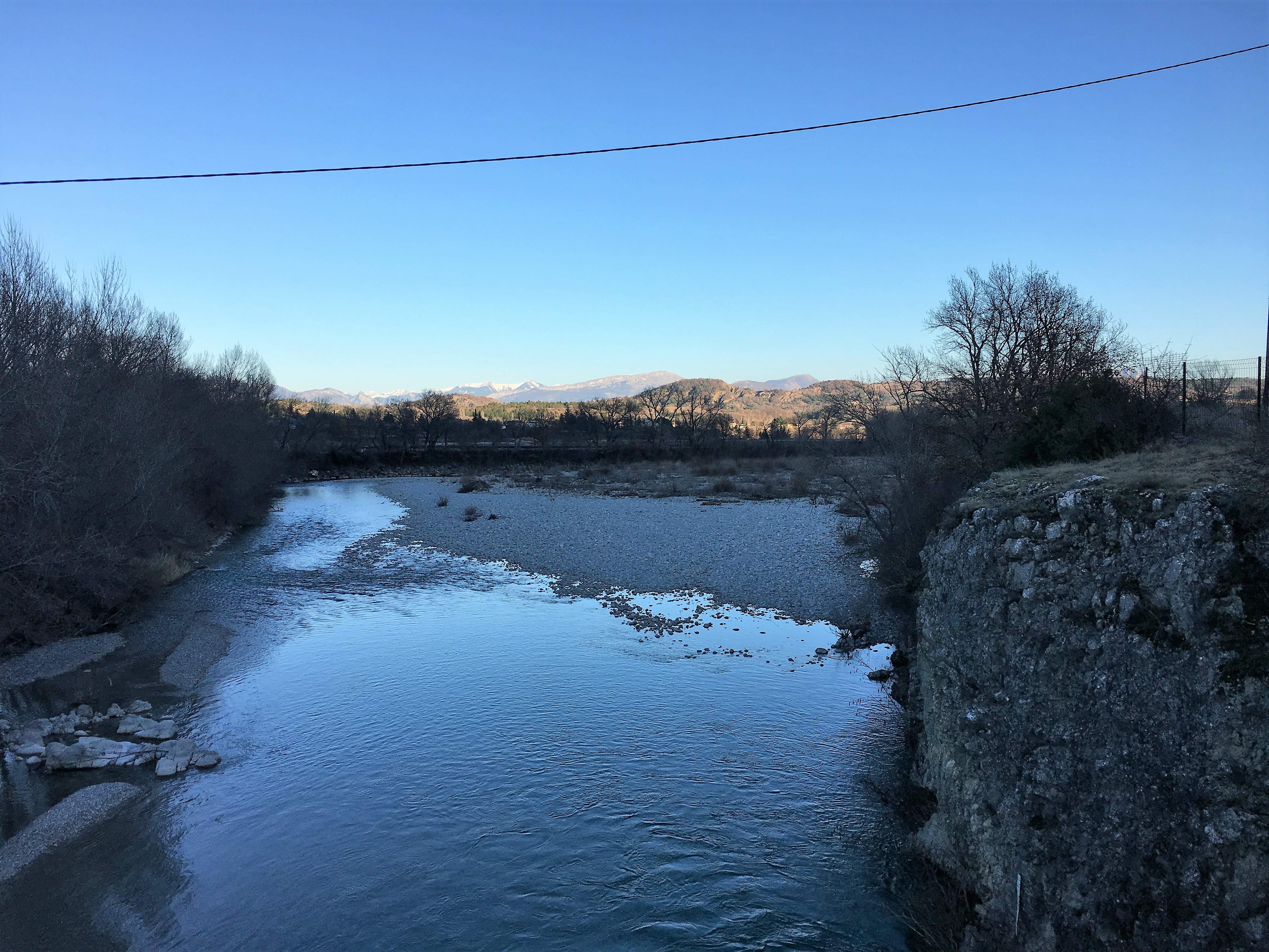 To be honest it was more difficult than it looked by bike, with nasty stretches beyond the first bridge where we had to push the bikes up switchbacks of loose stone and mud. I think I would do it on foot if I was to go back, in my opinion the path was occasionally too narrow to be a shared foot and cycle route, even on this winter’s day we had to dismount to let family groups walk past. It was a nice route though with the blue of the reservoir, the beaches, cliffs and forest and the distant snowy peaks of the Haute Alps.
