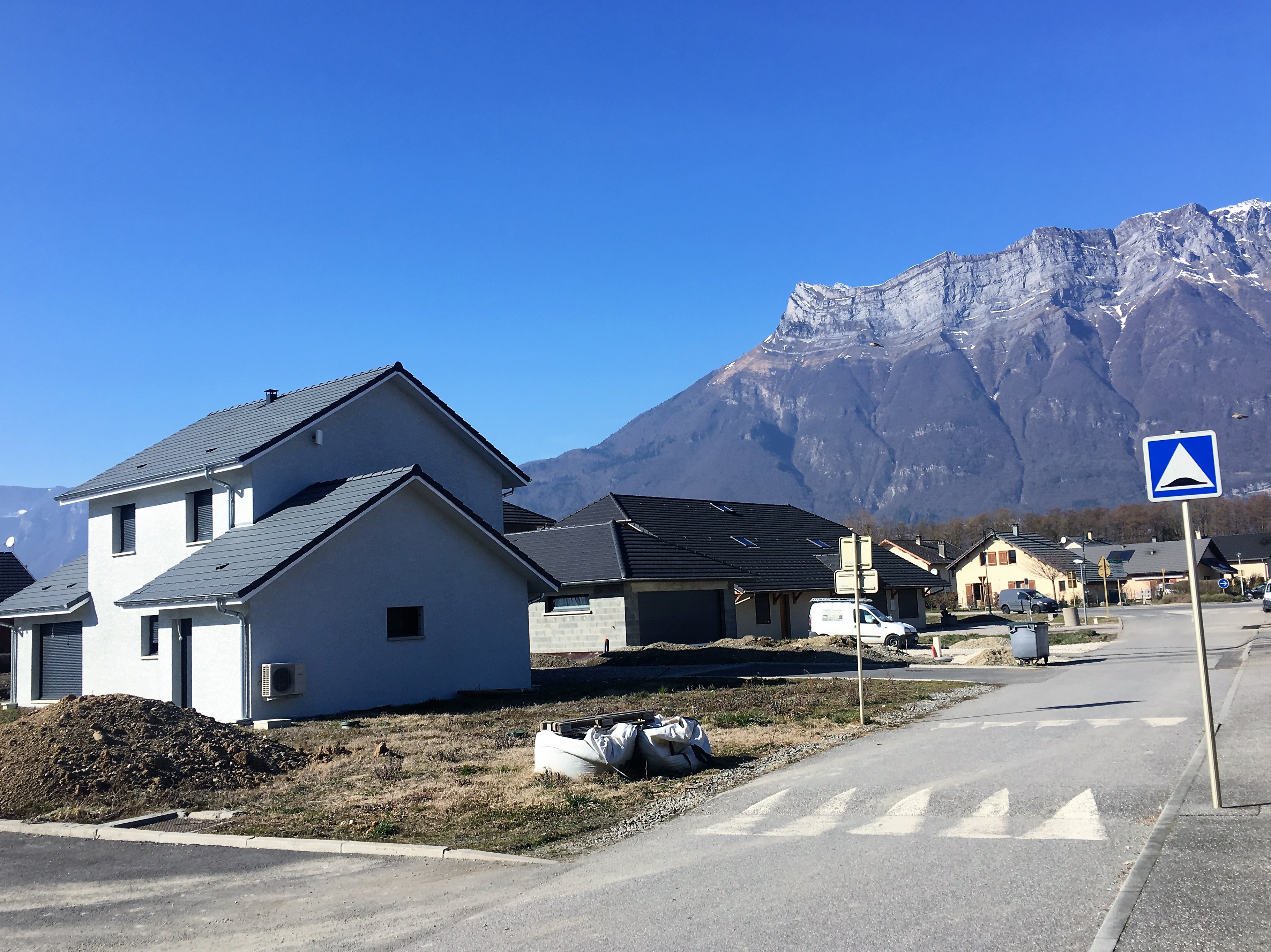 For the final day we pushed on past Grenoble (which makes it sound like a strenuous affair, whereas it was really an easy drive) and stopped by Lac de Saint-Claire. This little mixed parking area had motorhome services and public toilets and was next to a nice recreational area, but it was also right next to the road. We took advantage of the services (including water that was working) but moved on to find somewhere quieter. A few kilometres down an abnormally straight road was the village of Bourgneuf with motorhome parking tucked in behind a restaurant and church. We settled in with spectacular views across the flat valley to the mountains.