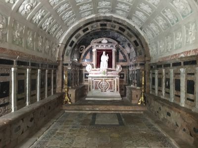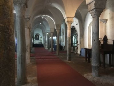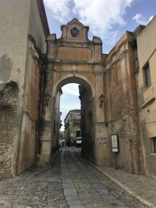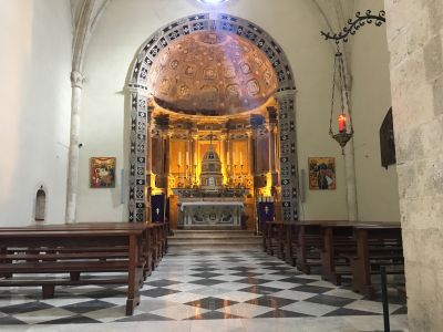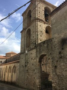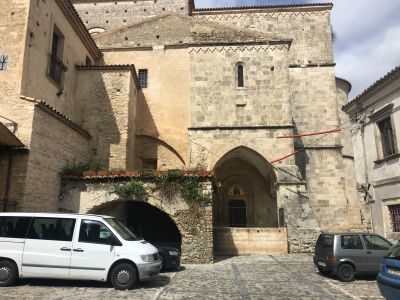 The town had looked lovely as we drove through it, so we decided to spend the afternoon exploring. The medieval centre sitting on the rocky ridge has picturesque alleys for wandering around, the ruins of a castle guard the end of the ridge and in the centre of the town (or maybe it should be a city) is the largest cathedral in Calabria. Everything was pristine, the golden sandstone of the buildings shone in the sunshine and the smooth flagstones of the streets added their lustre, creating a sense of warmth. The views from the top of the town were worth the walk, but there is also a small land train that can transport you around – today it was busy ferrying a school trip of loudly chattering and singing teenagers around the village. We popped into the cathedral, a couple of euros each gained us access to the small museum in the crypt as well as the cathedral proper, a very austere Norman style building with a highly ornate alter as counterpoint.