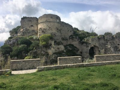 We drove south through the Gerace to reach the parking area, a huge car park that had motorhome parking at the top of the hill. The motorhome spaces had free electricity and water, but there was no evidence of waste disposal (we eventually found a sewer manhole behind one of the buildings near the entrance to the car park). Buildings in the car park hinted that further facilities had been planned, but they were empty and shut. The views were stupendous, looking towards the coast at Locri, inland to the Aspromonte mountains and up to the medieval village on it’s sandstone cliff. I expect that there is a charge in the height of the tourist season (there was a little booth for someone to sell parking tickets) but for now this was a lovely spacious car park that was free of charge.