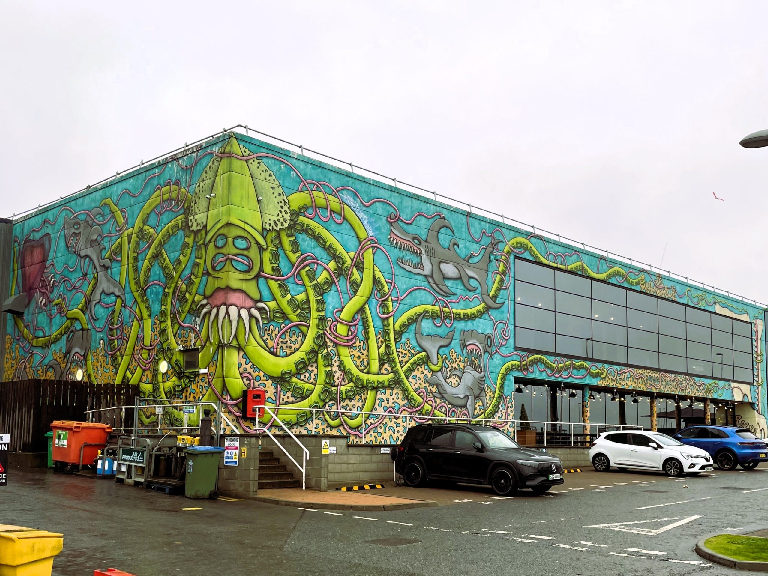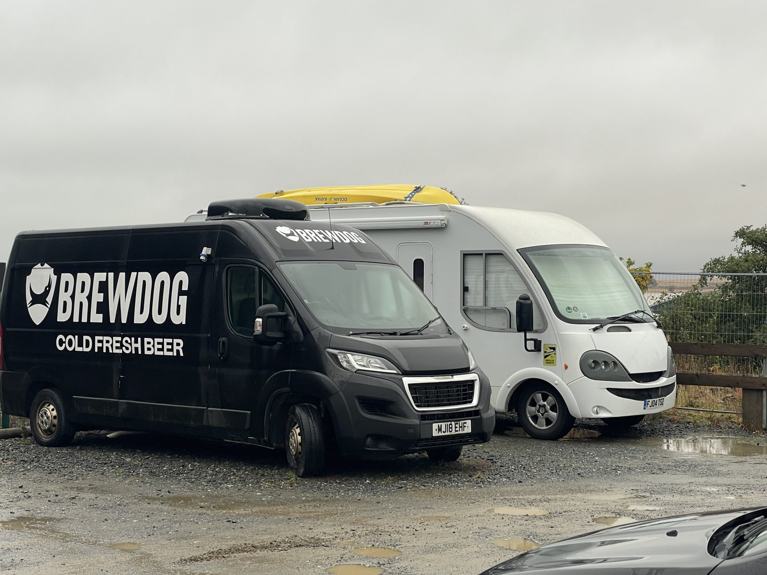 We turned up at the brewery on the industrial estate in Ellon. You could have called it the Brewdog industrial estate as the majority of the estate is made up of the vast brewdog buildings and stainless steel hoppers. I’ve never been very sure how I feel about Brewdog as a company. They haven’t been without their share of controversy; workplace bullying and some very oddly chosen marketing campaigns (“beer for girls” anyone?) and their beers are mostly too hoppy for my liking (Paul doesn’t drink beer but they do have a cider as well as as distilling gin and vodka). However I didn’t have any concerns about taking advantage of a free night in their staff carpark, where we sneaked into a corner and hung Bertie’s back end over a ditch.