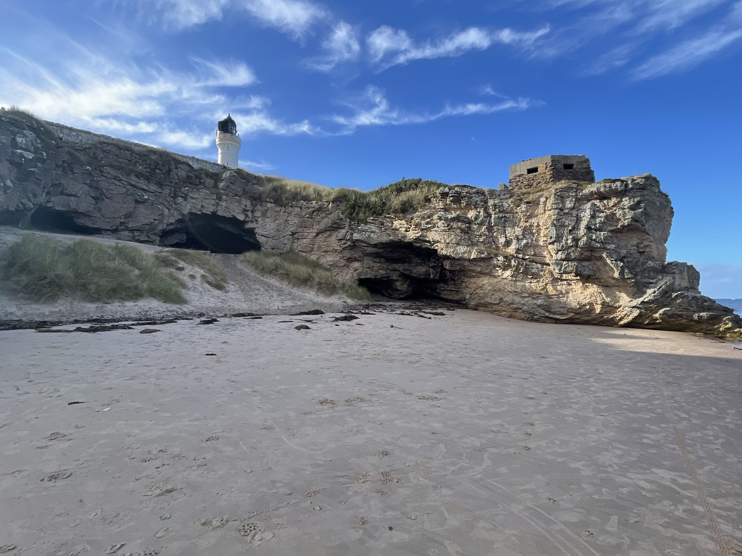 At the far end of the long beach was a lighthouse standing on a cave riddled cliff. The caves were used by travelling families until the early 20th century and are quite deep. While we explored them we watched a walker try to navigate the top of the cliff. The wall of the lighthouse compound is very close to the edge of the friable rock of the cliffs, as we saw when we walked up there, I would definitely not consider trying to walk around the outside of it.