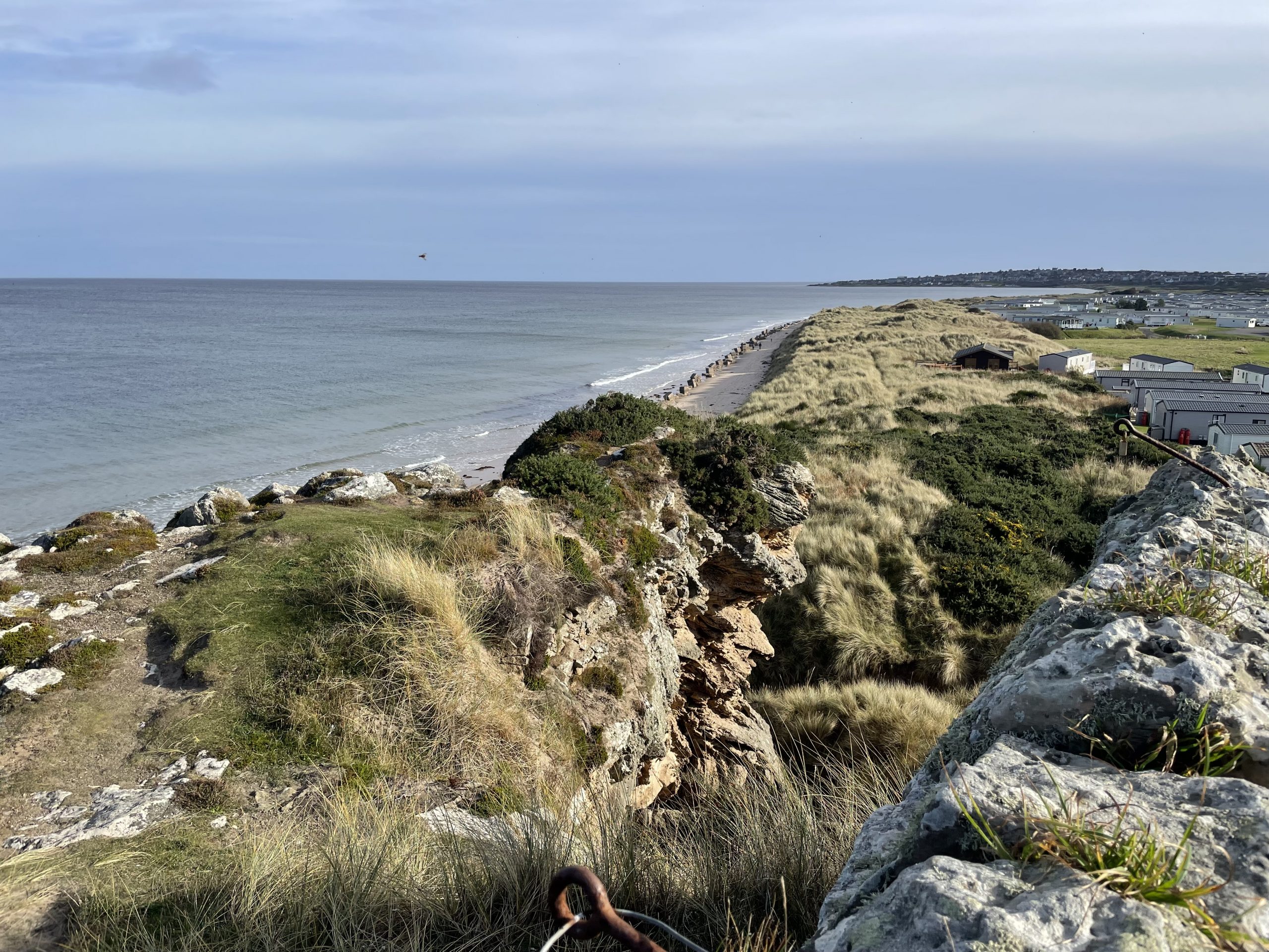 After filling ourselves up we walked westwards between the beach and the golf course, accompanied by a long row of anti tank sea defences. Some were still standing on the dunes but many had been undercut by the sea, toppled over like ancient monuments. We passed by the fetid remains of an unknown cetacean on the beach, a sad sight. The outer markers for the airfield are incongruously placed through the golf course, an extra hazard for the golfers, or maybe they get points if they manage to hit them.