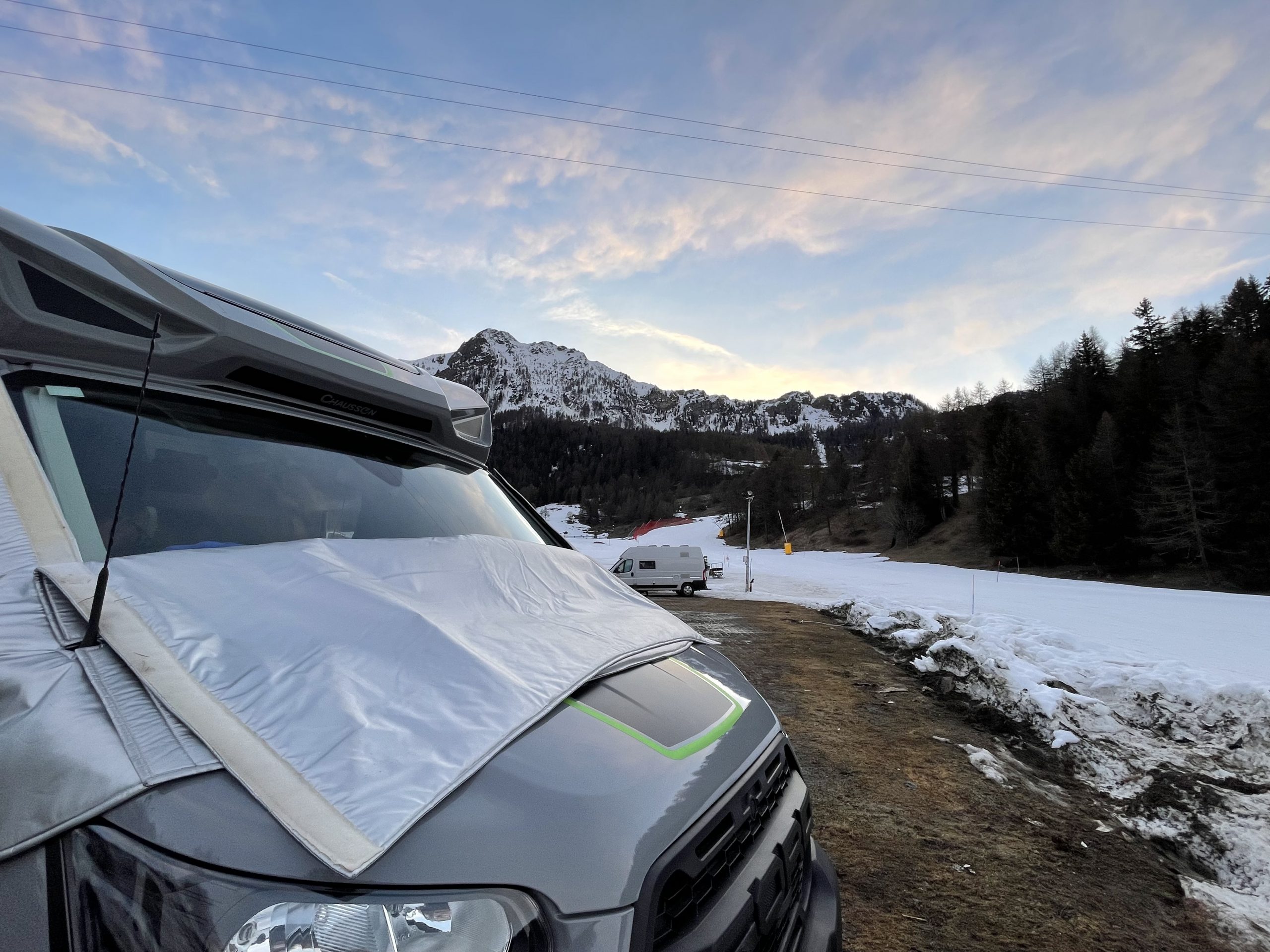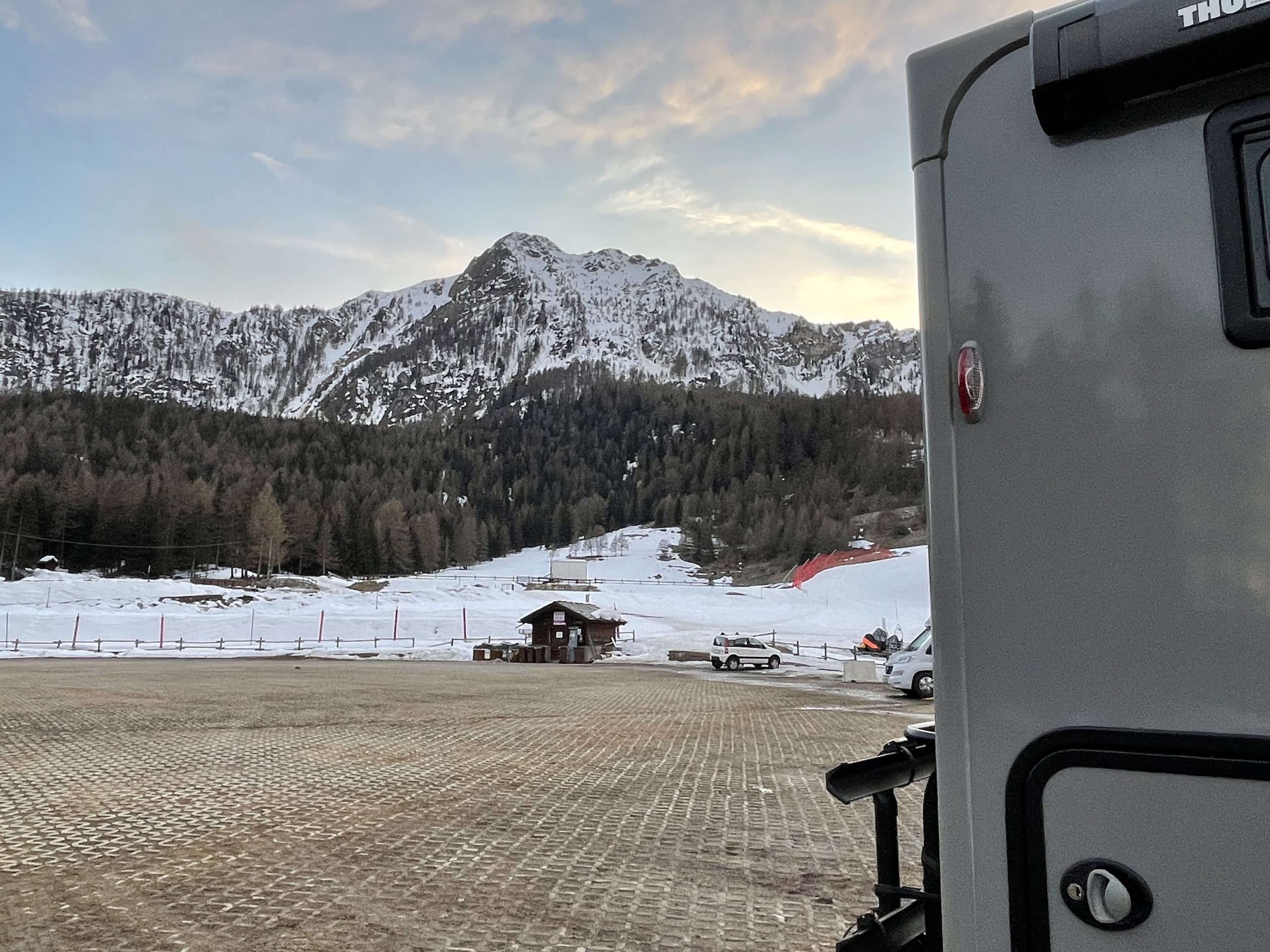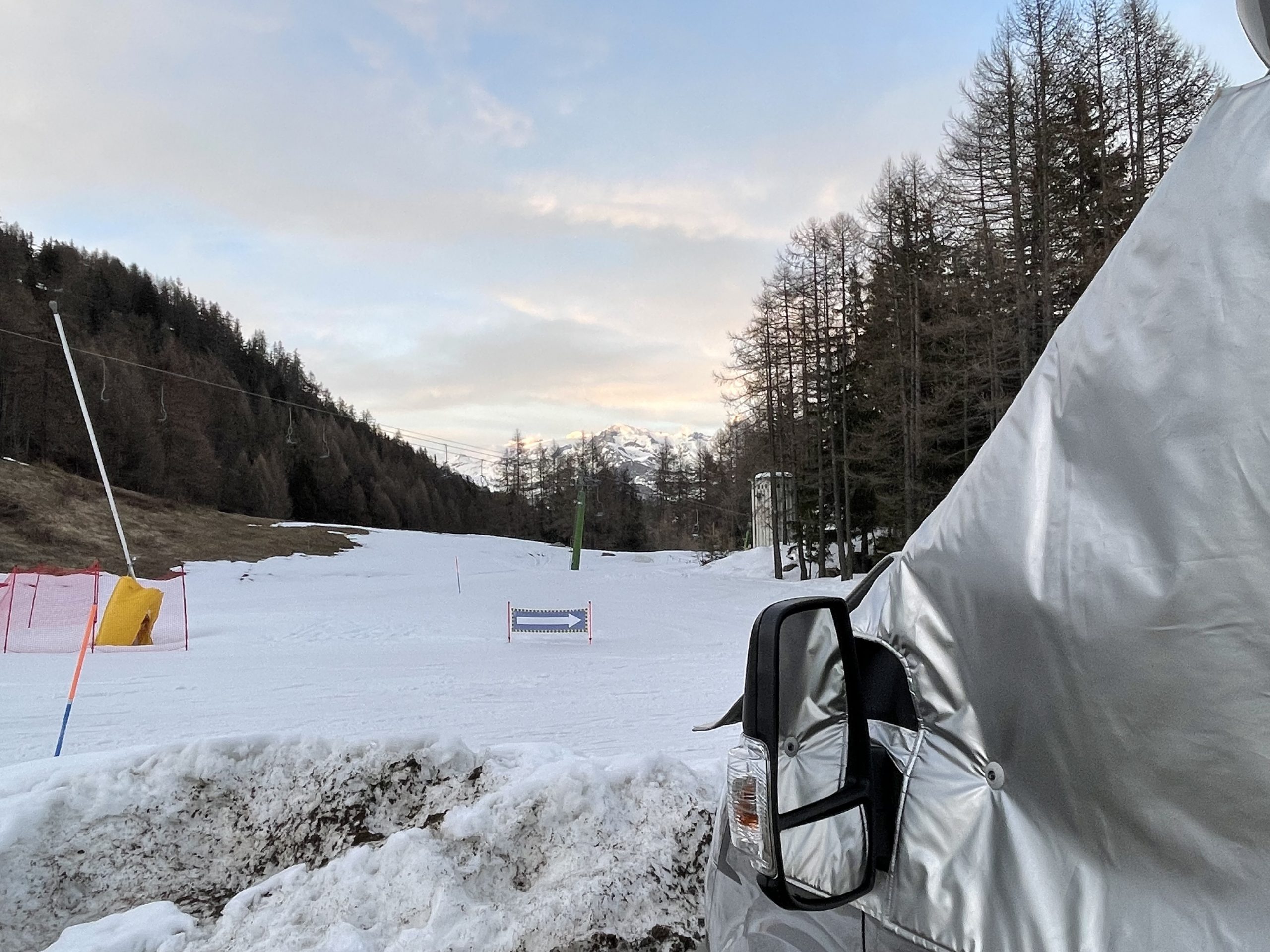 The sosta at Torgnon is shared with car parking, a vast expanse of grass-crete that is right next to the piste. Payment is by ticket machine or app. There are electric hook up points around the edge which look as though they are coin operated, but the payment system doesn’t work so the power is free. One bollard was lying on the ground, obviously run over at some point.