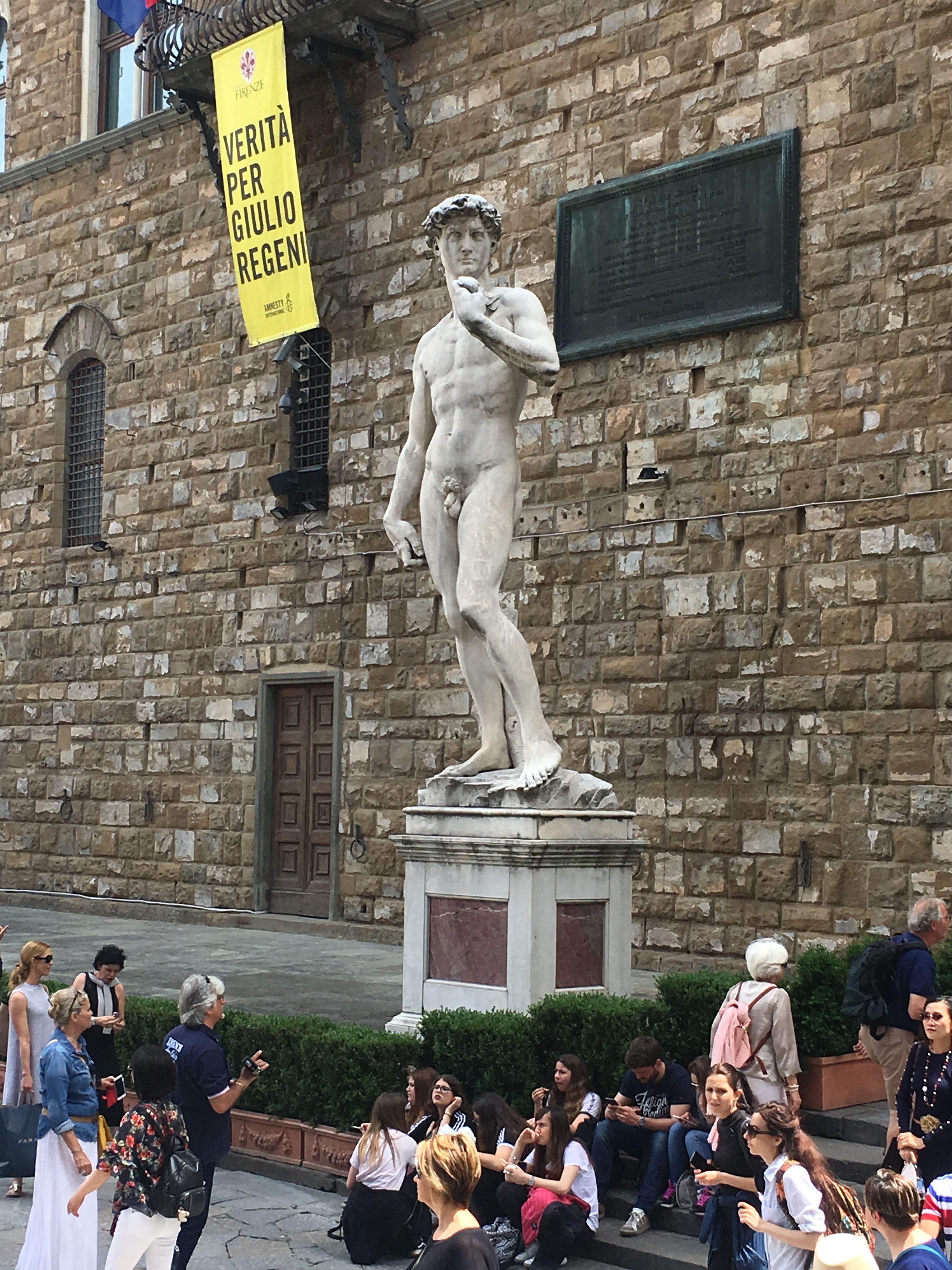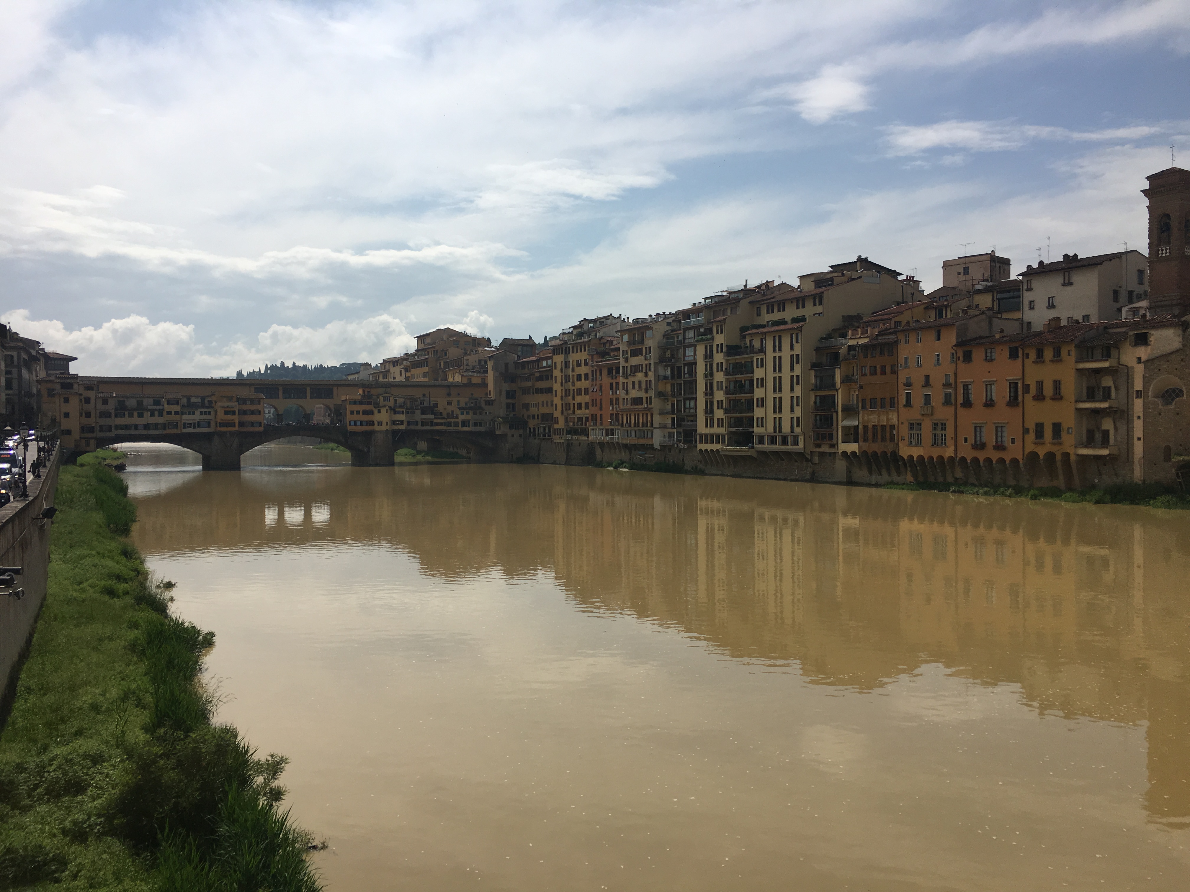 We walked in from the sosta, it is a good 45 minutes into Florence’s centre. The bus runs very regularly and is easy to catch from a stop up the road – save money by buying your tickets from the tobacconist rather than on the bus. We wandered along the side of the very muddy Arno river up to the medieval Ponte Vecchio, the bridge is lined with jewellery shops on both sides so that in places you’d be hard put to recognise you were on a bridge – there is a lot of gold bling in once place. We marvelled at the highly decorated cathedral – one of the most impressive I have ever seen. We also marvelled at the queues stretching around the cathedral. It is free to enter the main building, but we decided not to wait in the queue. The Mercato Centrale was a good place to indulge our food loving selves, the ground floor was full of market traders selling meat, fish and vegetables as well as more exotic produce (I found some fish sauce which is a bonus for stir fries and thai food) and tourist merchandise. The upper floor had a selection of cafes and bars selling a wide range of drinks, meals and snacks. We admired a copy of Michelangelo’s David (there are two copies of the sculpture in the city as well as the original in one of the museums). For lunch we crossed the river and ate in a piazza in the Oltramo quarter which had a bit of a student/hipster vibe. We did, of course, eat gelato.