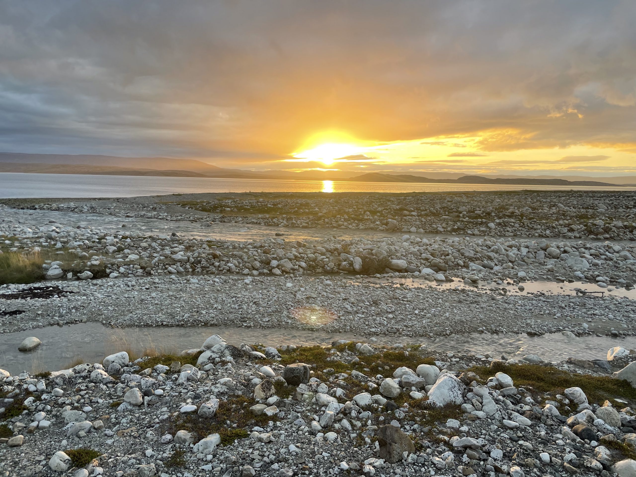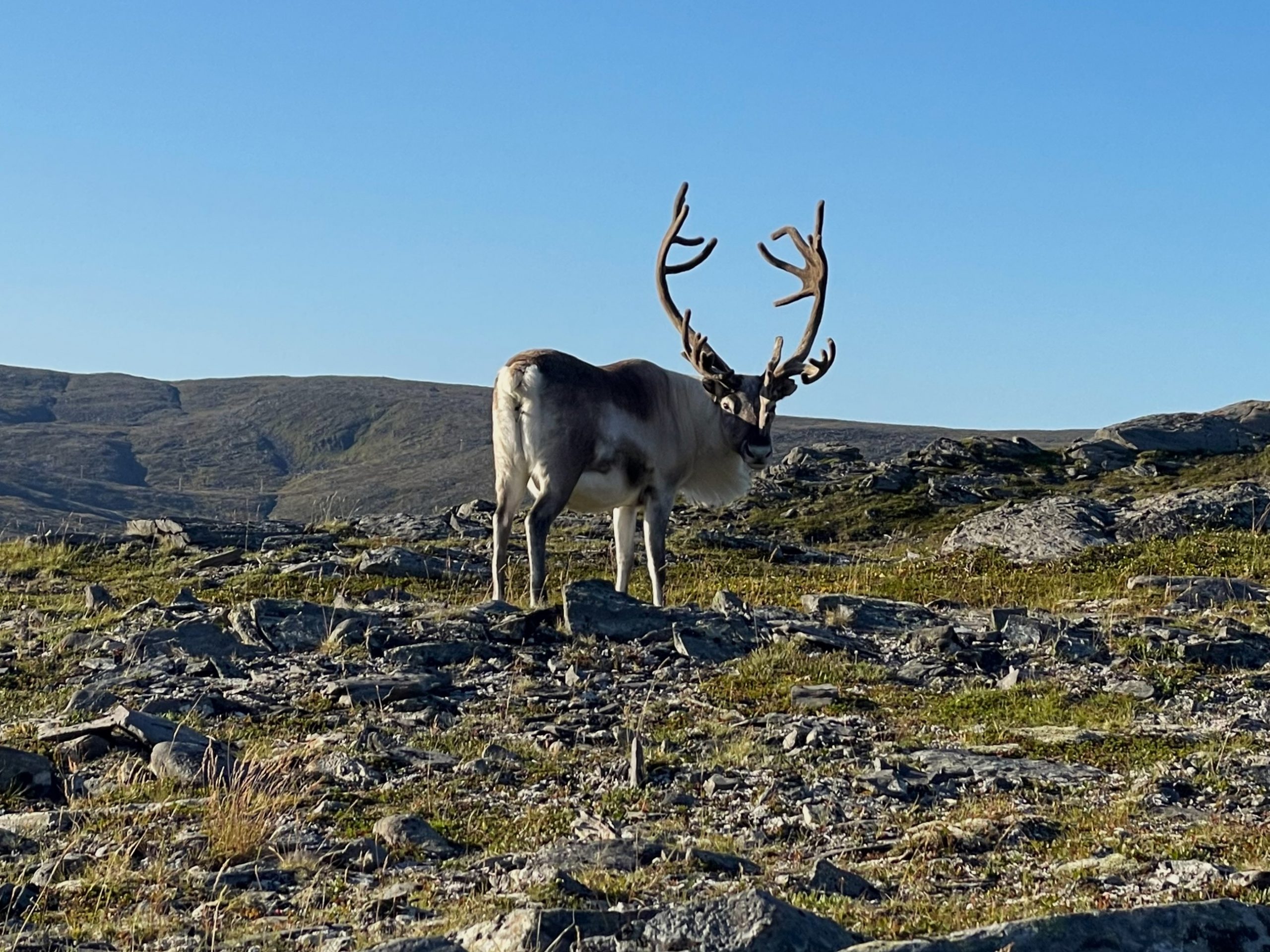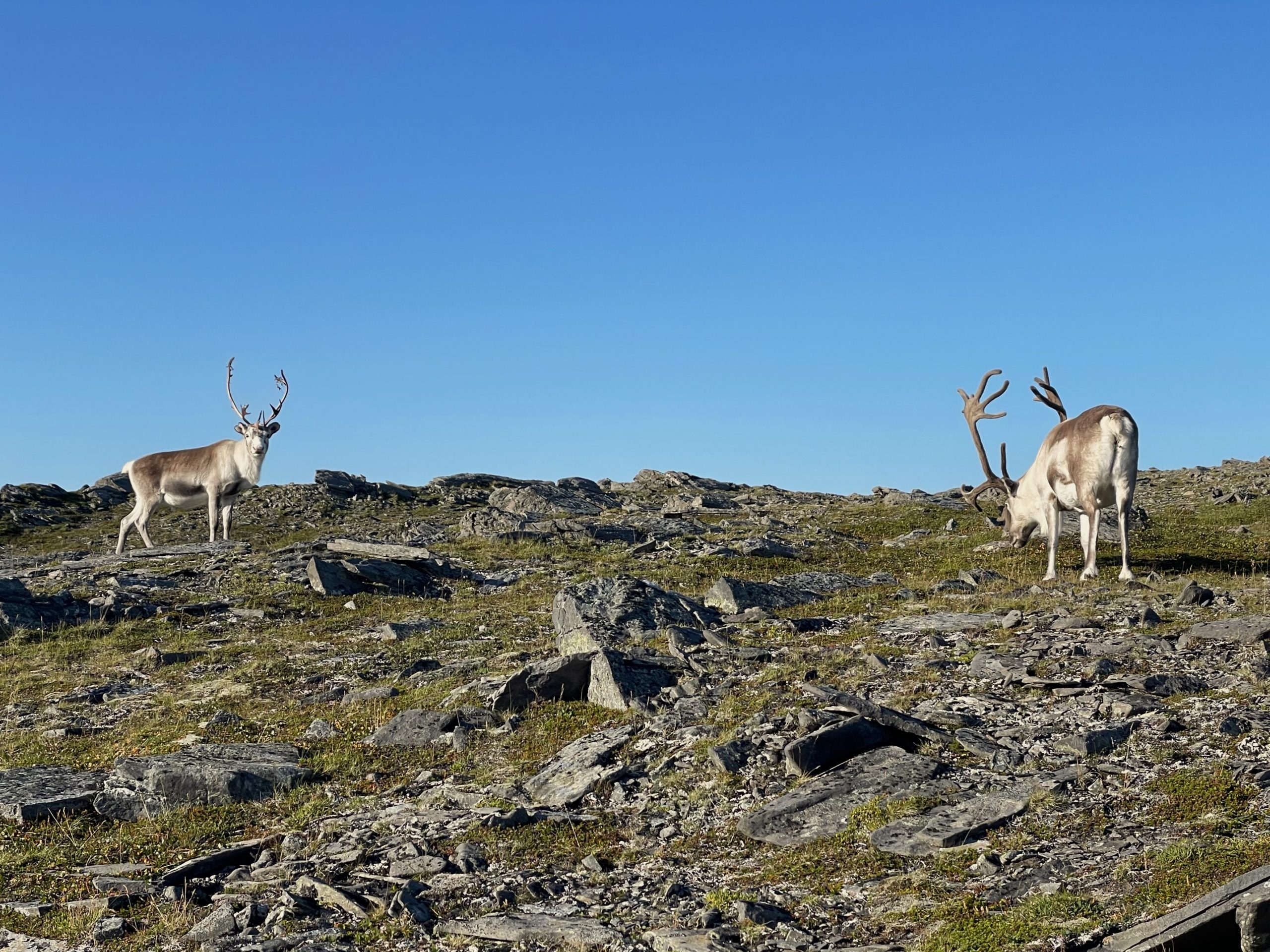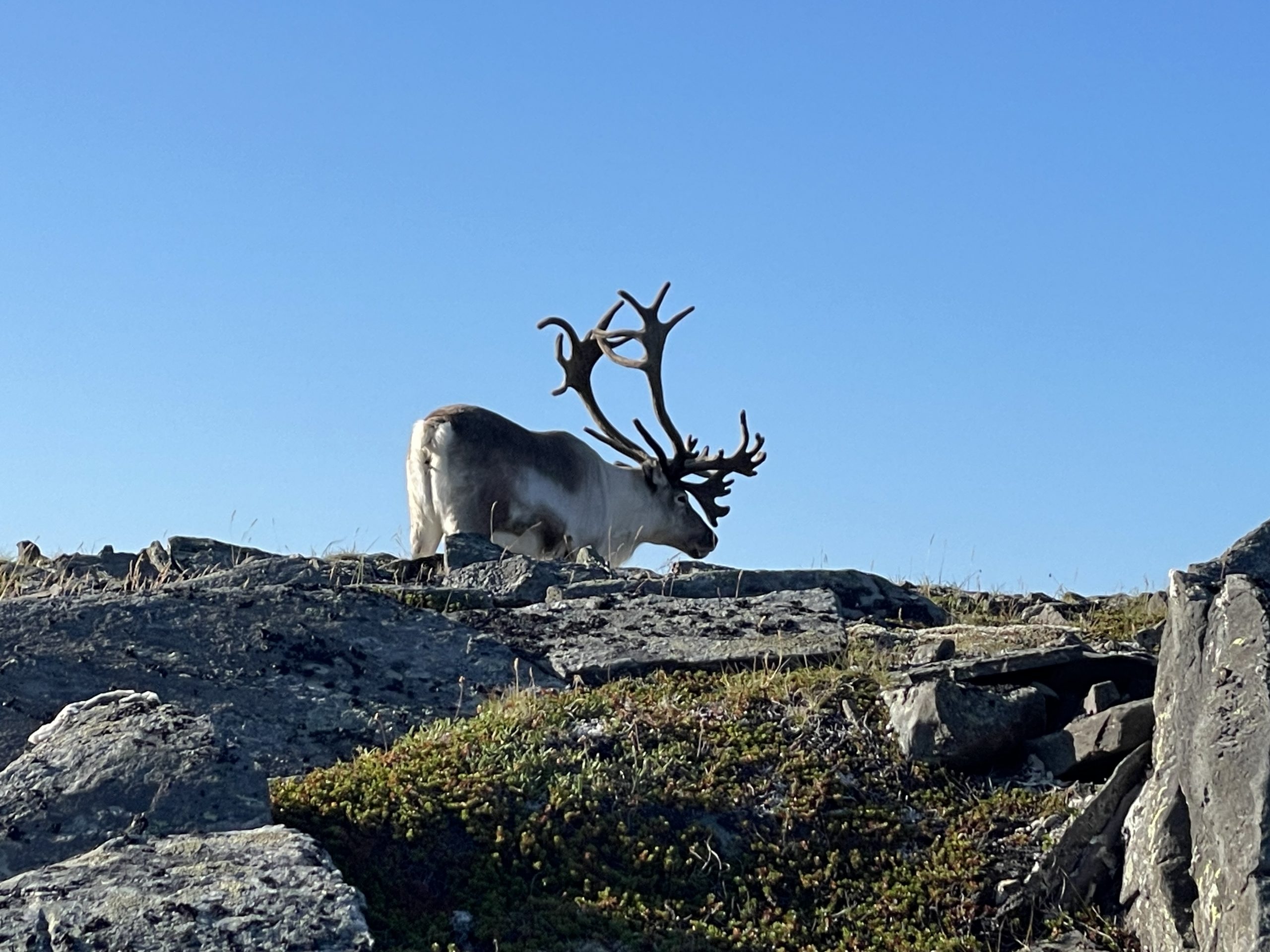 We found a marked path on the ridge of the headland and followed it to a small cairn at the end. Then turned around and followed this path back. We had a close encounter with some reindeer here. A local herd that is known to wander through the streets of the village. We sat and watched, even managing a few photos as they nonchalantly munched on grass and ignored us.