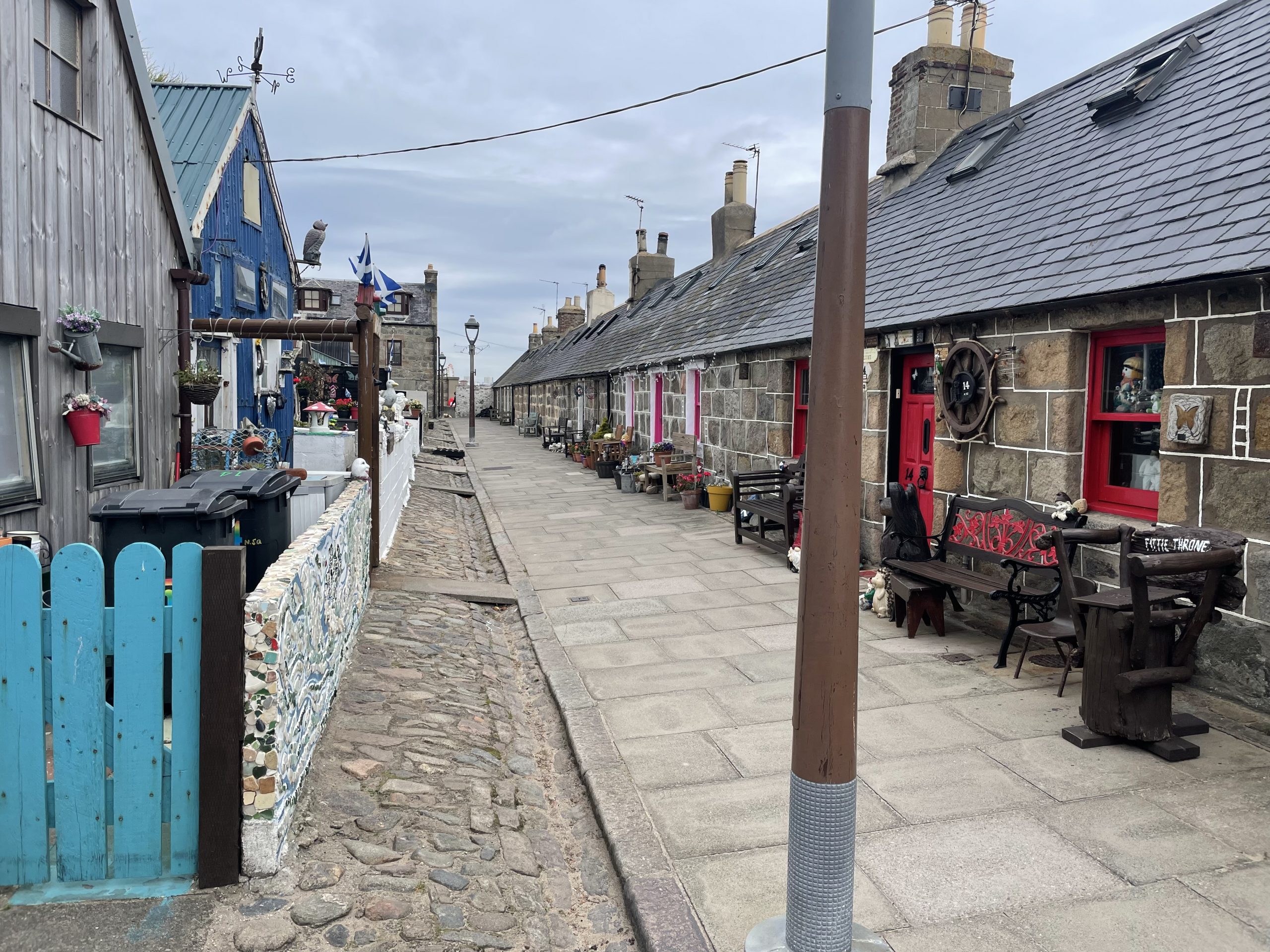 We started by visiting Footdee, or Fittee – depending on your preference – the origins of the name are a little confused, some people think it’s named for the ‘Foot of the Dee’ in reference to the river which joins the sea here, some think it’s named after St Fittick. Whichever option you choose to believe, this is an interesting bit of Aberdeen’s history. Originally a fishing village, the current houses were built in 1809 as a planned development to improve the housing of the fishing community. The single story houses with their backs protectively to the sea were then improved and added to over time. Some now have a second story and dormer windows. Sheds and outbuildings sit in the squares between the houses. Nowadays they have mostly been sold off to private ownership and there seems to have been a consensus that a certain eccentric artistic style would be adopted.