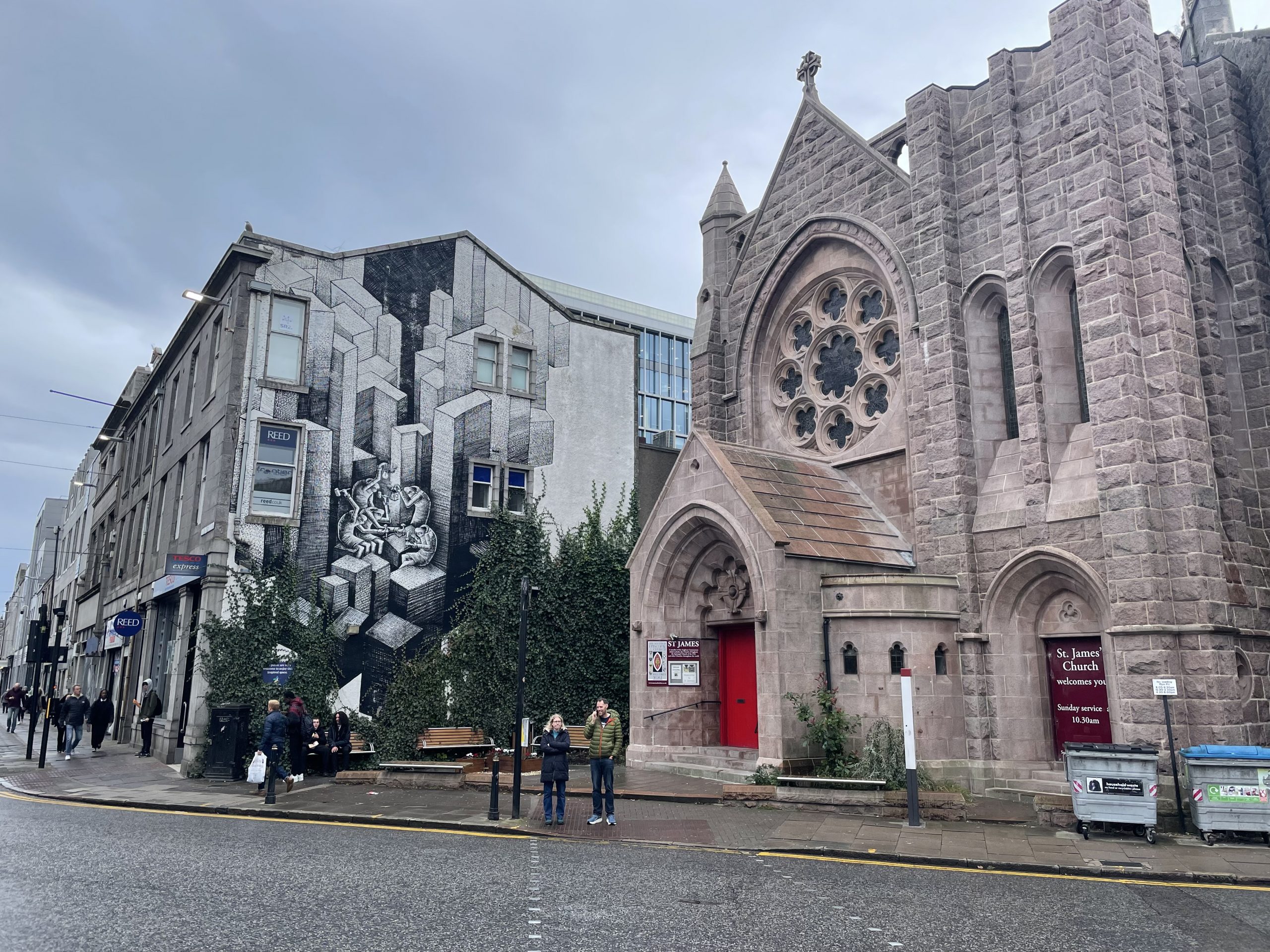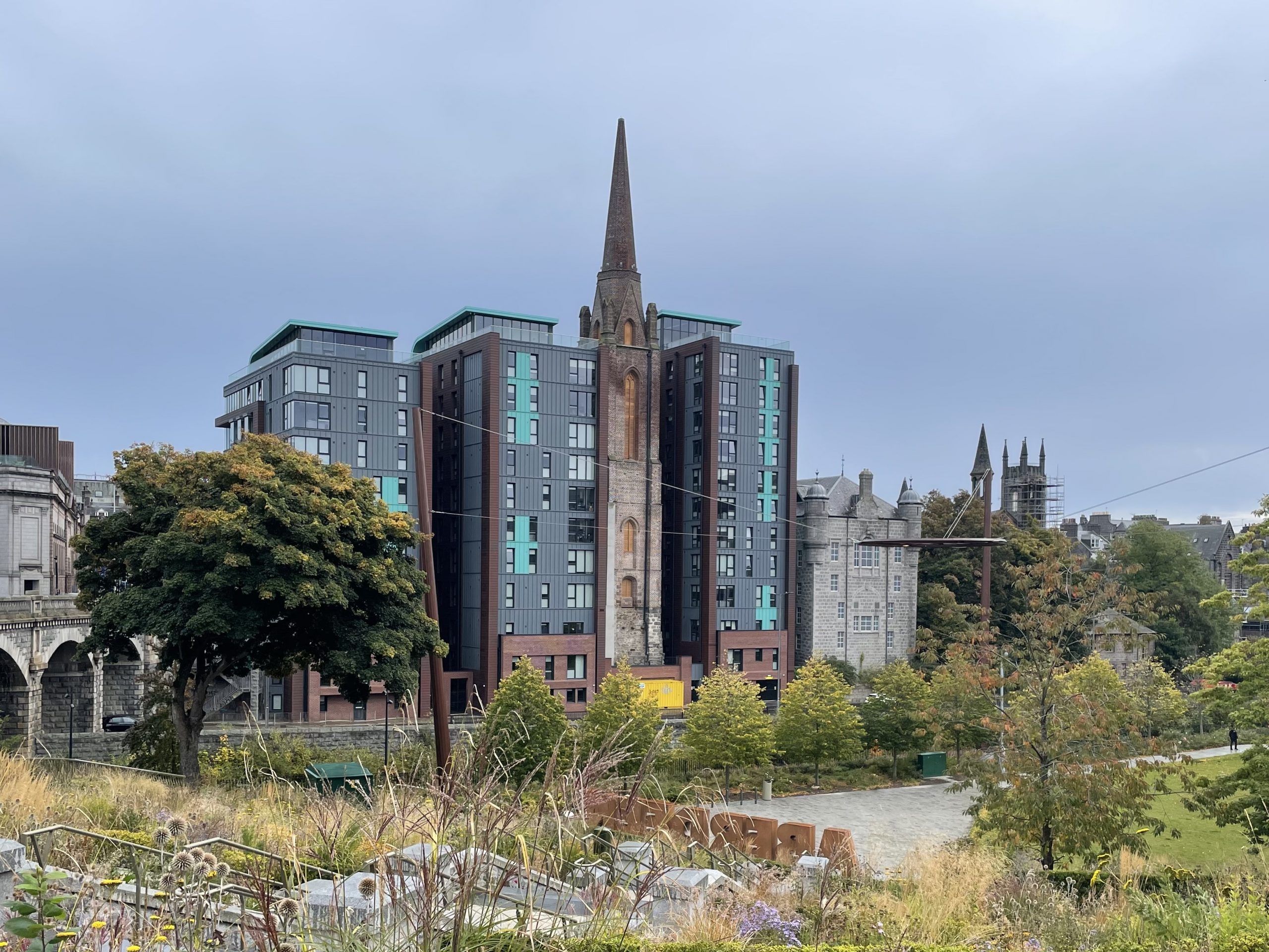 The recently re-opened Union Terrace Gardens were a sunken haven in the city centre. From here we could see the ‘Triple Kirks’, a listed building that was built in response to a schism in the Church of Scotland. One building with one spire was built to house three separate congregations, the spire was built in red sandstone as a deliberate contrast to the granite of the city. After falling into disrepair, a recent development was built around it.