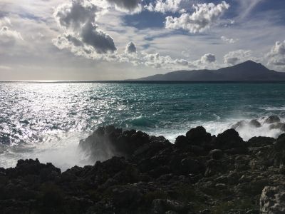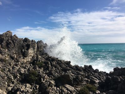 We walked along this easy section of path enjoying the sight of the waves crashing against the rocks and the dart and rustle of the many lizards that were basking in the sunshine. The views south showed headland after headland disappearing into the distance, the stony cliffs contrasting beautifully with the cerulean sea. It was possible to venture closer to the coast at points to watch the waves crashing against the spiny limestone rocks.