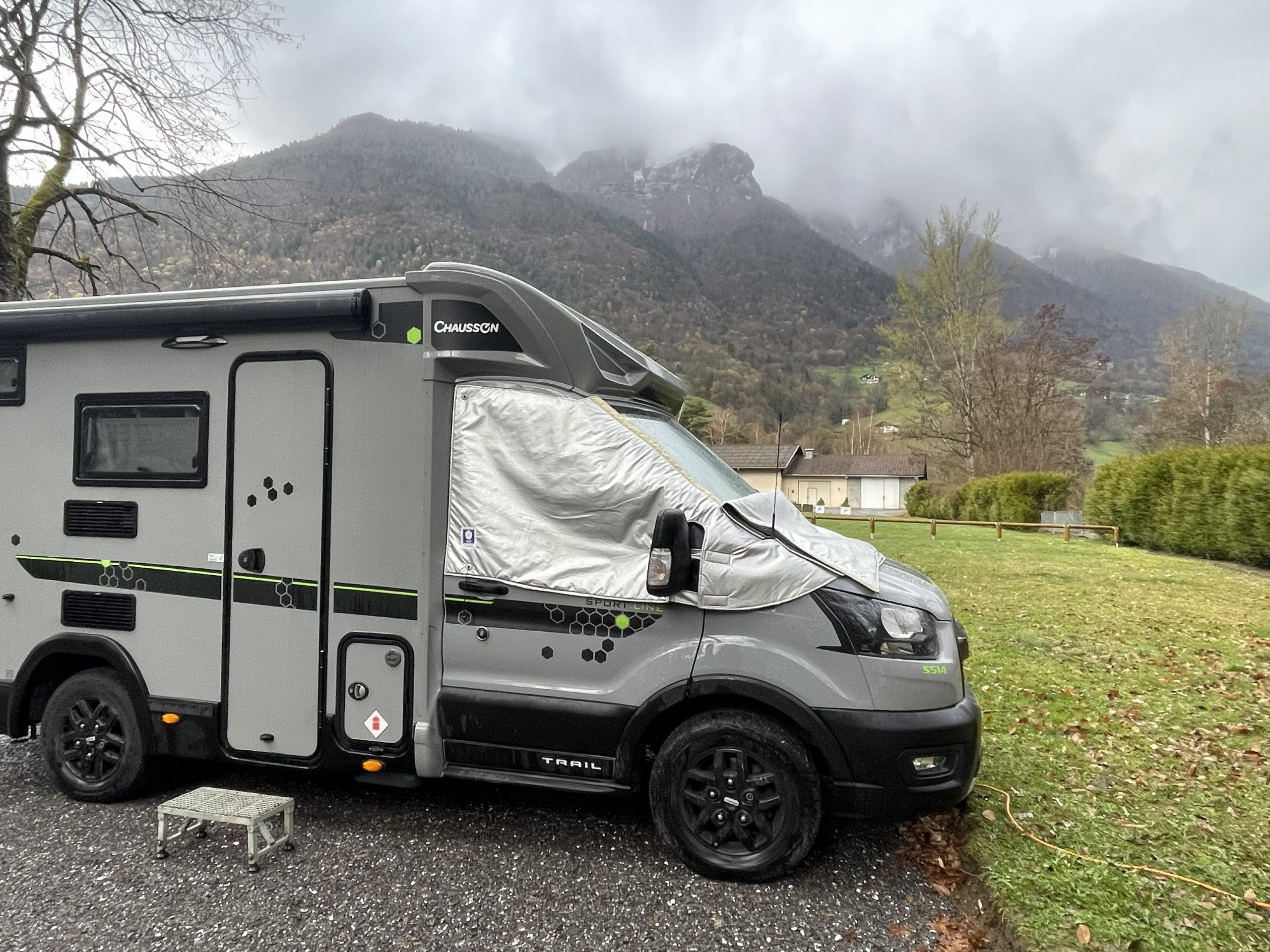 We took ourselves out for a leg stretch in the grey mizzle of the afternoon, it was a very quiet spot. The houses seemed mostly unoccupied – although I often find that French towns seem empty on wet weather days. A lot of the businesses on the industrial park were directed towards boat owners. No surprise as we were only a few kms south of Lake Annecy.