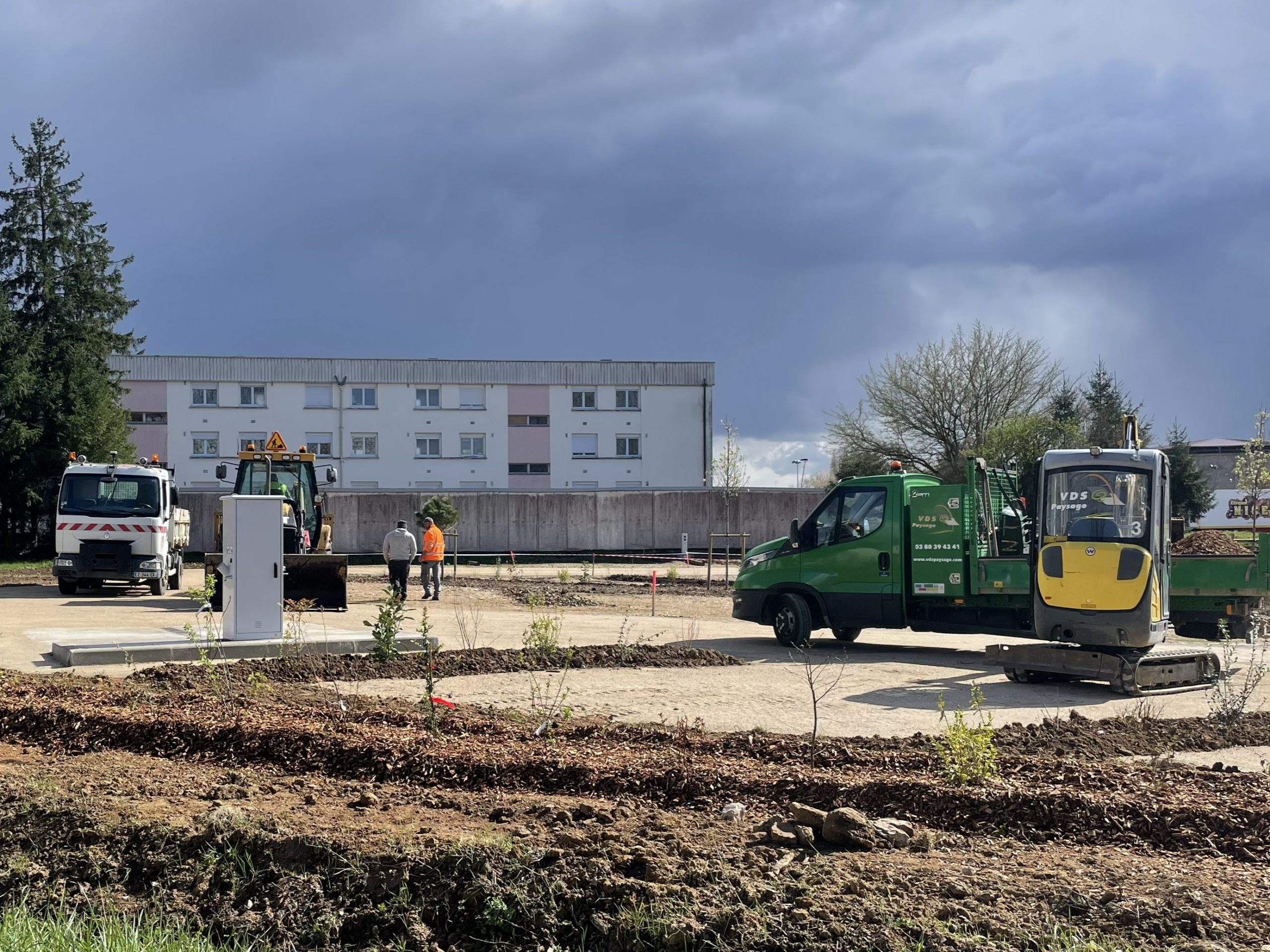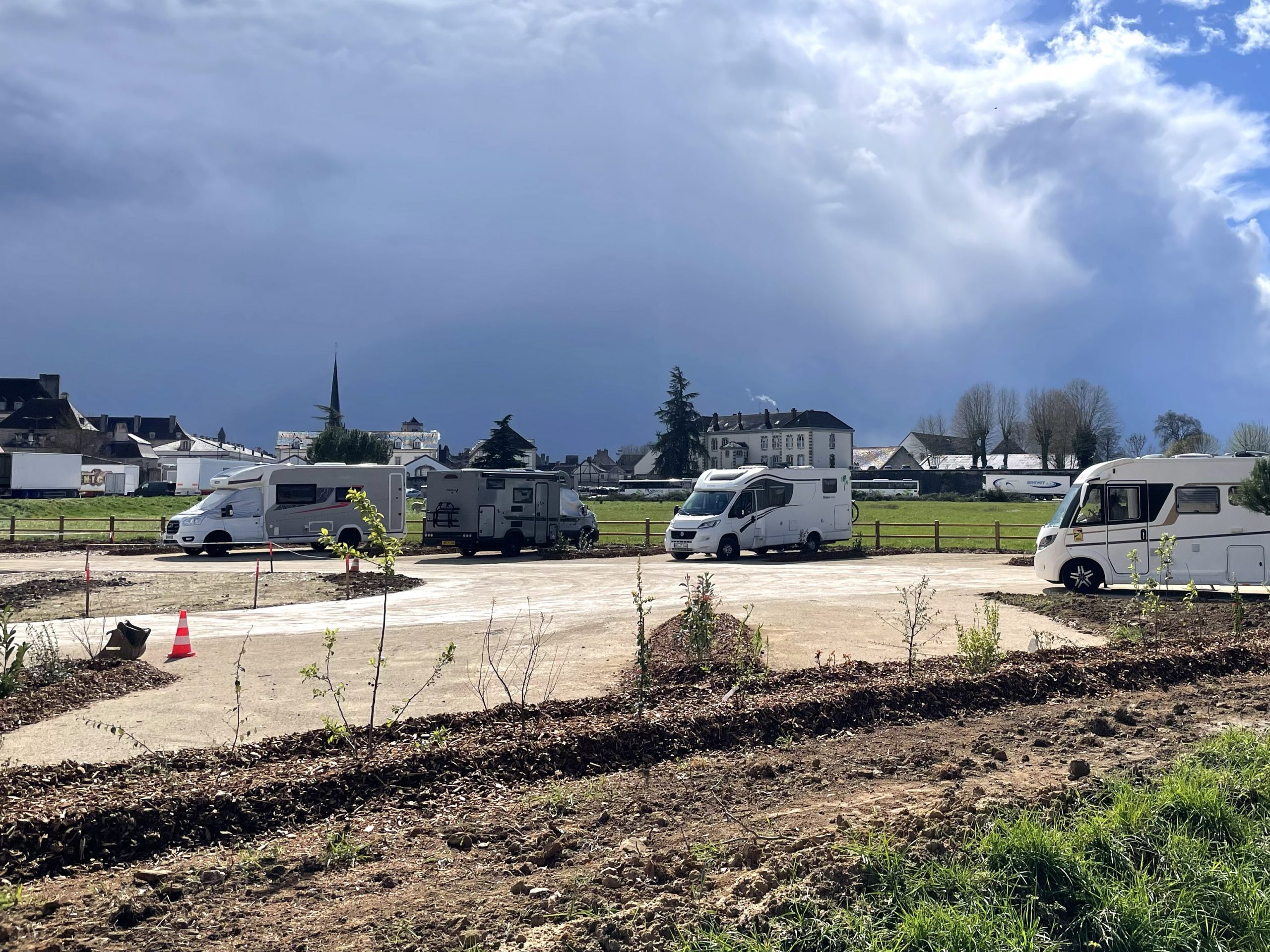This aire was so new (or at least newly adopted by CCP) that it was still being worked on. We arrived to find a mini digger and several workmen laying gravel and tidying up the shrubs and beds between the pitches. Several pitches were roped off waiting to be levelled out.