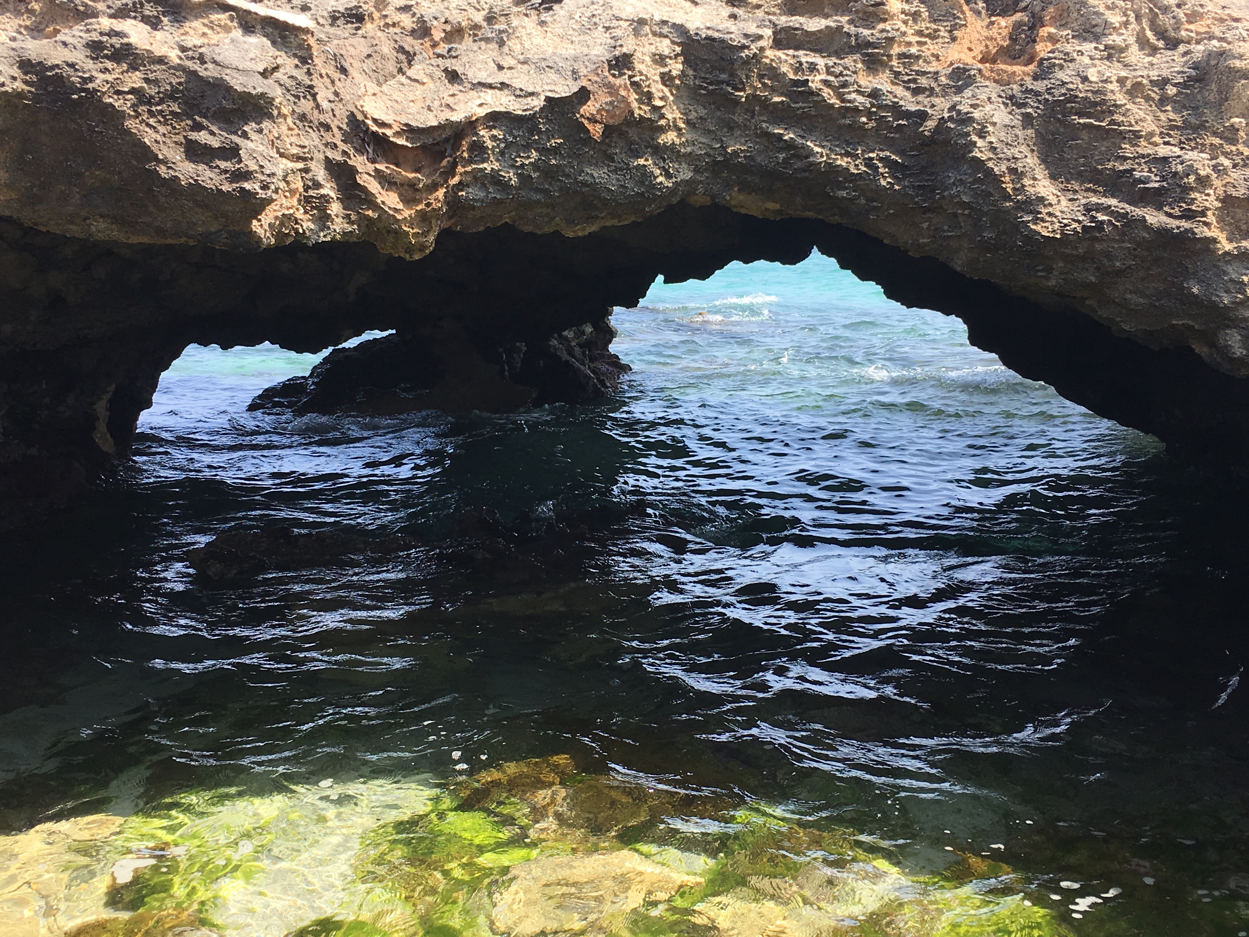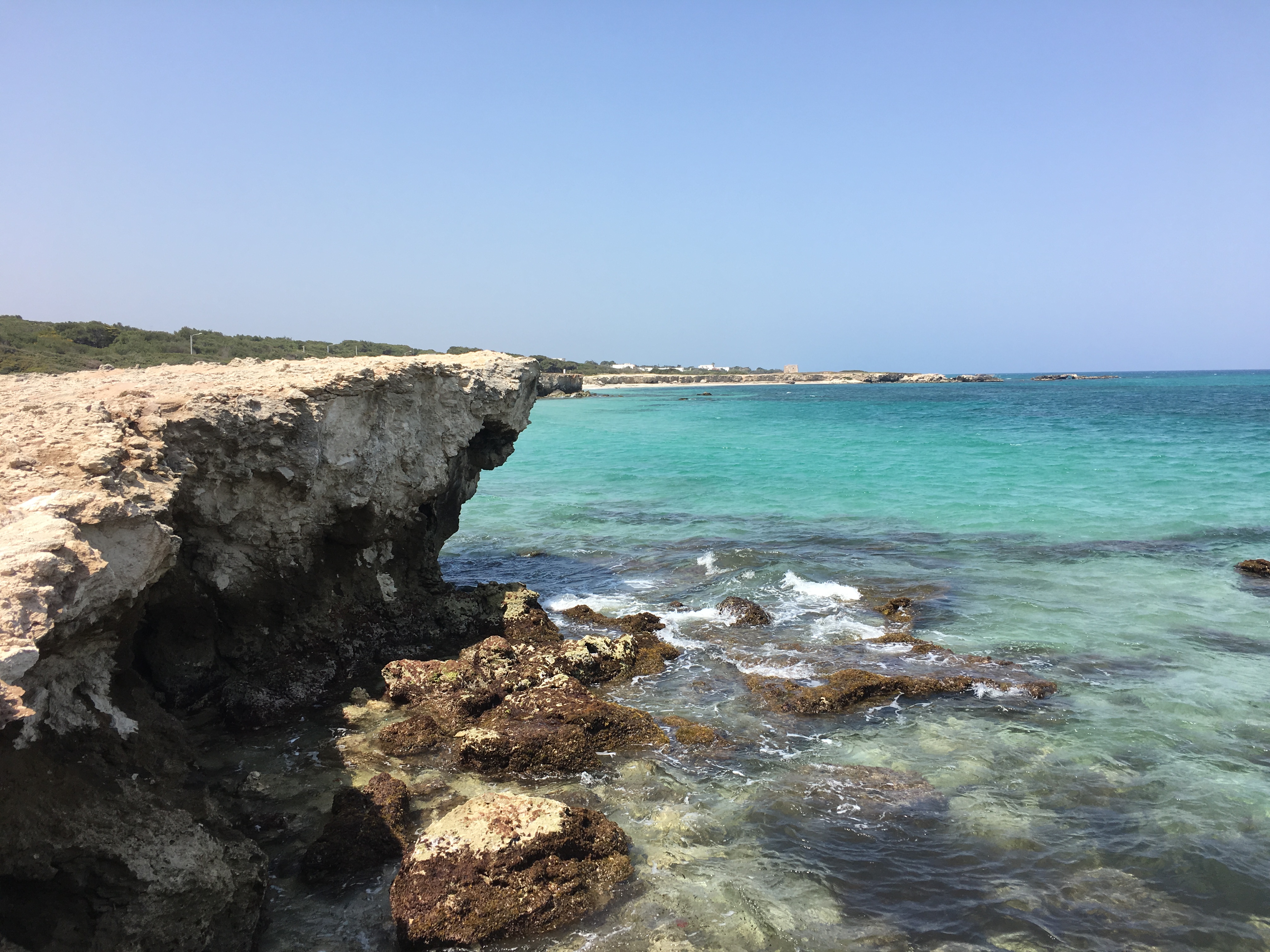 South of the nature reserve we were able to cycle alongside the coast, sometimes on the road and sometimes over the top of the low rocky cliffs. The sea was a vibrant blue, the coast was eroded into small arches, caves and holes. We stopped for the obligatory dip/paddle before turning around and heading back the way we had come.