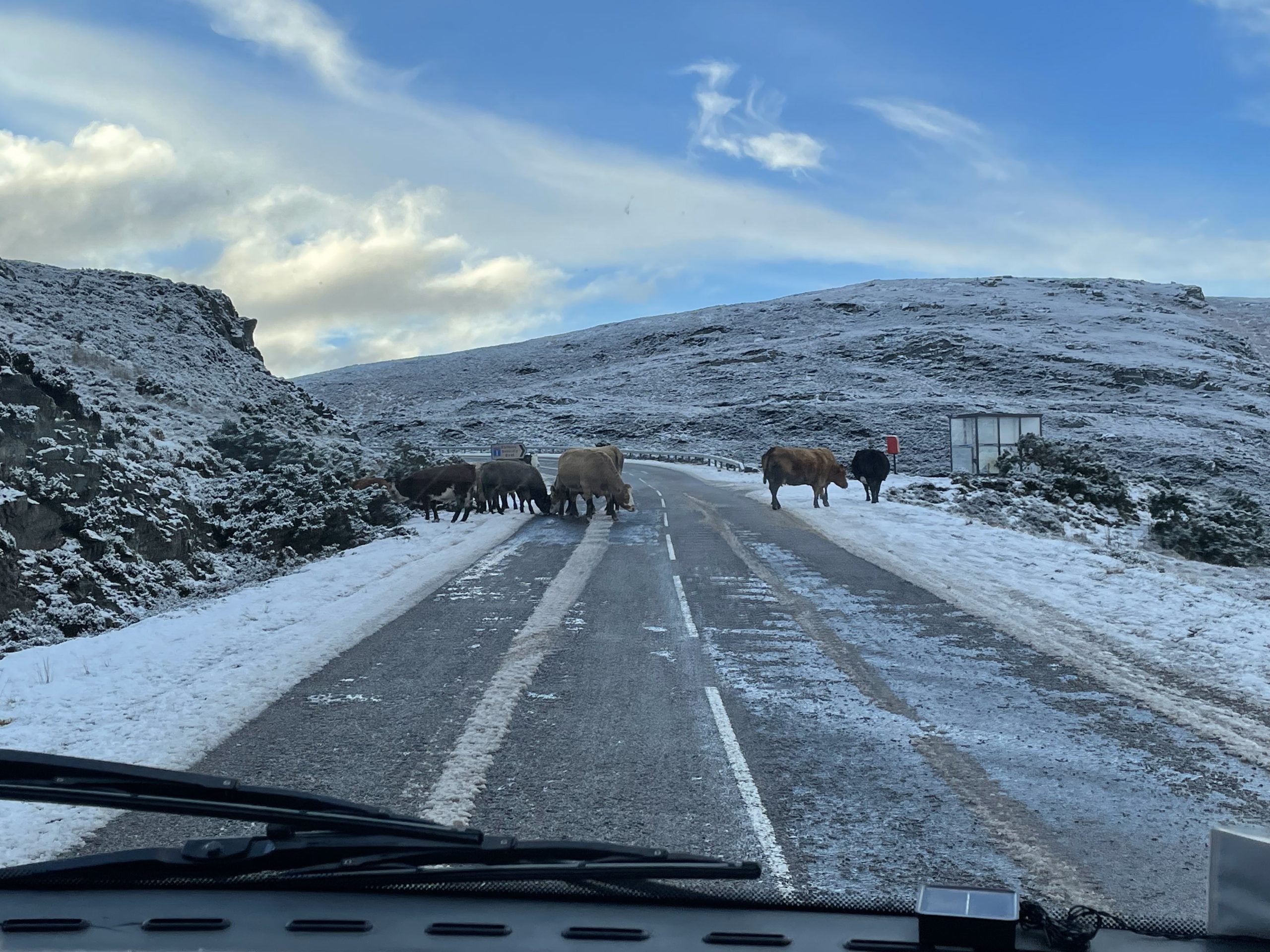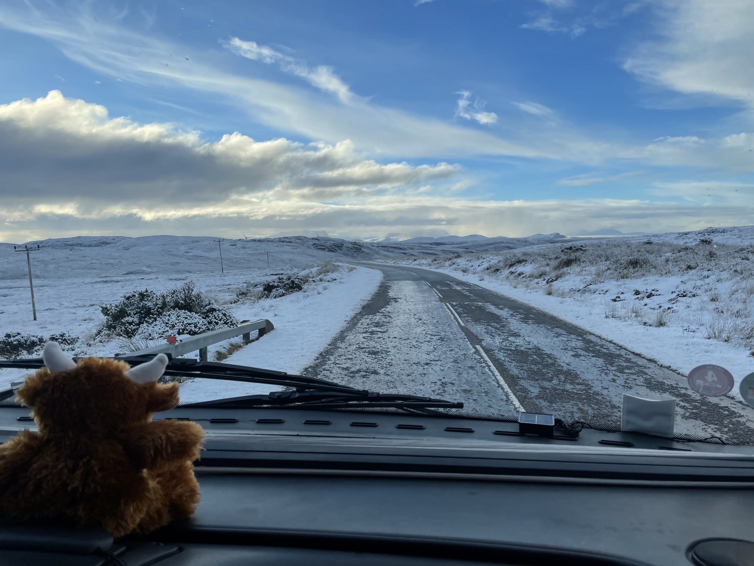 As we headed further west towards higher country the amount of snow around us increased. The road was salted and the surrounding vegetation snow shrouded. We were heading to Torrisdale where we wanted to walk around the bay. As we dropped down to the estuary of the River Naver where our parking spot was meant to be we found it full of road maintenance vehicles. Works were happening next to the bridge, maybe a new bridge or widening. Whatever was happening we couldn’t park there.