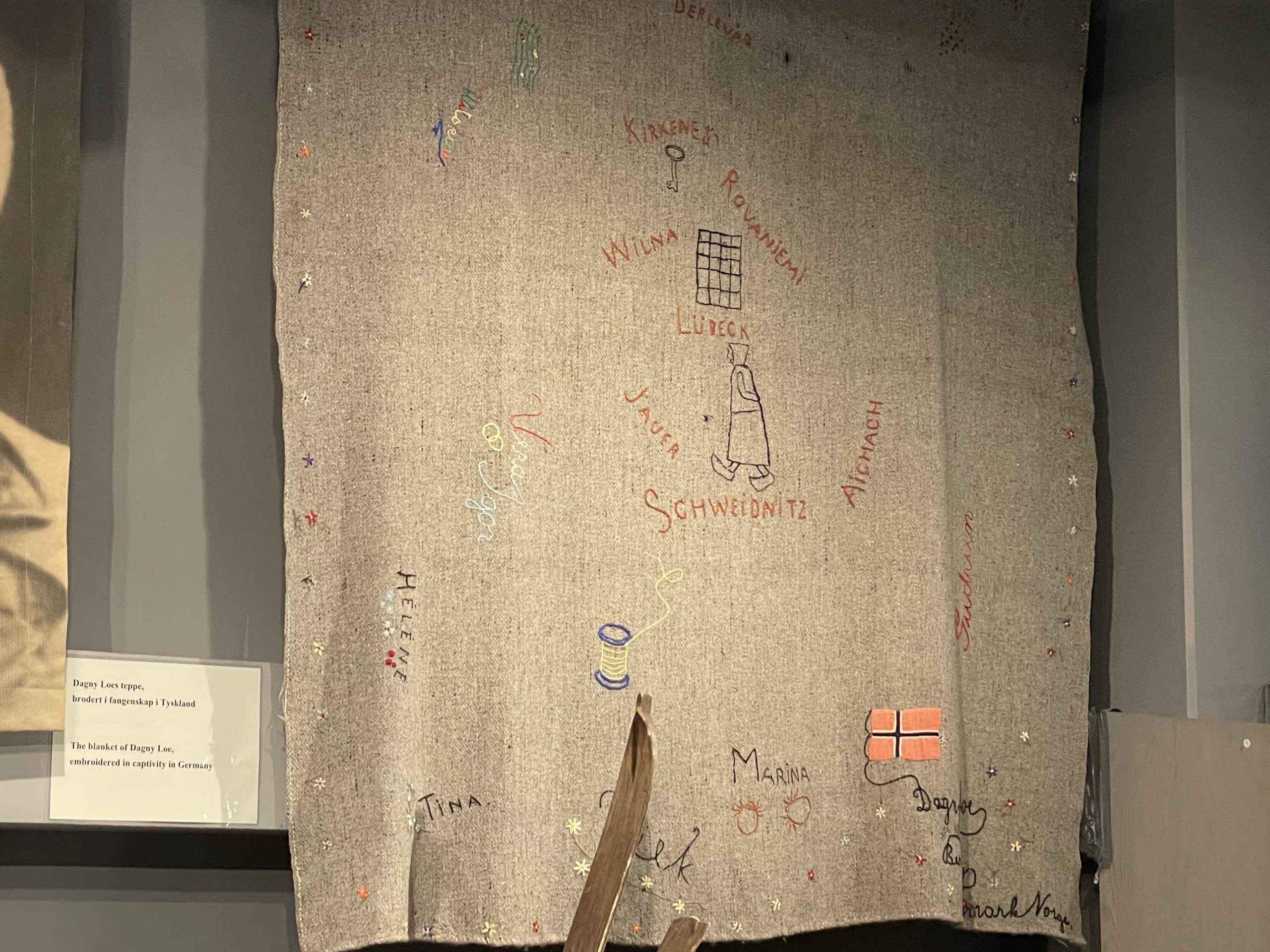 - Blanket of Dagny Loe. Her husband, a partisan, was killed, her newborn baby died and she was imprisoned in Germany. She embroidered this blanket while in prison, never expecting to return to Norway.
