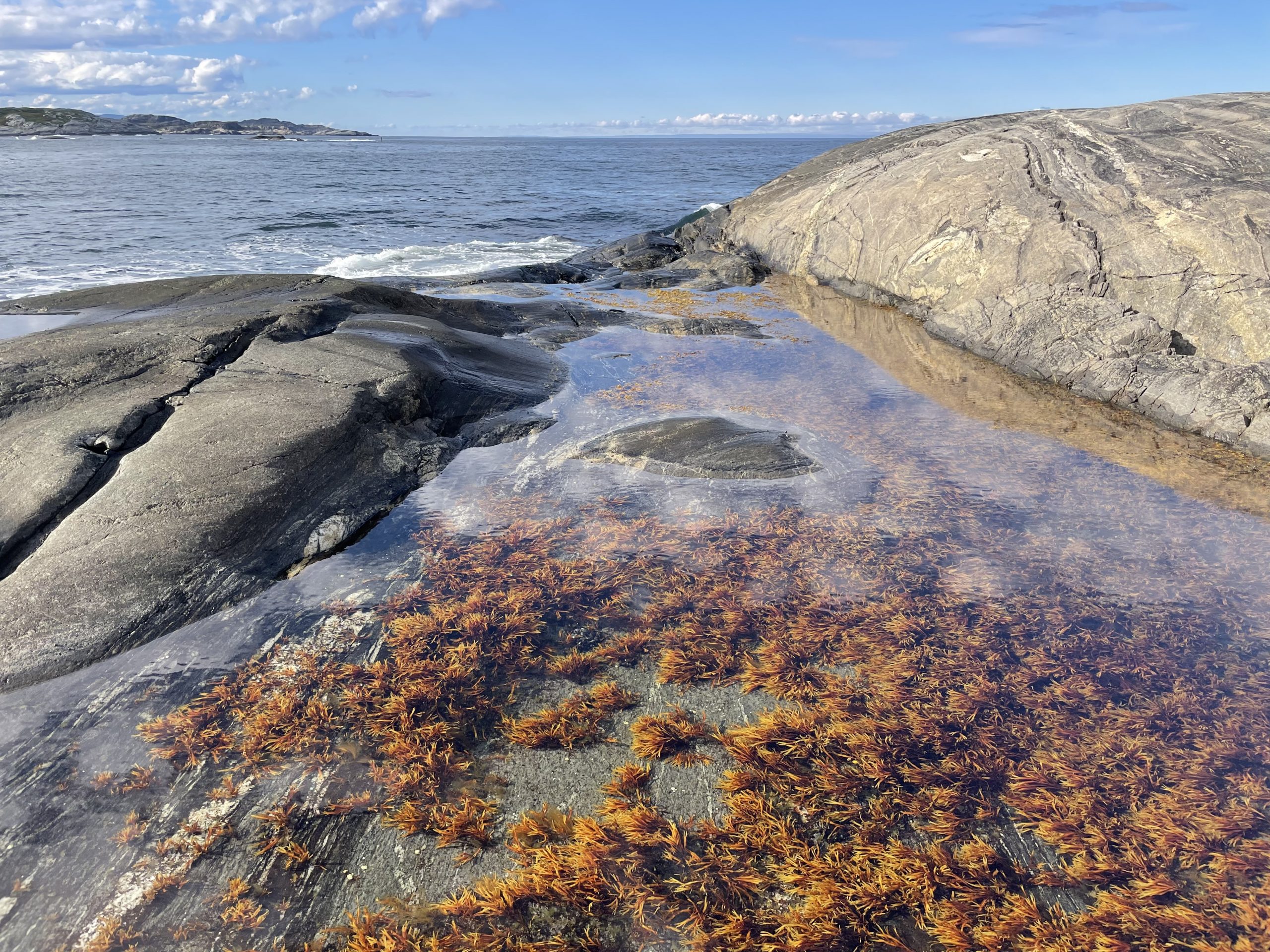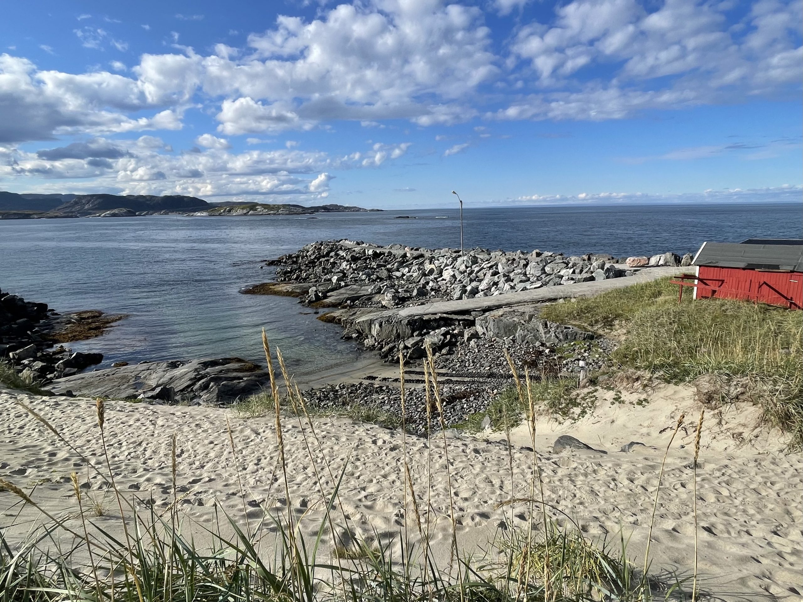 Finally the road reached the sea at a small harbour, with deteriorating concrete providing a desultory protection from the sea. A curve of beach and plenty of low rocky coastline made a pleasant outlook. We parked up the van and went out to clamber on the rocks and see what was around. The boat association hut was closed. There was a shelter where border guards were sitting eating their lunch around a firepit. They waved hello, we couldn’t tell if they were the same people we’d seen earlier.