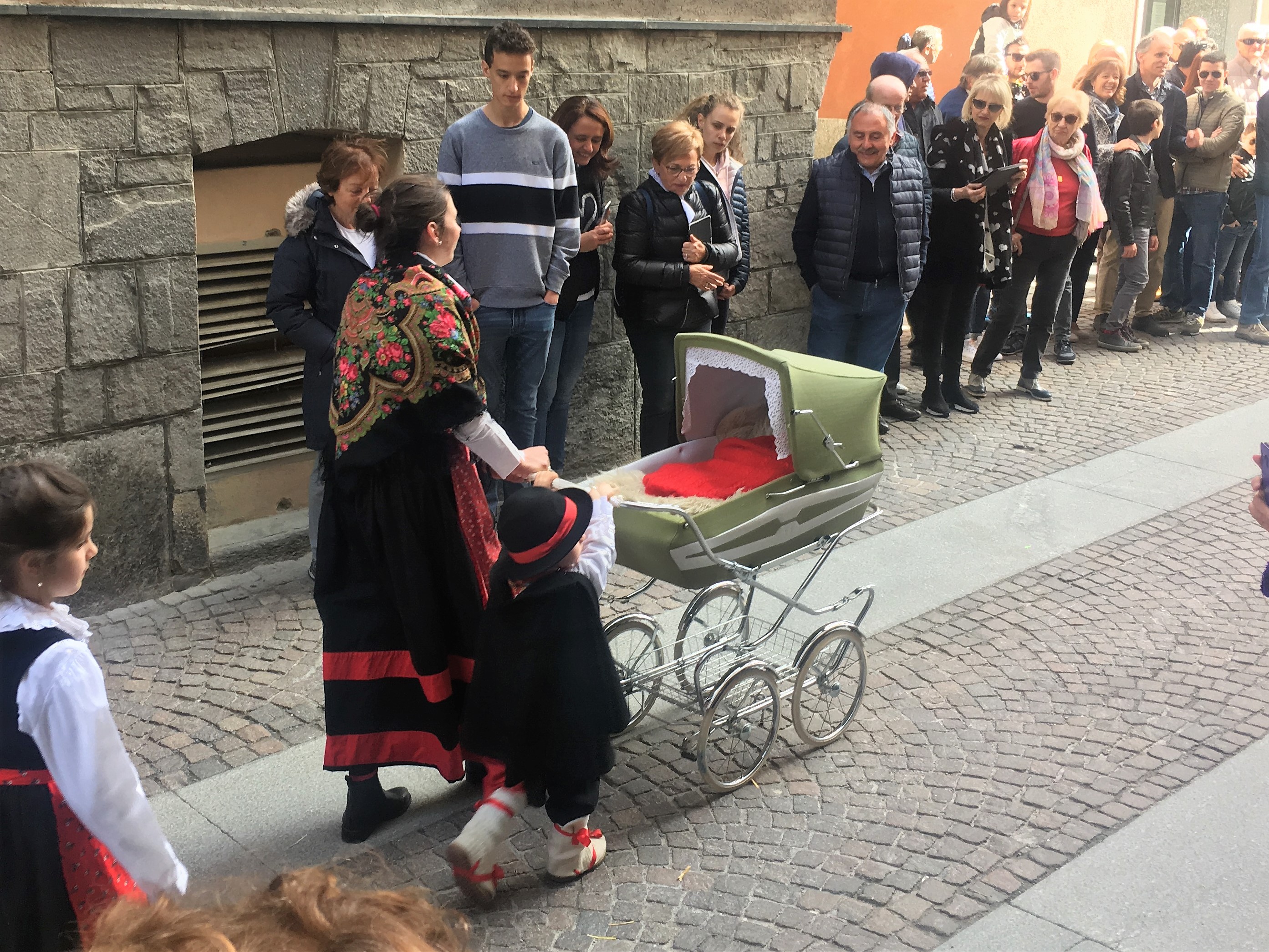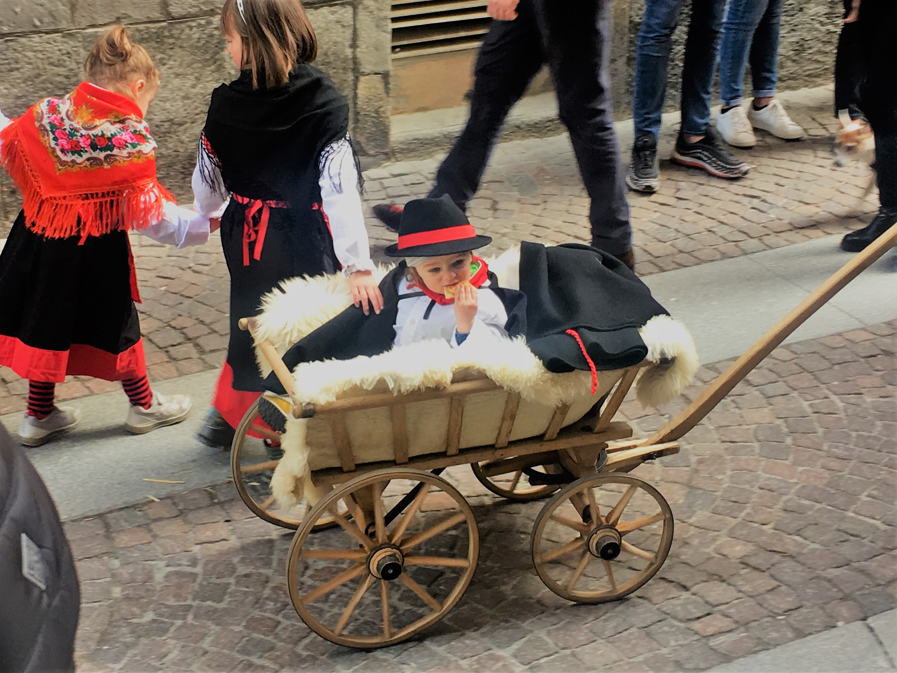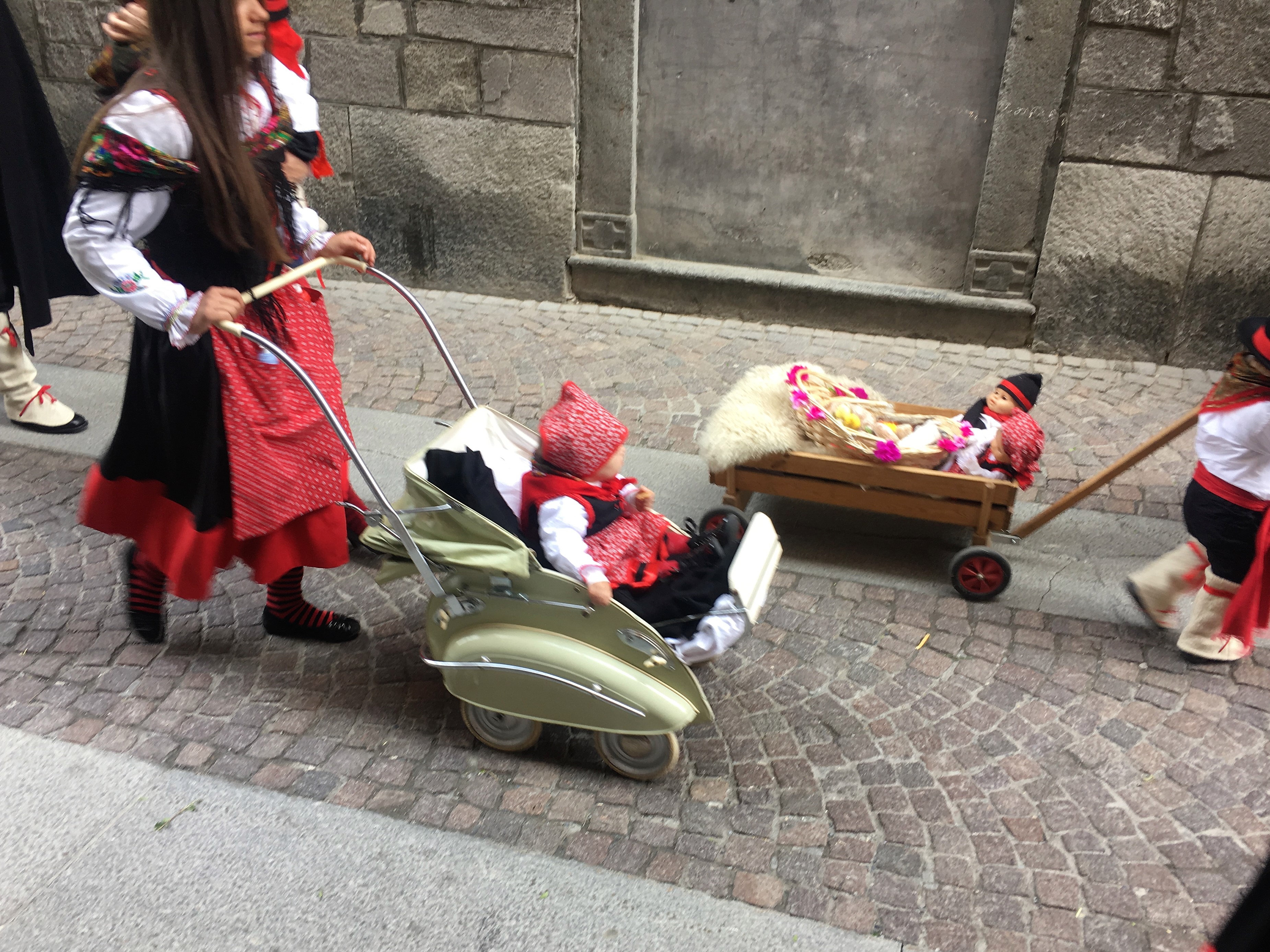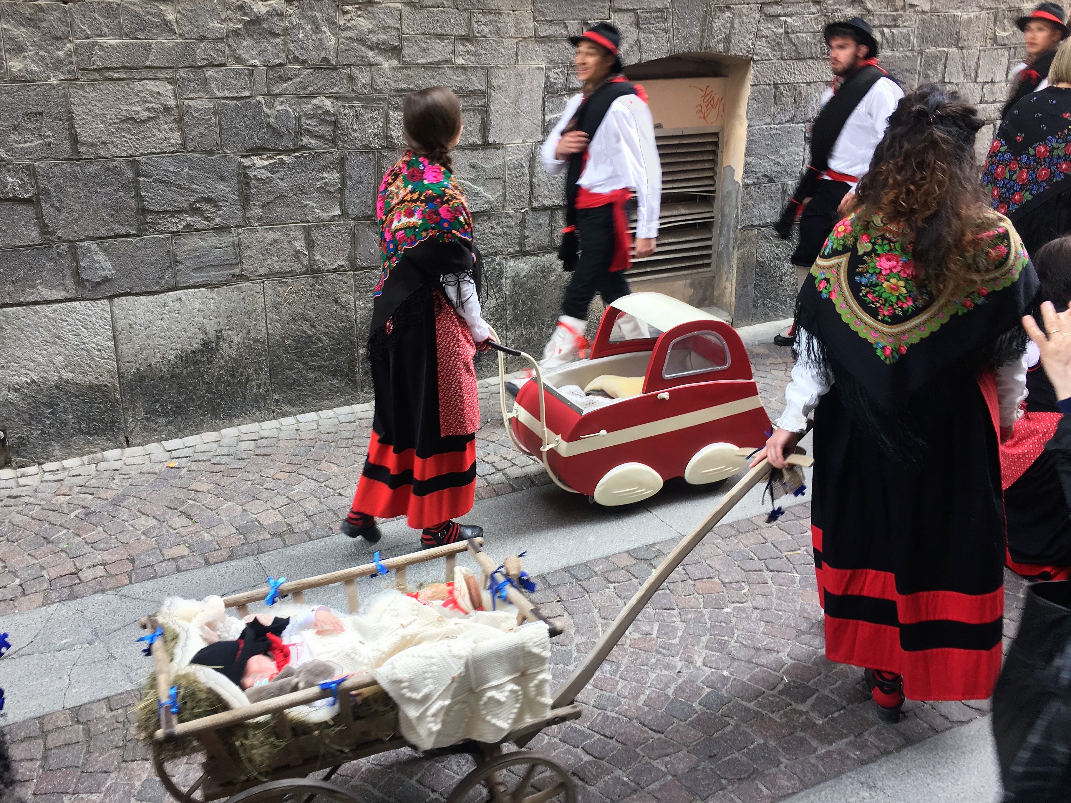 On the Sunday our attention was taken up with the Easter parade so we had little time to think about what next. The Easter parade in Bormio is a traditional affair with each province of Bormio fielding one or more groups. Each group follows a pattern as it parades the medieval town centre, first the babies and toddlers are wheeled through the streets on carts padded with sheepskin or in antique prams.