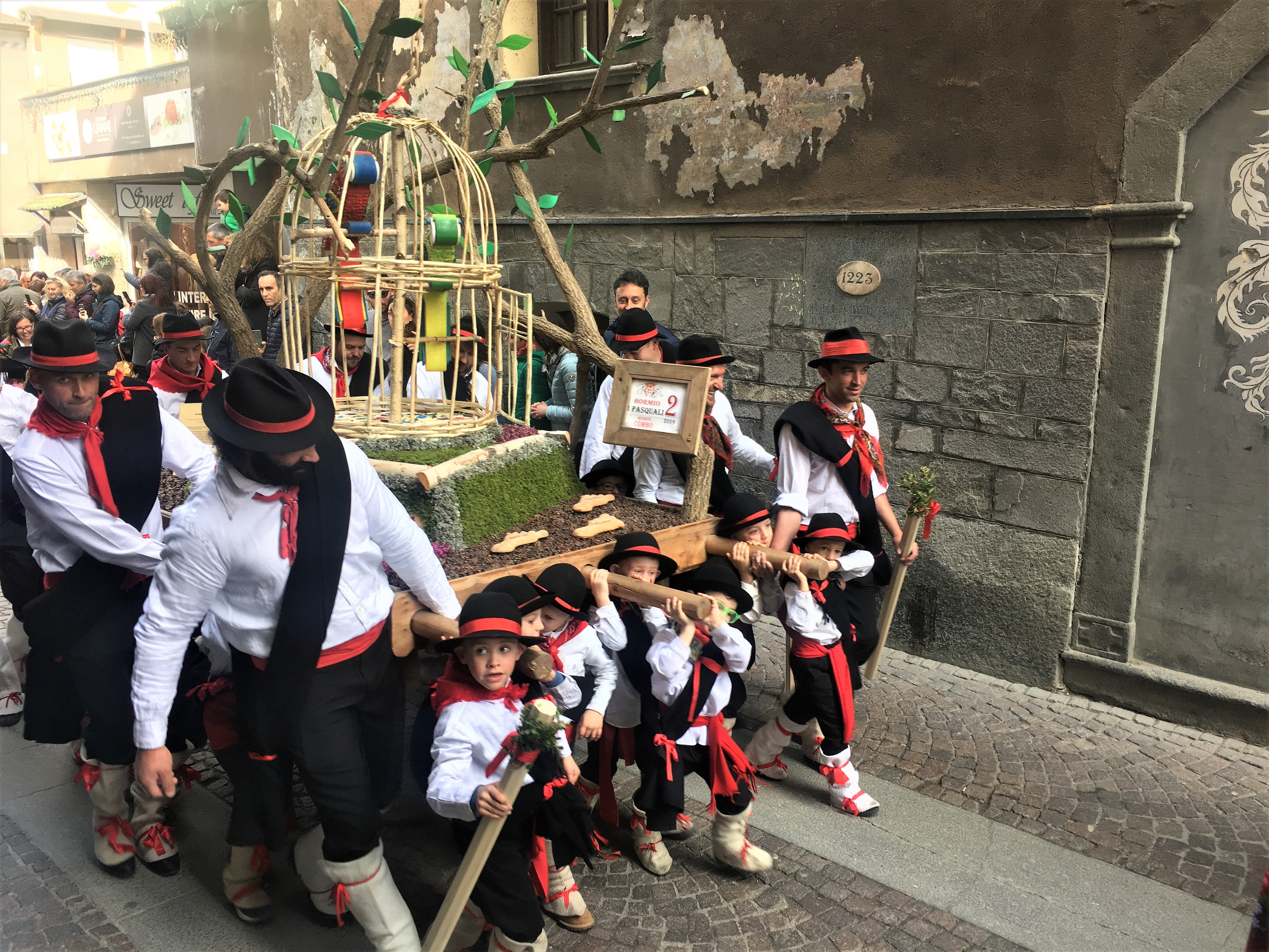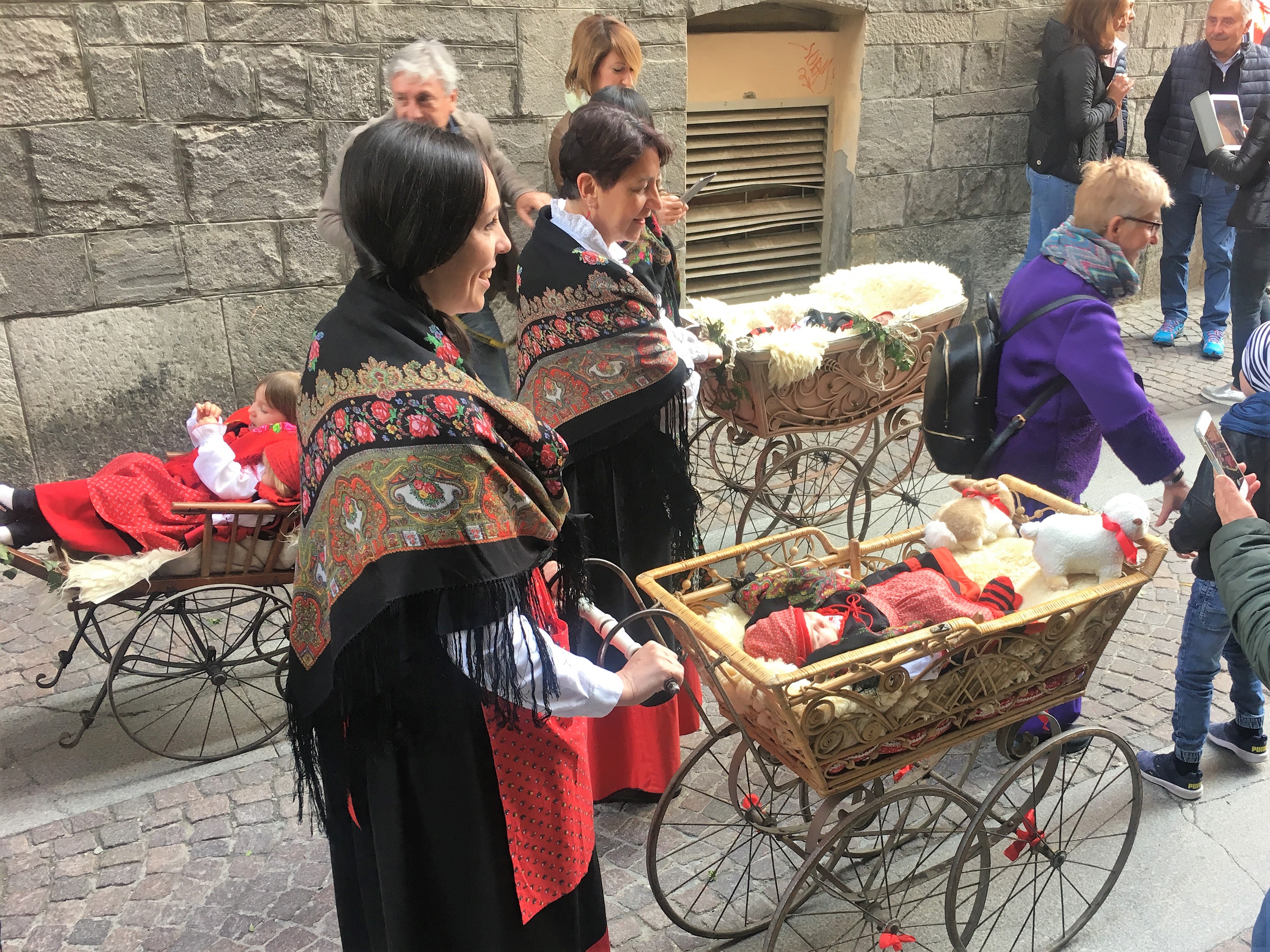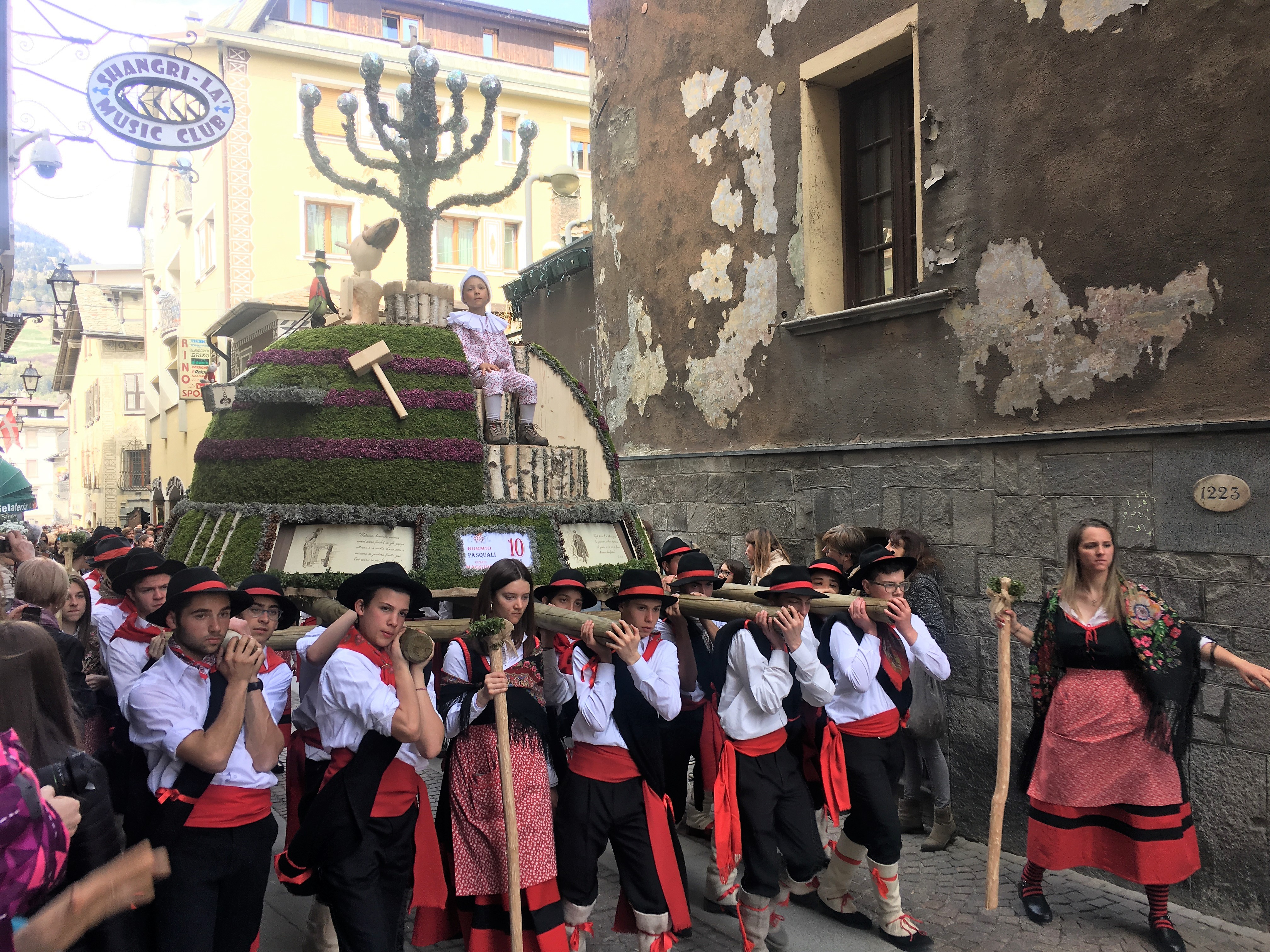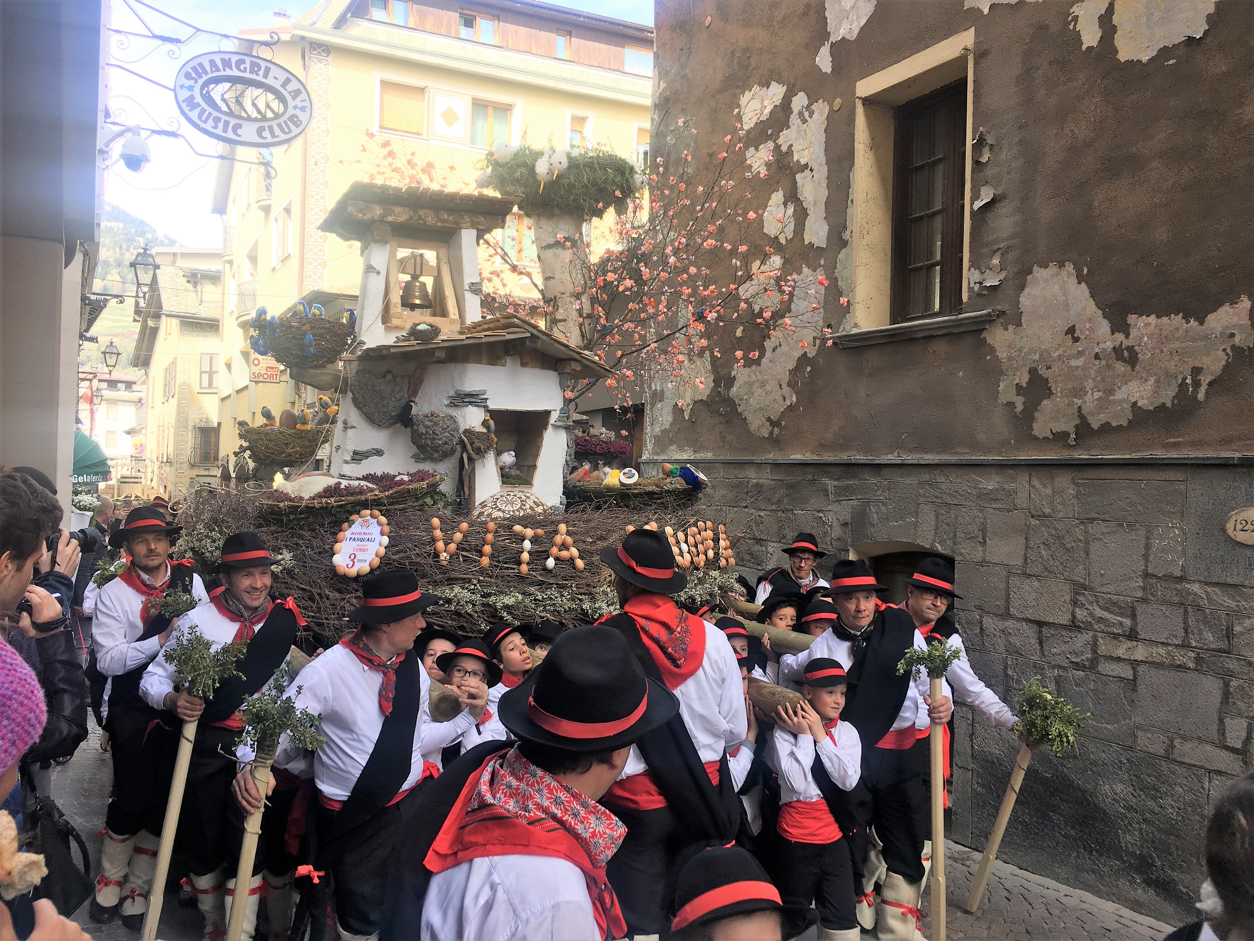 On the Sunday our attention was taken up with the Easter parade so we had little time to think about what next. The Easter parade in Bormio is a traditional affair with each province of Bormio fielding one or more groups. Each group follows a pattern as it parades the medieval town centre, first the babies and toddlers are wheeled through the streets on carts padded with sheepskin or in antique prams.