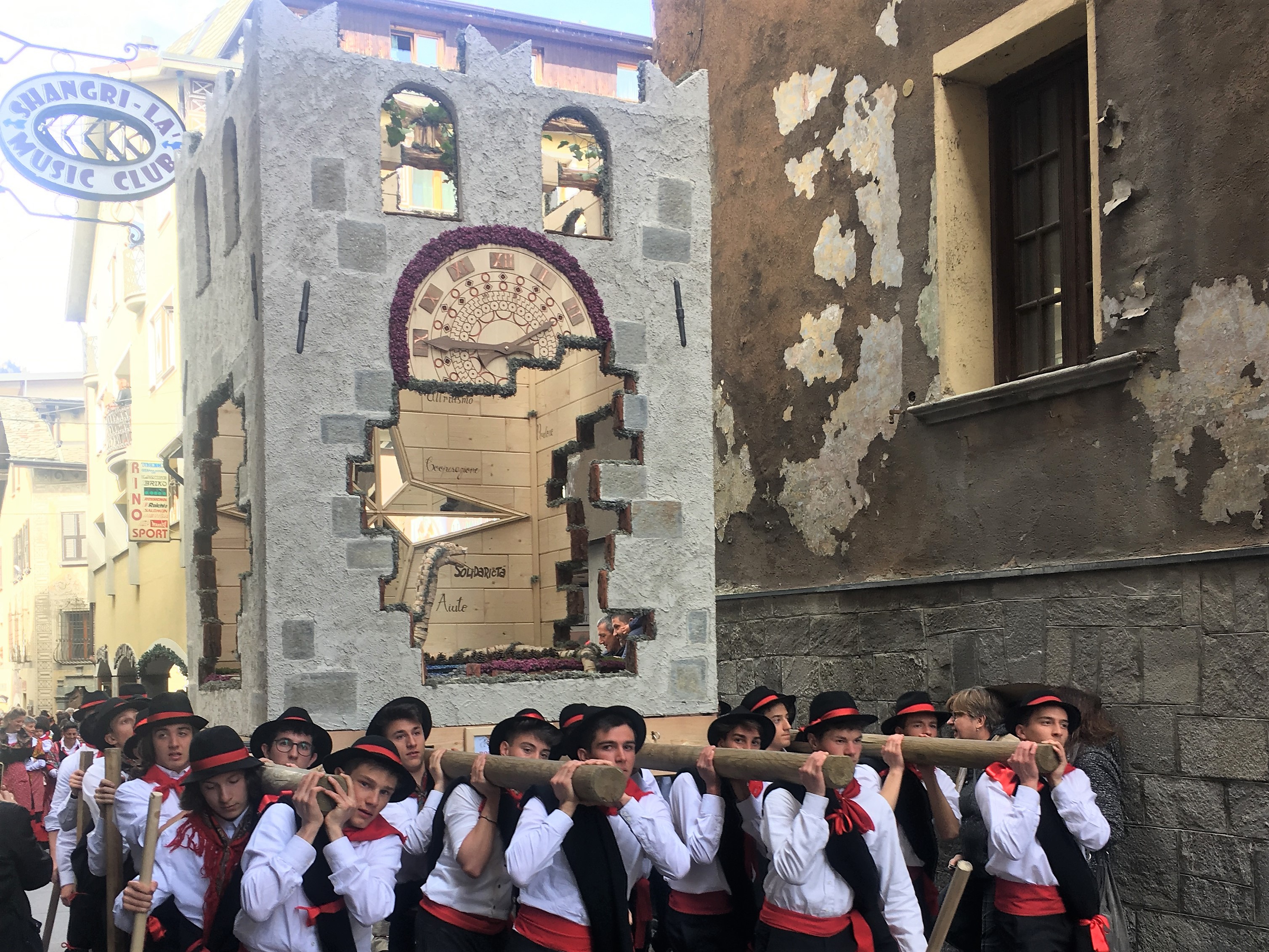 Then the float – the Pasquale – arrives, borne up by the men and boys of the group who carry the handcrafted wooden structures through the narrow streets on a litter made of tree trunks with the narrowest of margins to allow them to manoeuvre past the buildings, street signs and balconies.