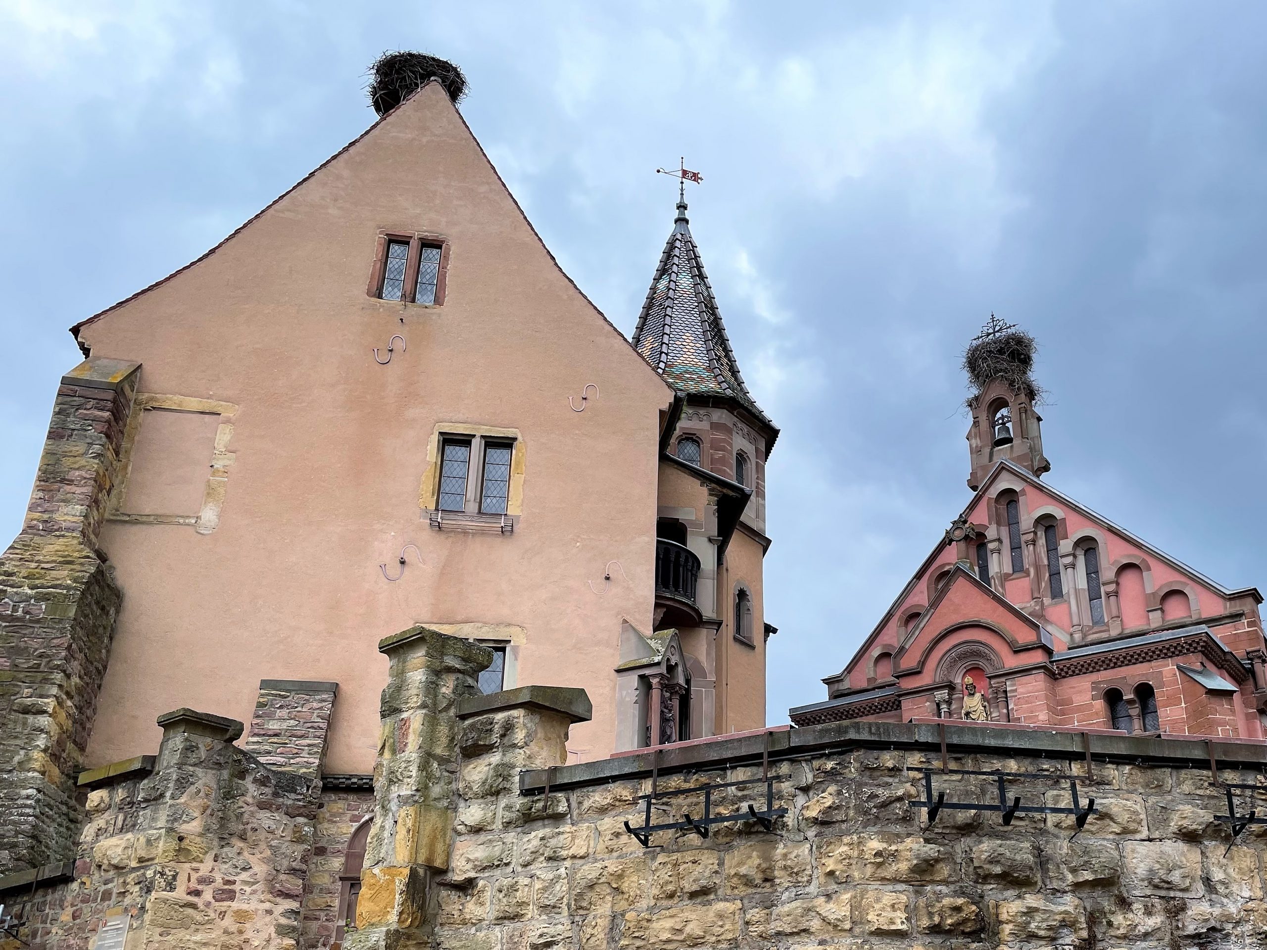 As well as being famous for wine, the area is also famous as a nesting place for Storks. In Gruyeres the town had been named after the bird, but here in Eguisheim we could actually see them. We saw them gliding over the vineyards from our motorhome window, and we could see their nests on the towers of the town. As we were walking around we only needed to look for groups of tourists looking up to the tops of buildings and we knew that we were in with a good chance of seeing storks on their nests.