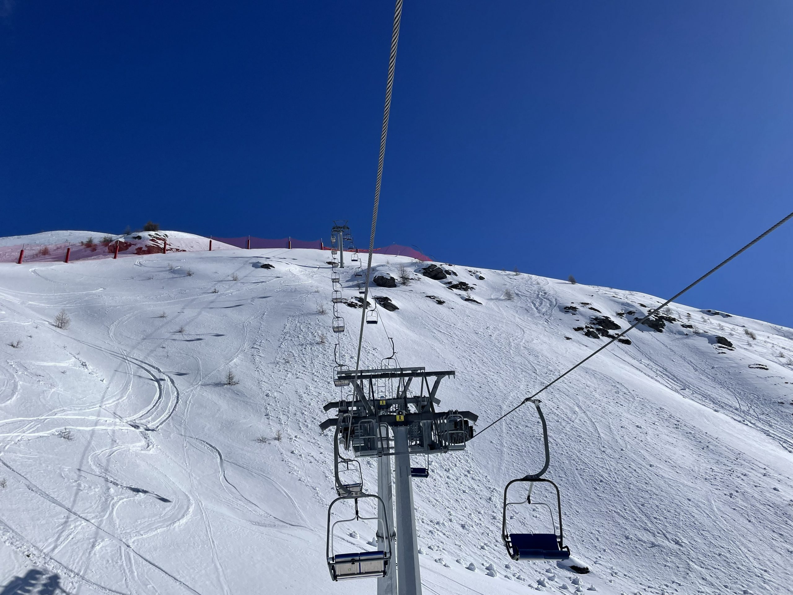 From the top of the gondola it is a short walk to the first chairlift. The skiing in Chamois is lovely and sunny and when other areas might be closed due to high winds, Chamois is usually open due to it’s shelter from three directions.