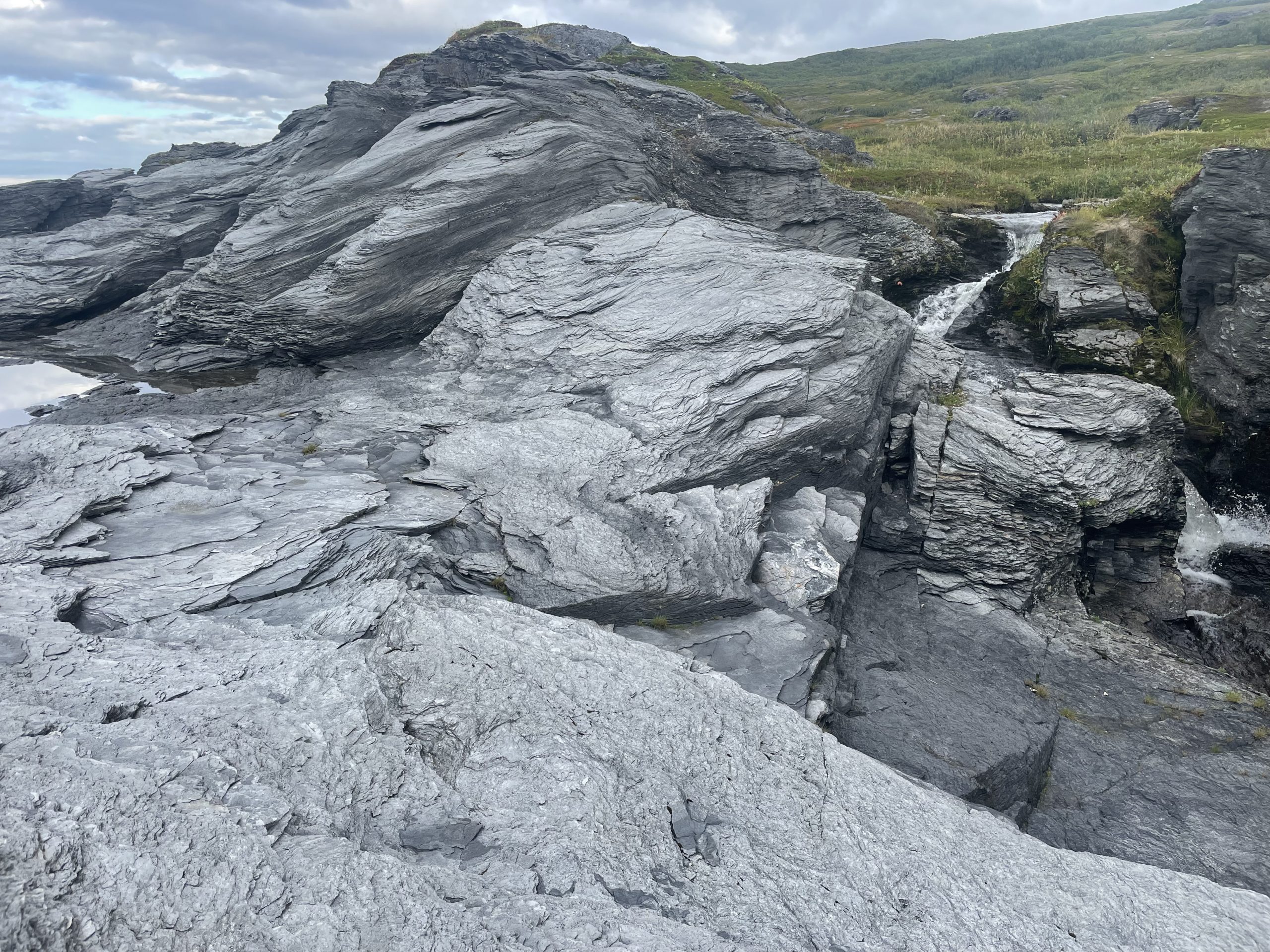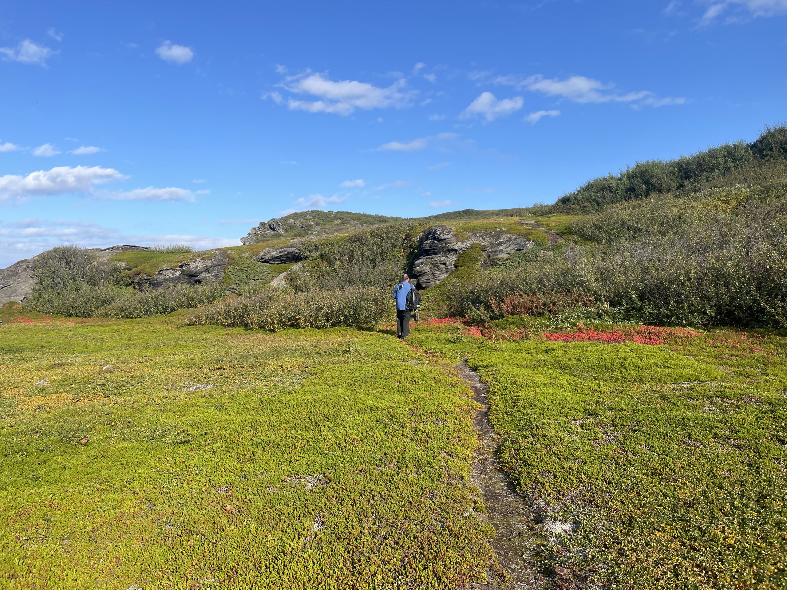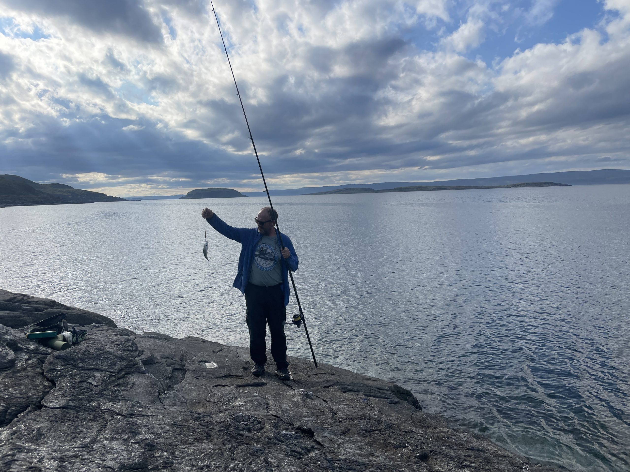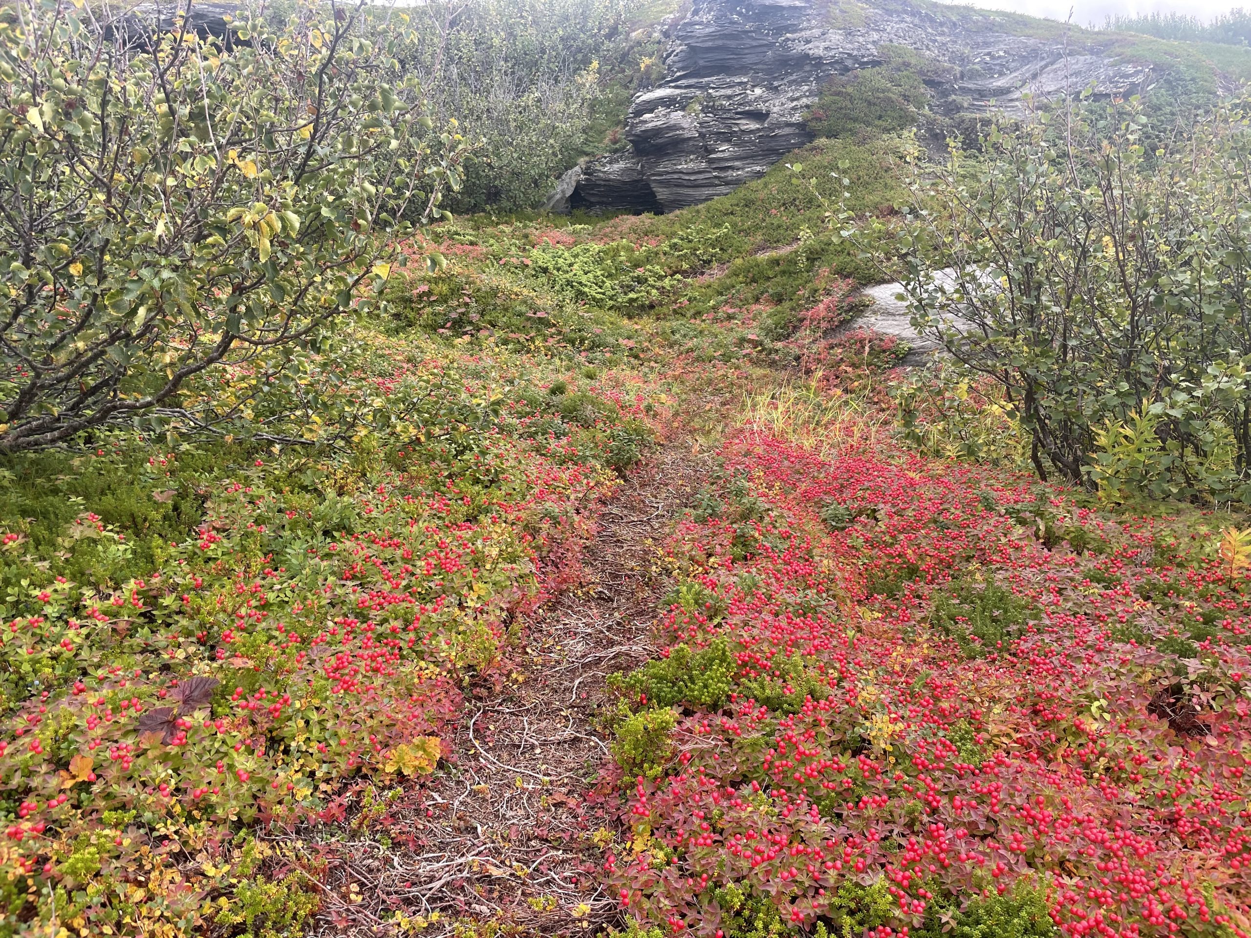 After Ilfjord we had a stretch of coast where Paul had to stop numerous times to assess the fishing opportunities. The rock here was shining contorted schist. The layers crunched and crumbled under our feet as we walked down to the shoreline. The autumn colours were adding some spice to the view and even though Paul didn’t catch anything big enough to eat, I was able to pick enough berries to add to my yoghurt in the morning.