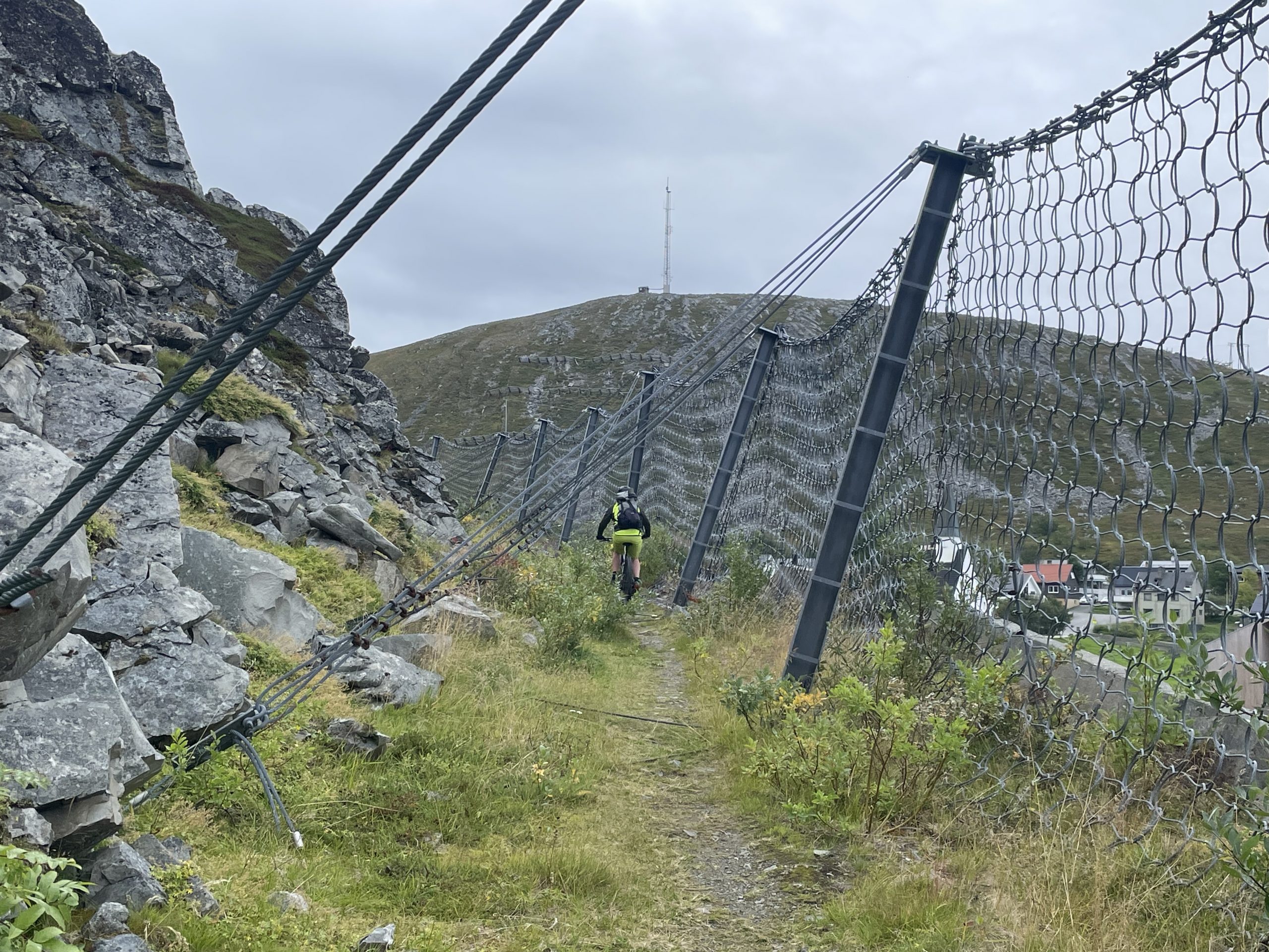 Our bike ride first took us up behind the strong netting that protects the village from falling rocks from the steep and fractured cliffs. Then we followed the track all the way to the village. It wasn’t difficult but there was enough uphill to give our lungs a workout. Across the plateau of the headland we saw more reindeer, footpaths veered off to the side but looked to rocky to contemplate cycling.