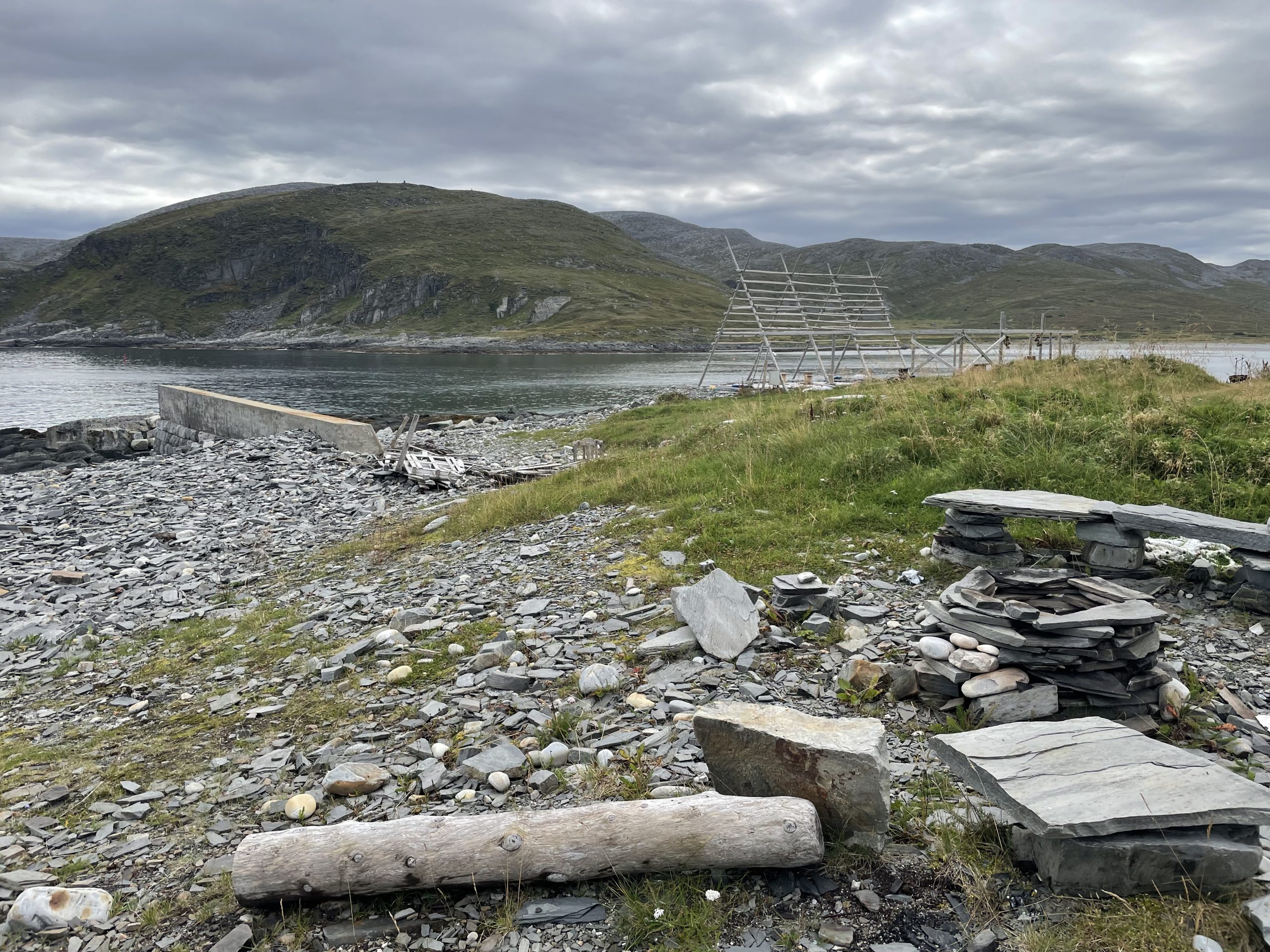 To reach the final part of the peninsula we had to drop down to sea level and cross a narrow isthmus. This low lying area is less than a km wide with two fjords reaching towards each other but not quite meeting. A memorial remembers the six fishermen who were killed by German soldiers here.