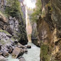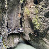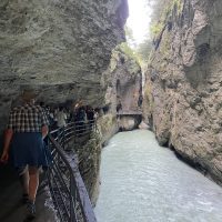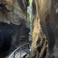 The Aare gorge follows the youthful and exuberant high mountain end of the Aare river. We had already stayed next to the wider, more sedate, downstream river when we first entered Switzerland It’s got turquoise glacial meltwaters flowing swiftly through it’s narrow channel, a winding path that provides numerous view points of the water smoothed gorge walls, high vegetation clad cliffs and pebbled beaches. Man-made boardwalks allow you to follow the route of the river and tunnels take you to windows over key vantage points.