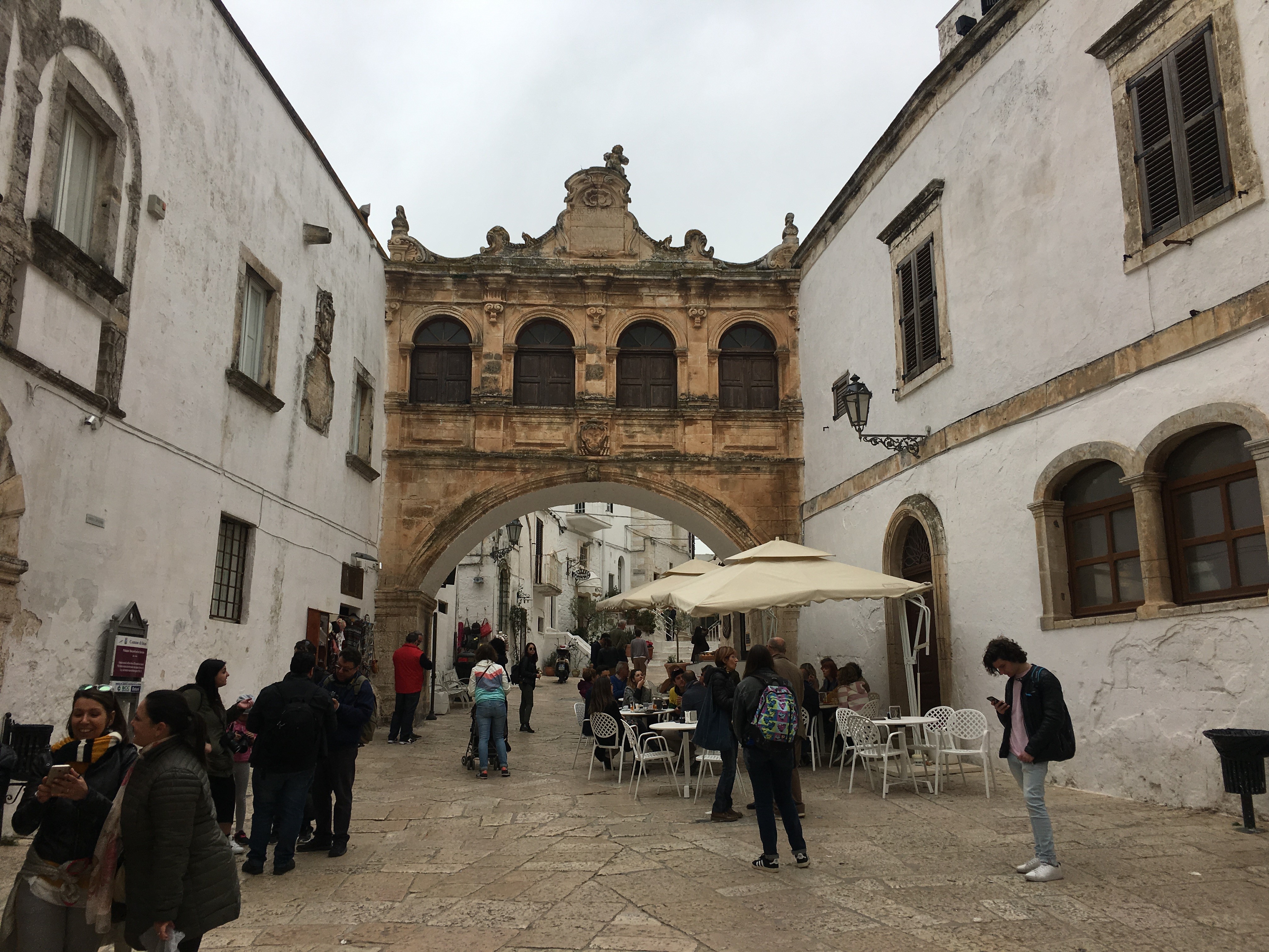The area is welcoming to Motorhomes, the towns we visited all had motorhome parking signposted on entry to the town. We started in Locorotondo, a small town with a compact circular Centro Storico. Here we turned up after following signs to a parking area only to find newly painted blue lines (meaning that the parking space not always free) with signs and ticket machines being installed as we watched. We didn’t think that anyone would be checking tickets on the first day of installation, but just to be sure we checked with the people who were setting everything up – ‘domani’ (tomorrow) was their guidance as we mimed putting money in the machine. Locorotondo was pretty, especially from a distance with it’s distinctive tower, it was also very white, unlike northern and central Italy where there seems to be an agreement that buildings should be painted earth sunset tones. Here painted white walls were interspersed with limestone grey and the occasional soft golden stone.