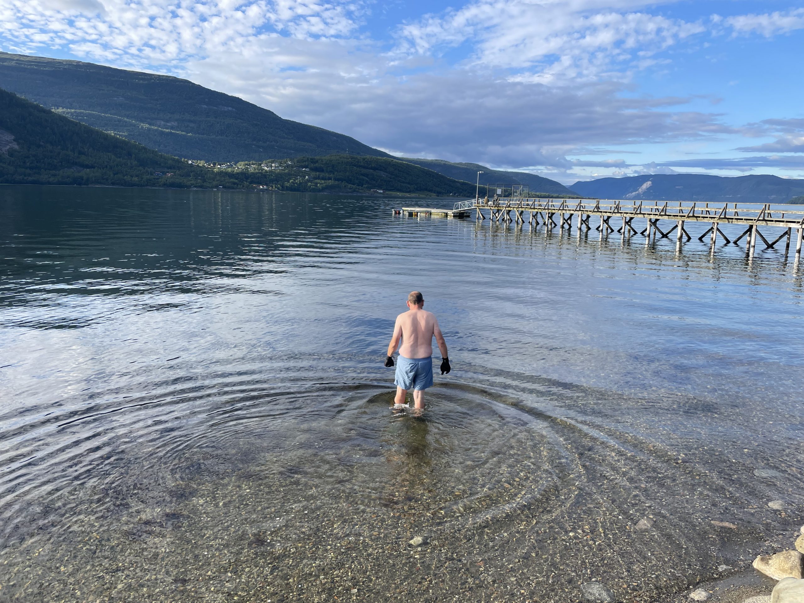 We found ourselves a spot on the edge of the fjord near the small jetty that was part of the campsite amenities. Paul immediately went to check out the fishing opportunities. The jetty and pontoon were over water deep enough to make him happy and there was even a specific hut for cleaning and gutting the fish. There were clear instructions not to drop the guts and bones back into the water for which I was grateful, I didn’t want to swim with the (dead) fishes. The campsite even rents out small boats if you want to get into deeper water.