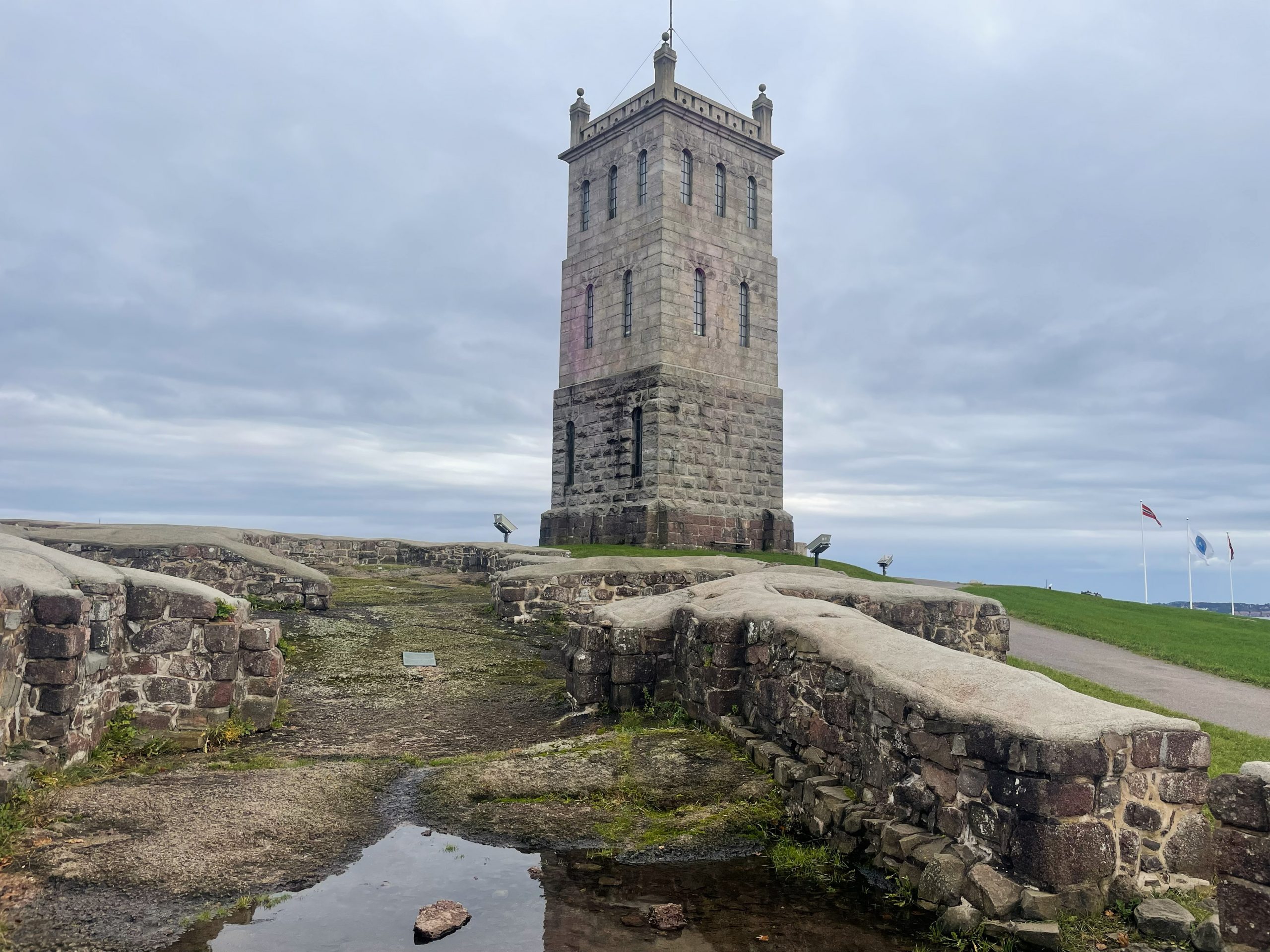 From the Marina we continued to follow the waters edge, past another nature reserve until we could finally head uphill towards the very prominent feature of Slottsfjell Tower. The tower was built in 1888 as a landmark and memorial to the medieval fort that once stood on this bluff that overlooks Tønsberg. It’s a much meddled with site, but you can get an idea of the scale of it when you walk around the restored walls.