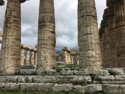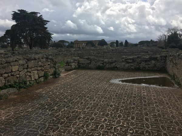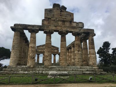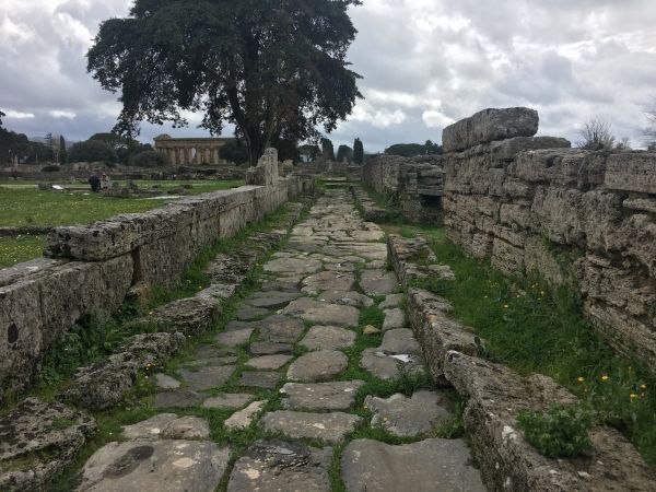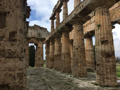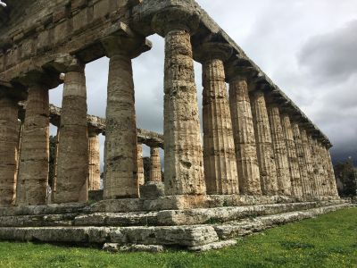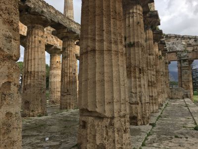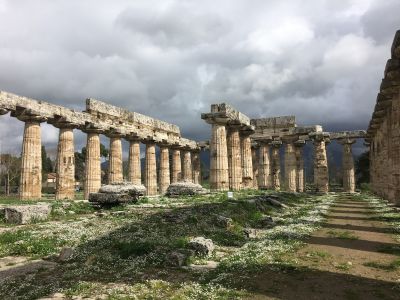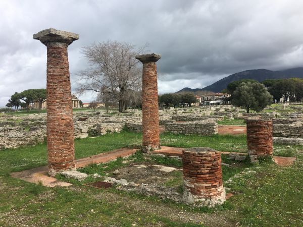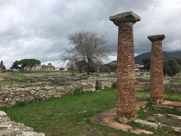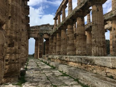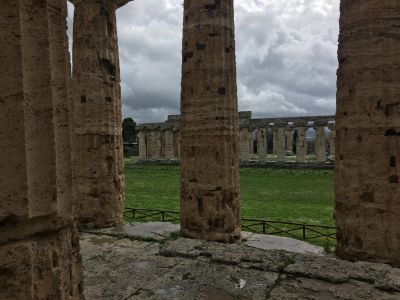 So we settled into a nice parking spot in the attended car park and made our way to the ruins of Paestum. This site was established as part of ‘Magna Graecia’, the name given to the Greek settlements that covered much of southern Italy between the 8th and 3rd centuries BC. Originally it was called Poseidonia, after the Greek god of the sea, but was re-named when the Romans took control. Despite the fact that it became a Roman city it still has a significantly Greek feeling, not least because of the three impressive temples whose stout pillars still stand. The Roman empire was very good at appropriating and re-using the best bits of the cultures they conquered.