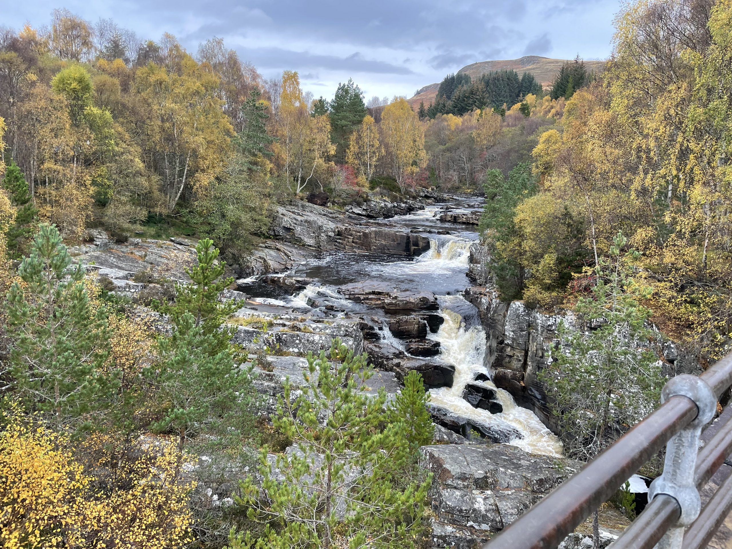 From Rogie Falls car park a couple of walks were marked. So after lunch we picked the longer ‘Riverside Trail’ which was a very easy 1.5km. It was a pleasant short walk up through the forest to a small rocky crag and then alongside the river to a bridge over the Black Water. Signs said that salmon were often seem leaping here but we were sure that we were too late to see anything. We stood on the bridge watching the waterfalls when Paul said “I think I saw something”. Out of the corner of his eye, not in the falls, but in the nearby salmon ladder, he had seen a flash. We switched our attention and I started filming. We must have seen about a dozen fish of varying sizes trying to climb the ladder. Including one which bounced off the rock and was thrown back down to the pool below. You can see the video on our Instagram and Facebook feeds.