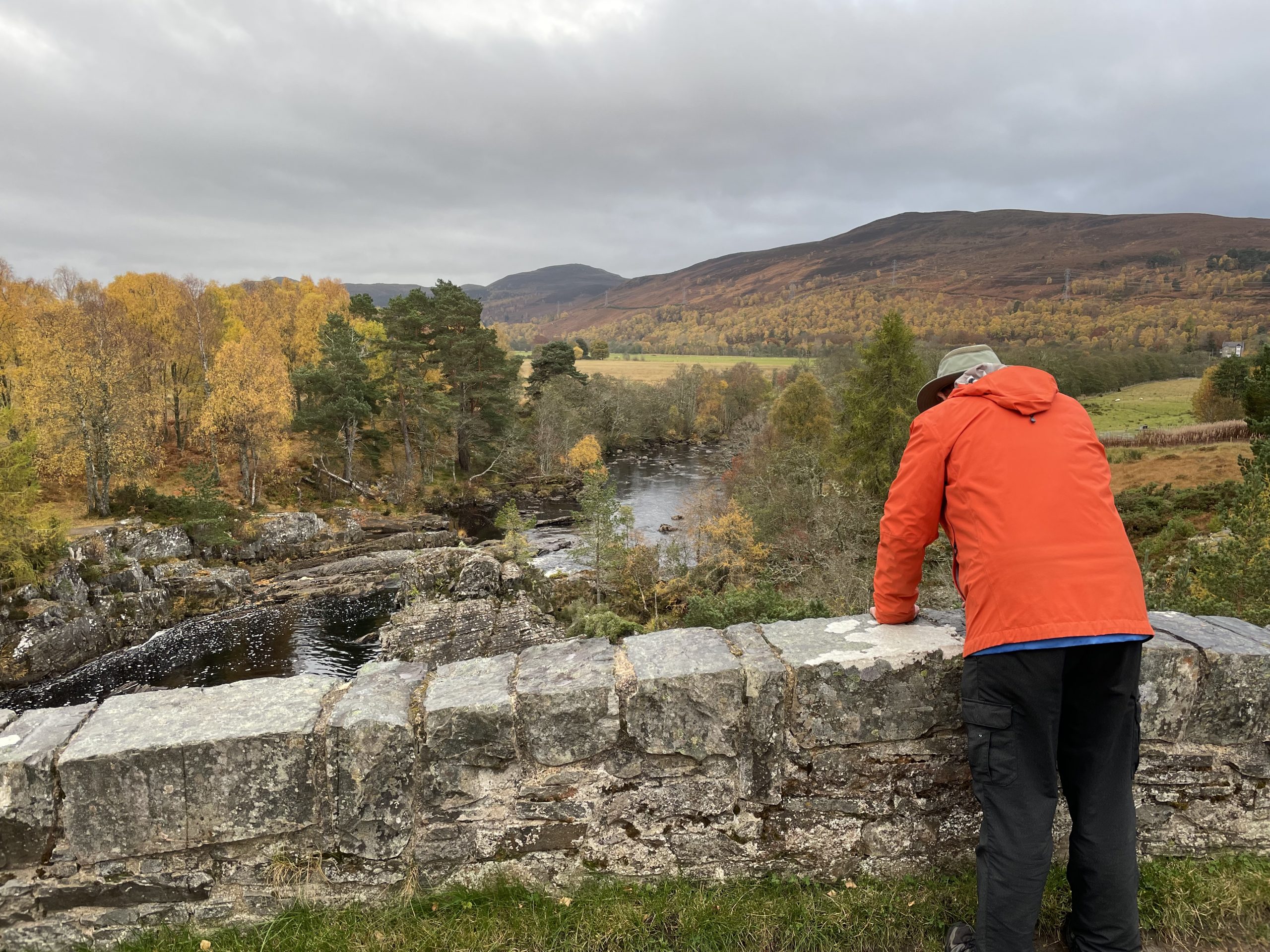 We followed the river from a path high above it’s bank with good distant views of hills and the russet and green mix of the autumn forest. At Little Garve a slightly older bridge allowed us to cross the river again. This bridge was built as part of a programme of military road building in the 18th century, known as General Wade’s Roads’. The road building was prompted by the Jacobite rebellion, linking us neatly back to our visit to Culloden.