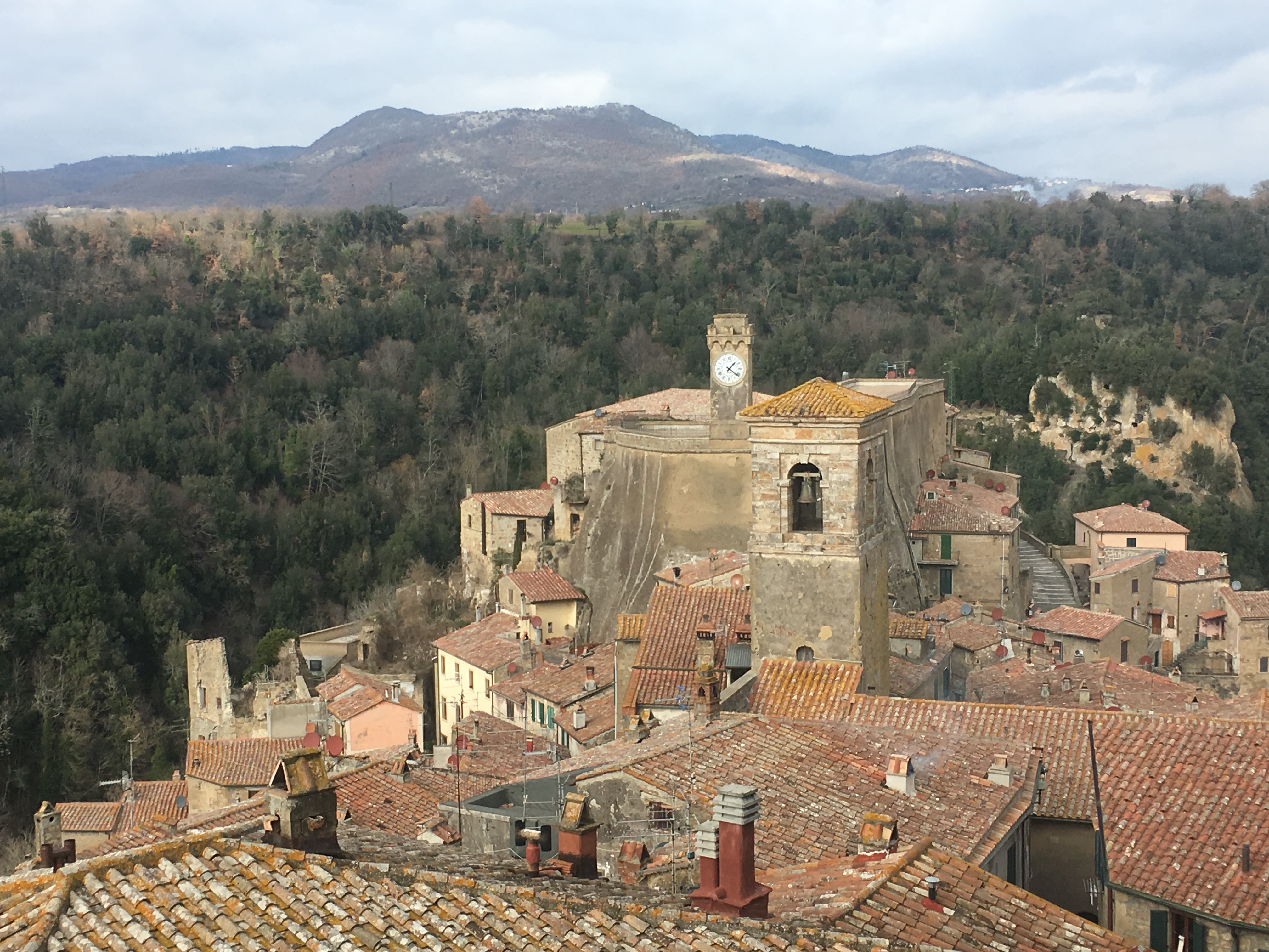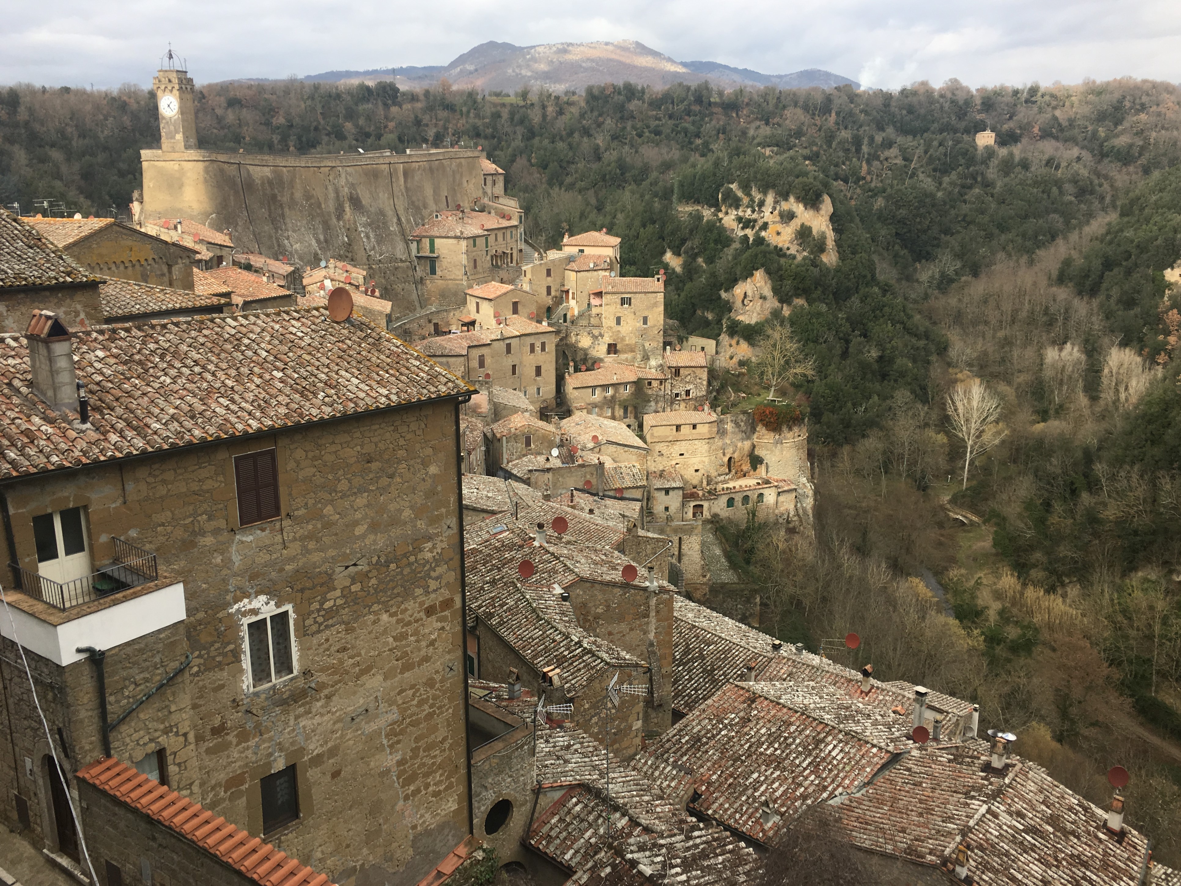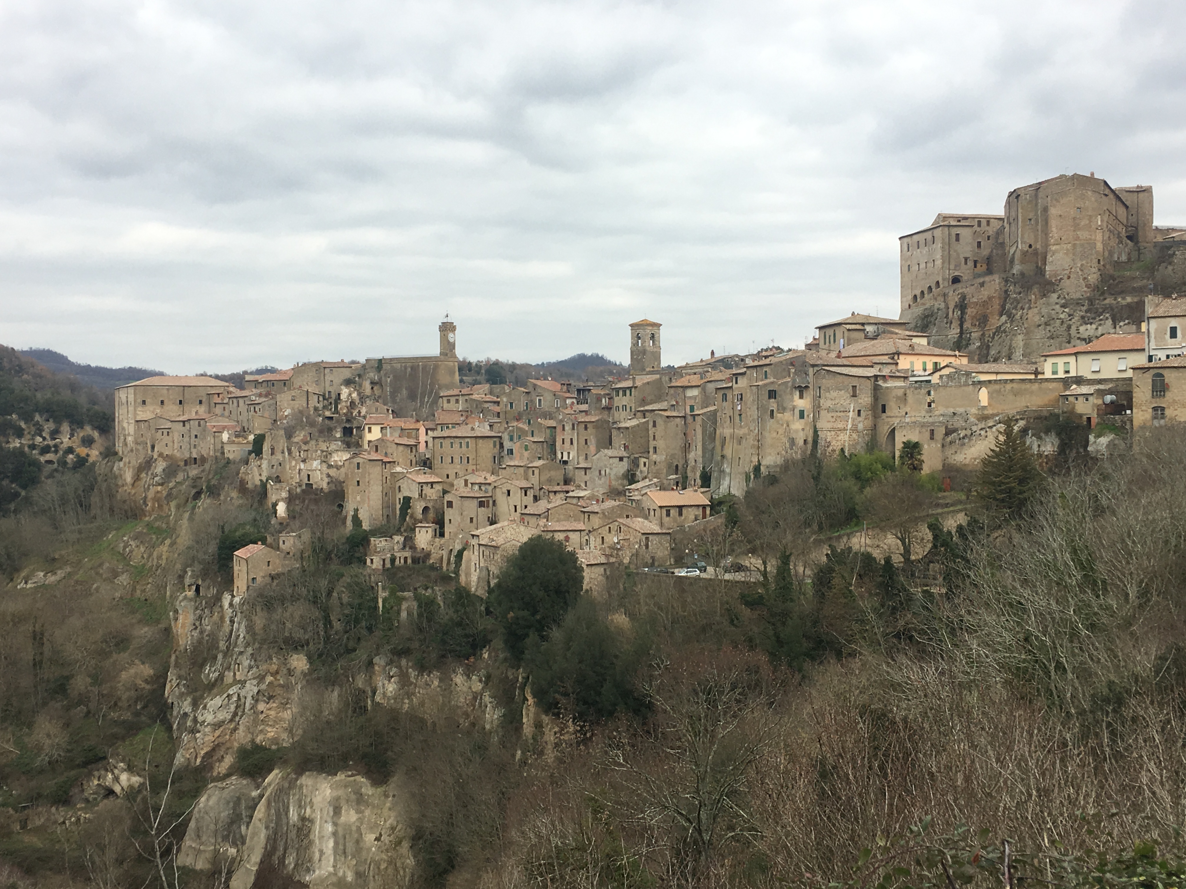 As we drove south through Tuscany the land slowly flattened out. From the steep sided closely packed hills of the north we ventured through lower hills and wider shallower valleys until it seemed almost flat. But appearances can be deceiving, we were still a couple of hundred meters above sea level, and as we approached Sorano we rounded a bend in the road to see a town perched on a clifftop above a dark forested river valley cutting through the land.