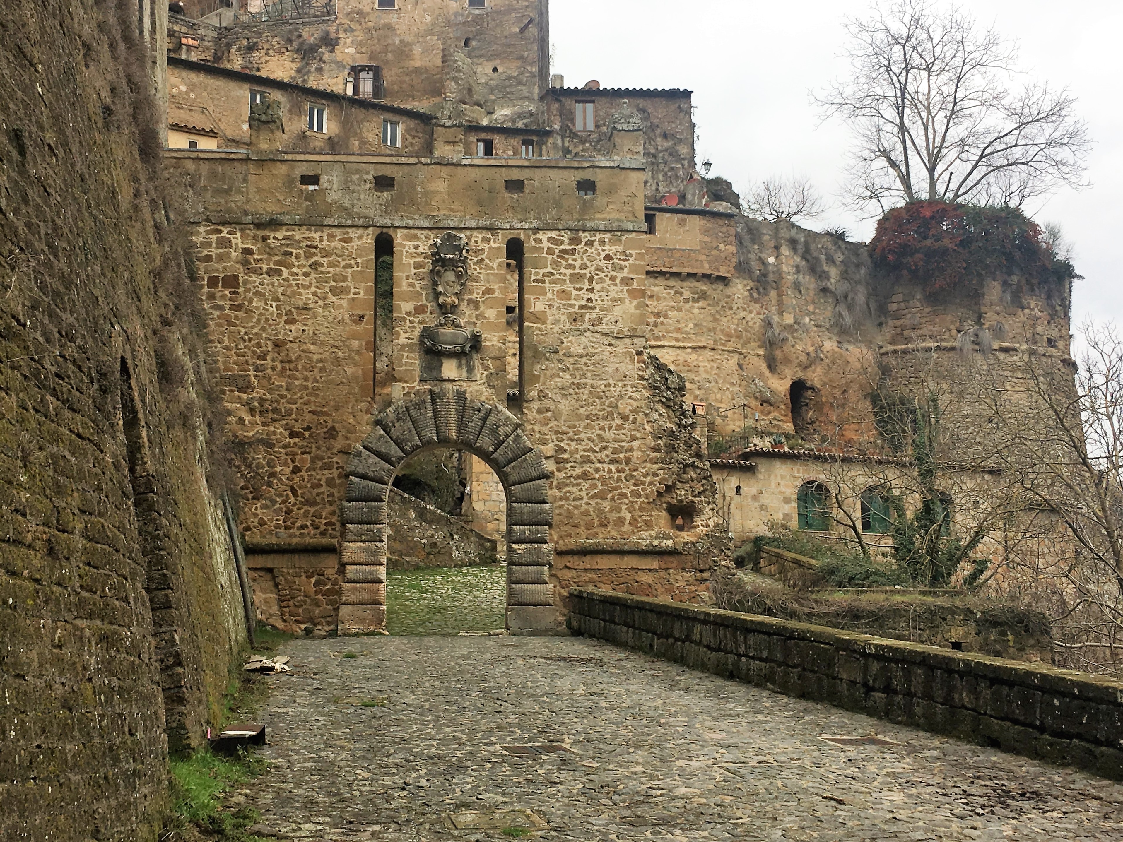 Of the three towns we randomly chose to visit Sorano, like the other towns it had been established by the Etruscans and although their legacy isn’t visible in the town it can be found in the surrounding area. We parked up by the Orsini fortress which dominates the top part of the town. It wasn’t open to visitors but we were still able to walk through it’s courtyard and see the view down towards the medieval buildings of the town below. We wandered down through the narrow streets, down mossy steps and cobbled slopes. It felt like walking through a ghost town, doors and shutters were pinned closed and we could only hear our footsteps. When we tried to get to the viewpoint of Masso Leopoldino the gate was firmly padlocked, it didn’t matter though as there were plenty of other viewpoints through the town.