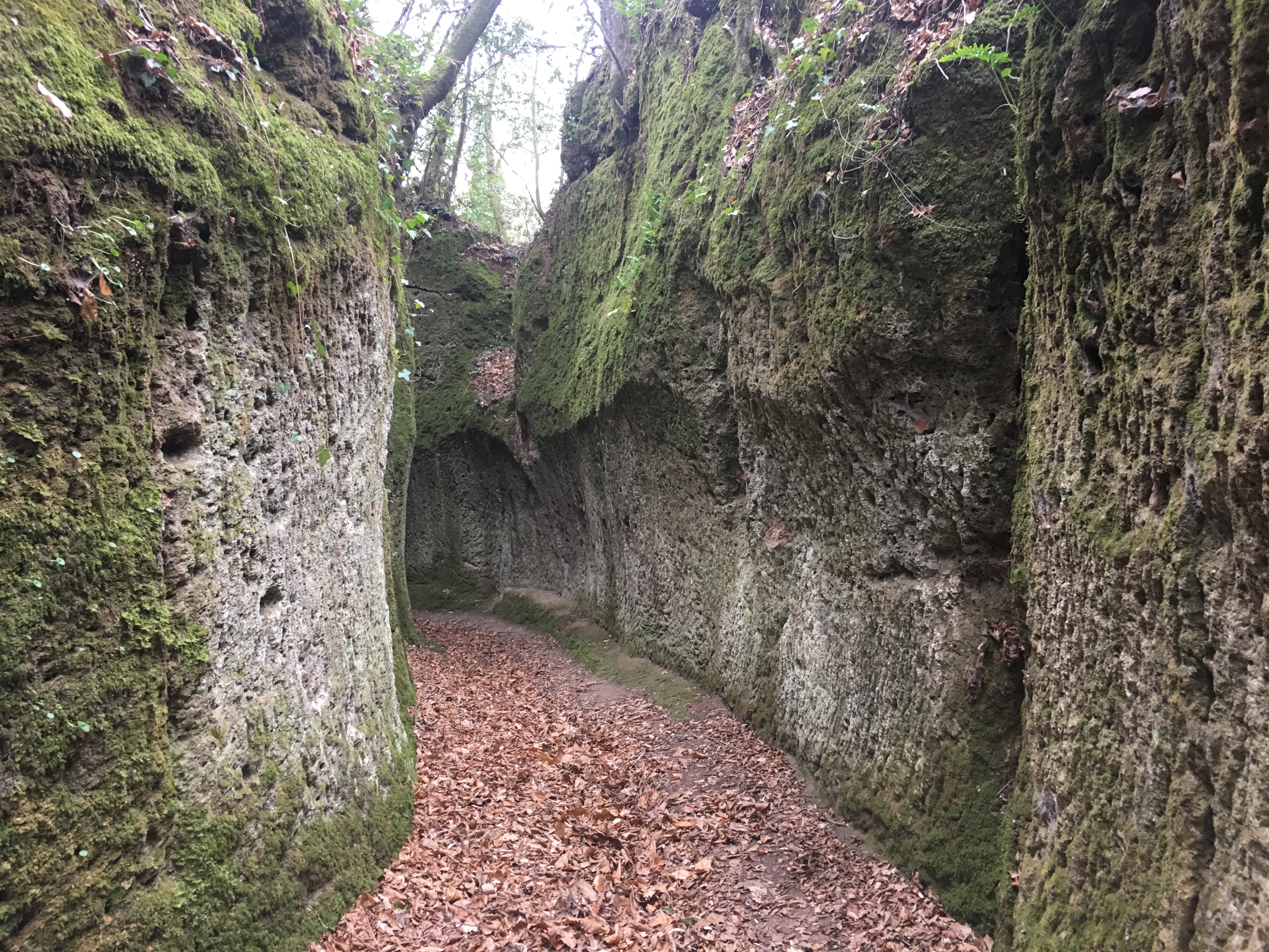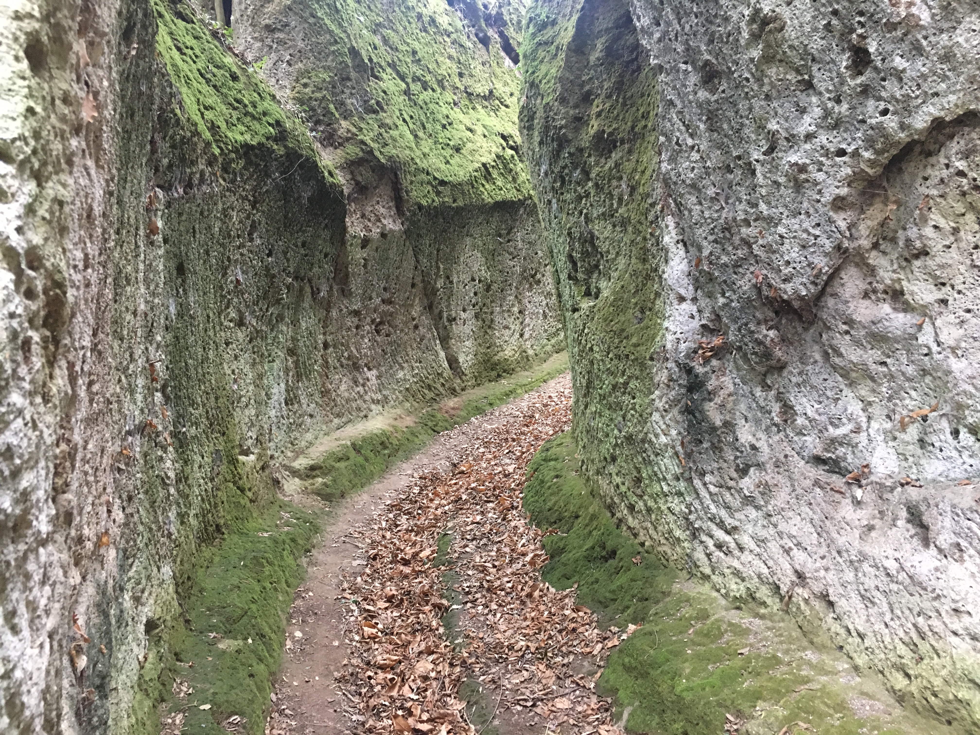 After a few wrong turns we found the Porta di Rocco on the lower eastern side of the town and we could escape the buildings and descend to the river below. This was what we had really come to the area to see. Down here are ancient pathways deeply carved into the rock – the Vie Cave – it’s thought they are Etruscan in origin, but no one knows why they were cut so deeply into the rock. They link together the towns of Sorano, Sovana and Pitigliano – we didn’t go that far but allowed ourselves to get lost and turned around exploring the three main pathways that spread out from Sorano. There was something eerie about being between the confines of the pathway walls, the ghostly feeling enhanced by the rock cut caves and burial chambers that could be found in the surroundings.